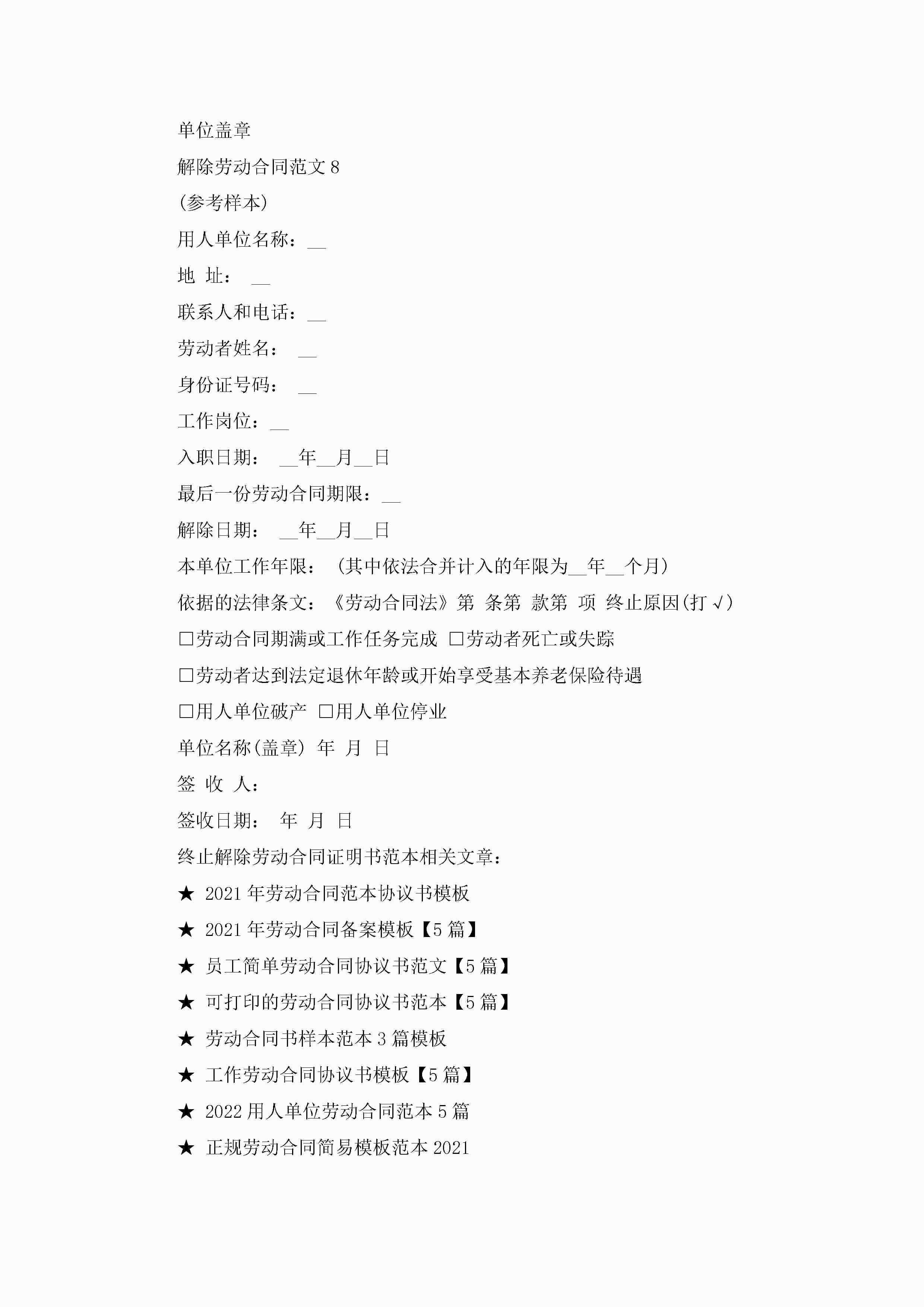终止解除劳动合同证明书范本8篇范文jugei3月22日 16:23发布关注211 终止解除劳动合同证明书范本8篇范文此内容为付费资源,请付费后查看¥10.9 单篇文档限时特惠¥15个人会员开通企业会员开通立即下载无需登陆!可直接快捷下载单个模板付费资源© 版权声明THE ENDWord模板# 实用文档# 实用模板# 信函模板# 证明书 如有问题,可点击最底部“联系我们”联系客服 分享QQ空间微博QQ好友海报分享复制链接收藏