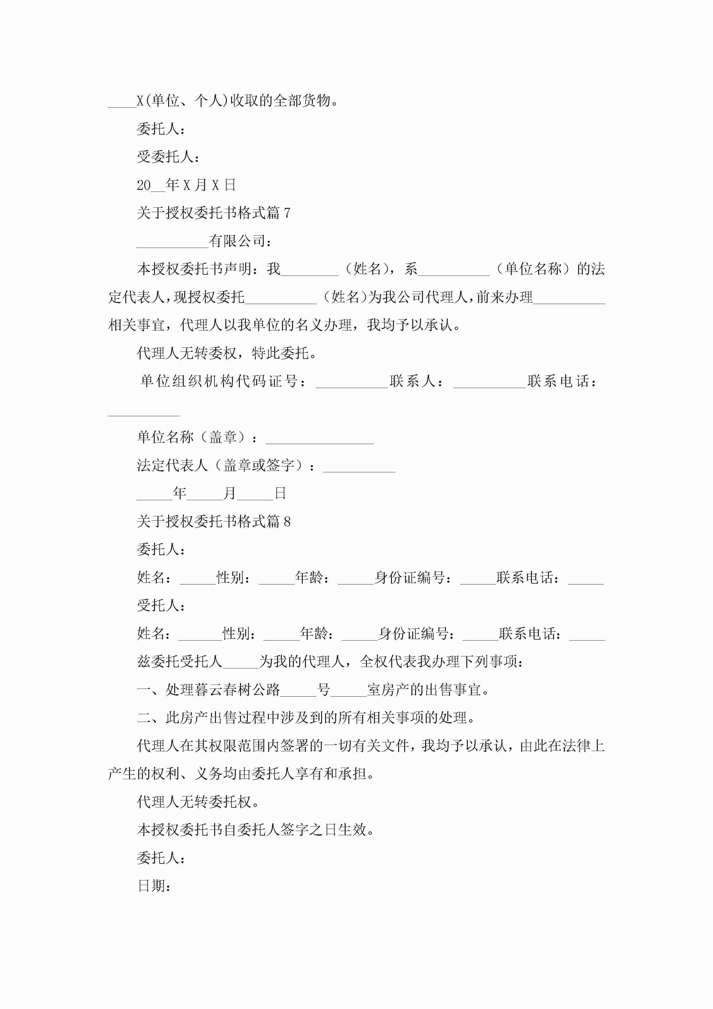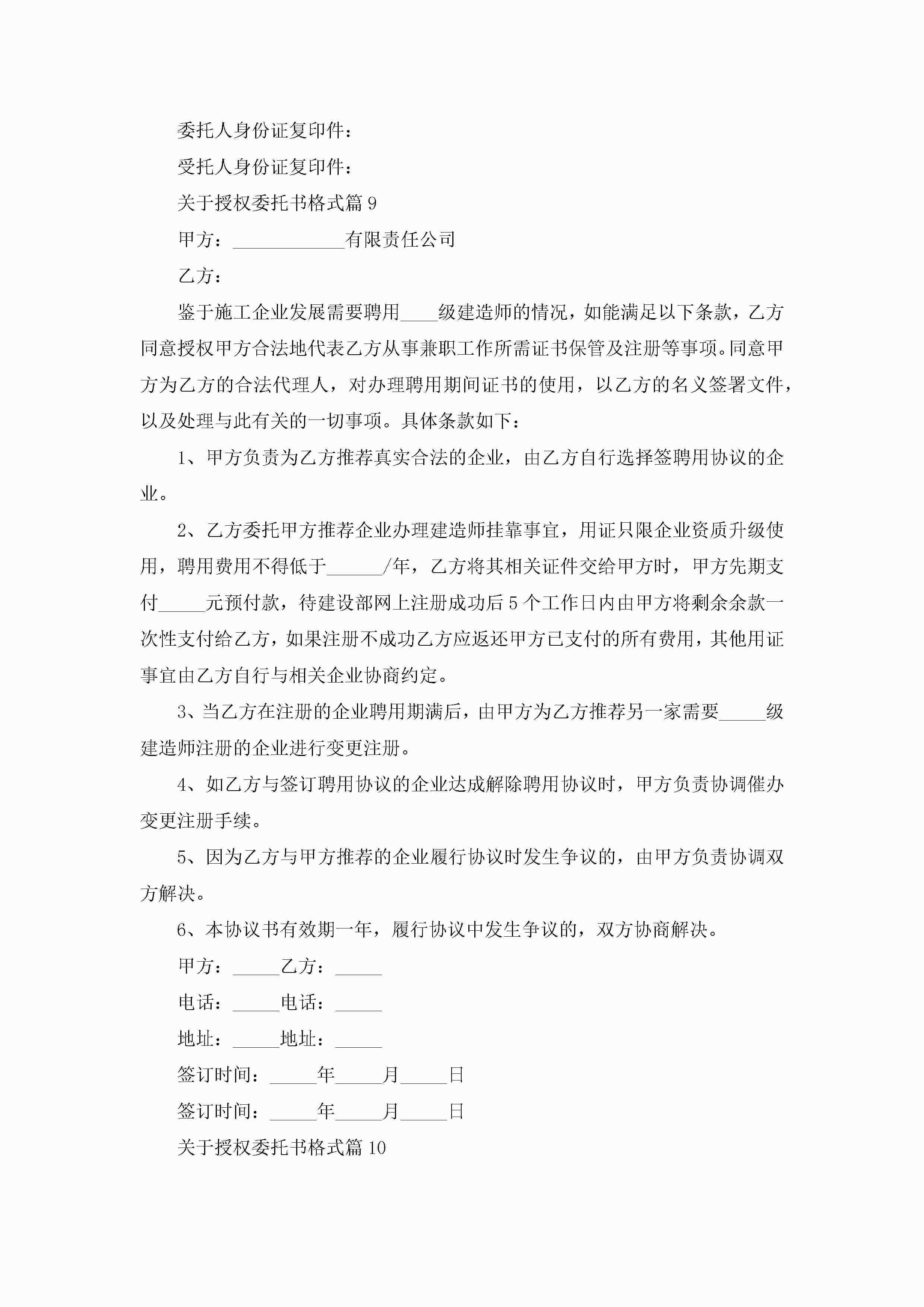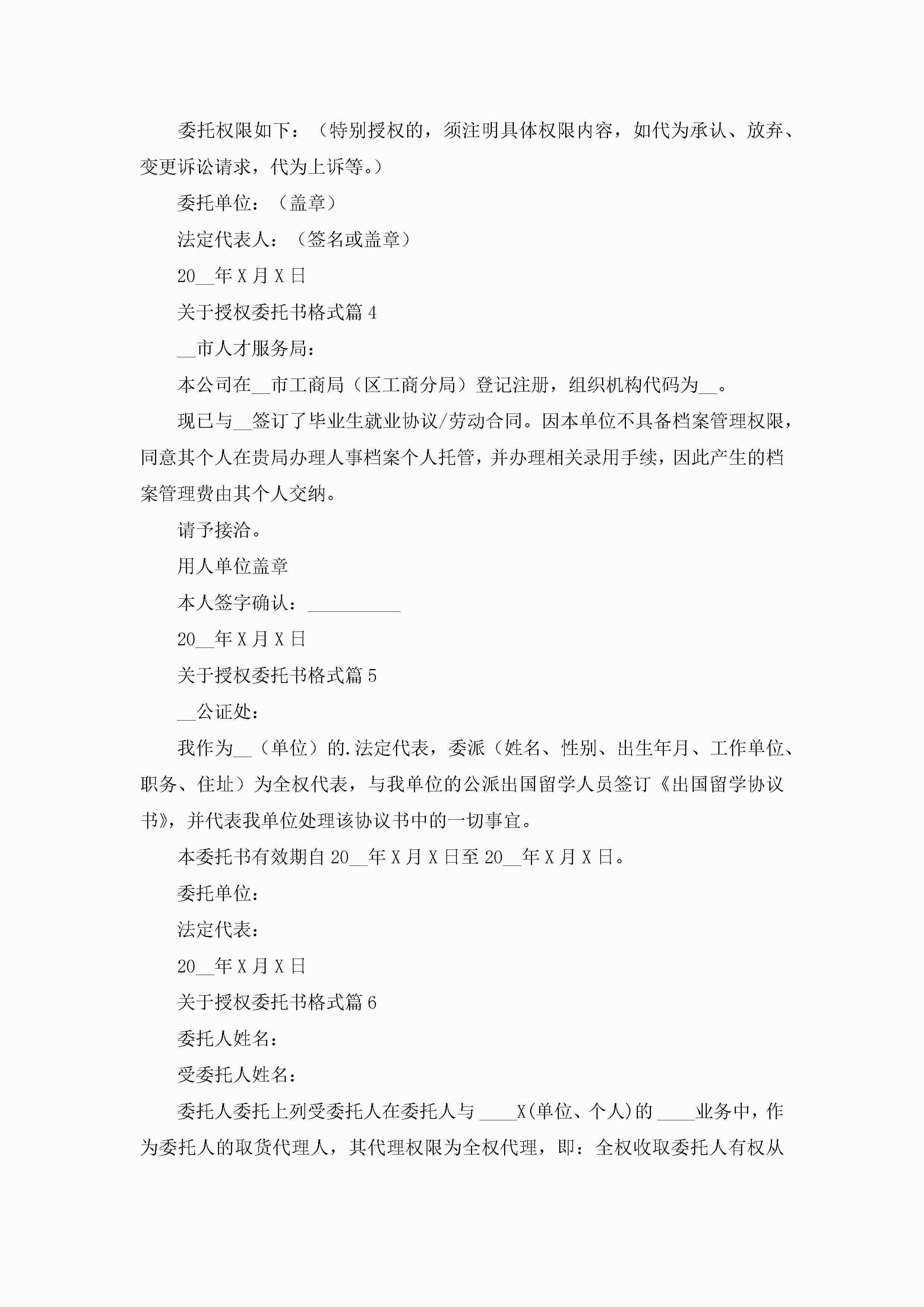 关于授权委托书格式(精选10篇)jugei3月22日 16:23发布关注226 关于授权委托书格式(精选10篇)此内容为付费资源,请付费后查看¥10.9 单篇文档限时特惠¥15个人会员开通企业会员开通立即下载无需登陆!可直接快捷下载单个模板付费资源© 版权声明THE ENDWord模板# 实用文档# 实用模板# 信函模板# 委托书 如有问题,可点击最底部“联系我们”联系客服 分享QQ空间微博QQ好友海报分享复制链接收藏