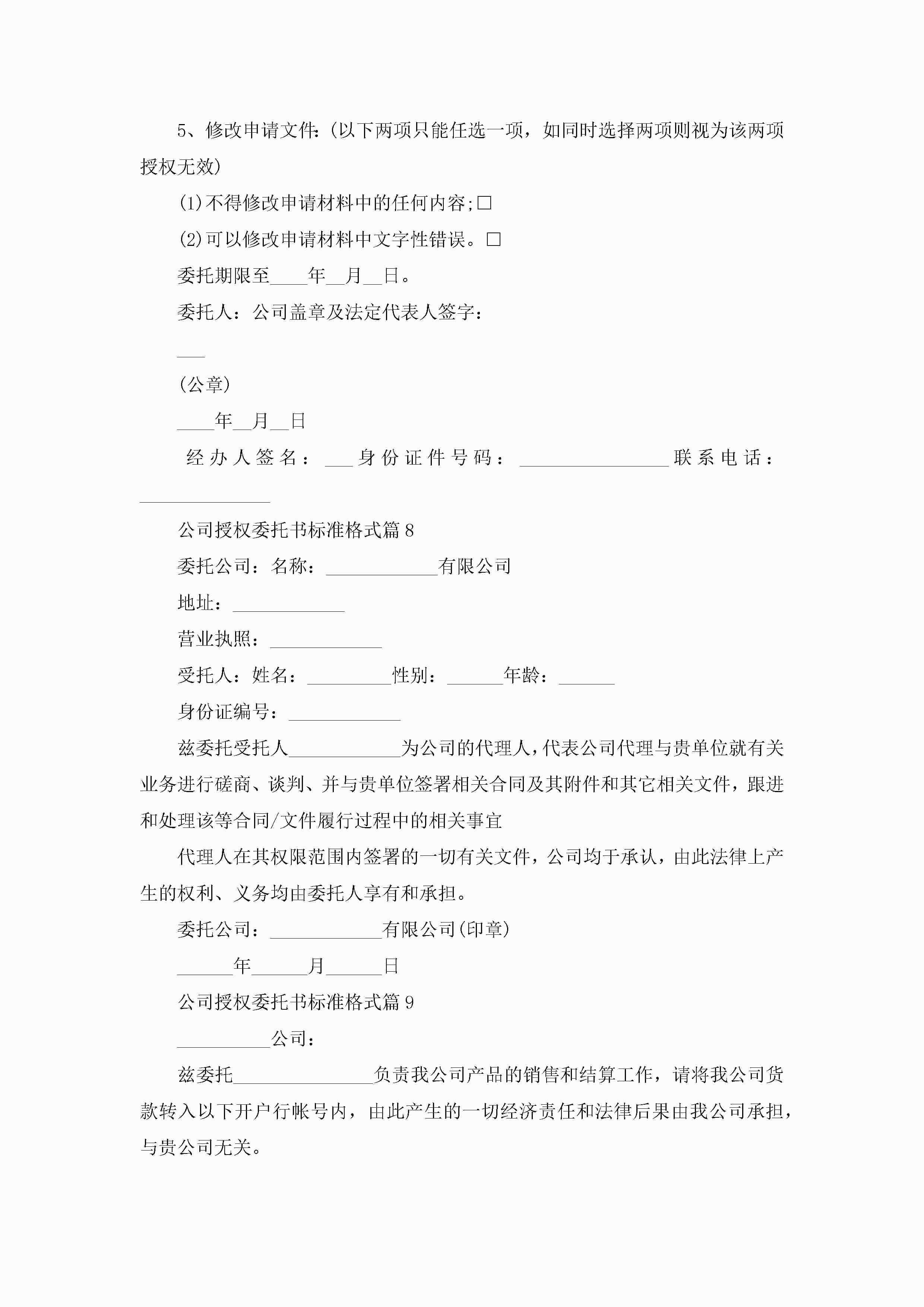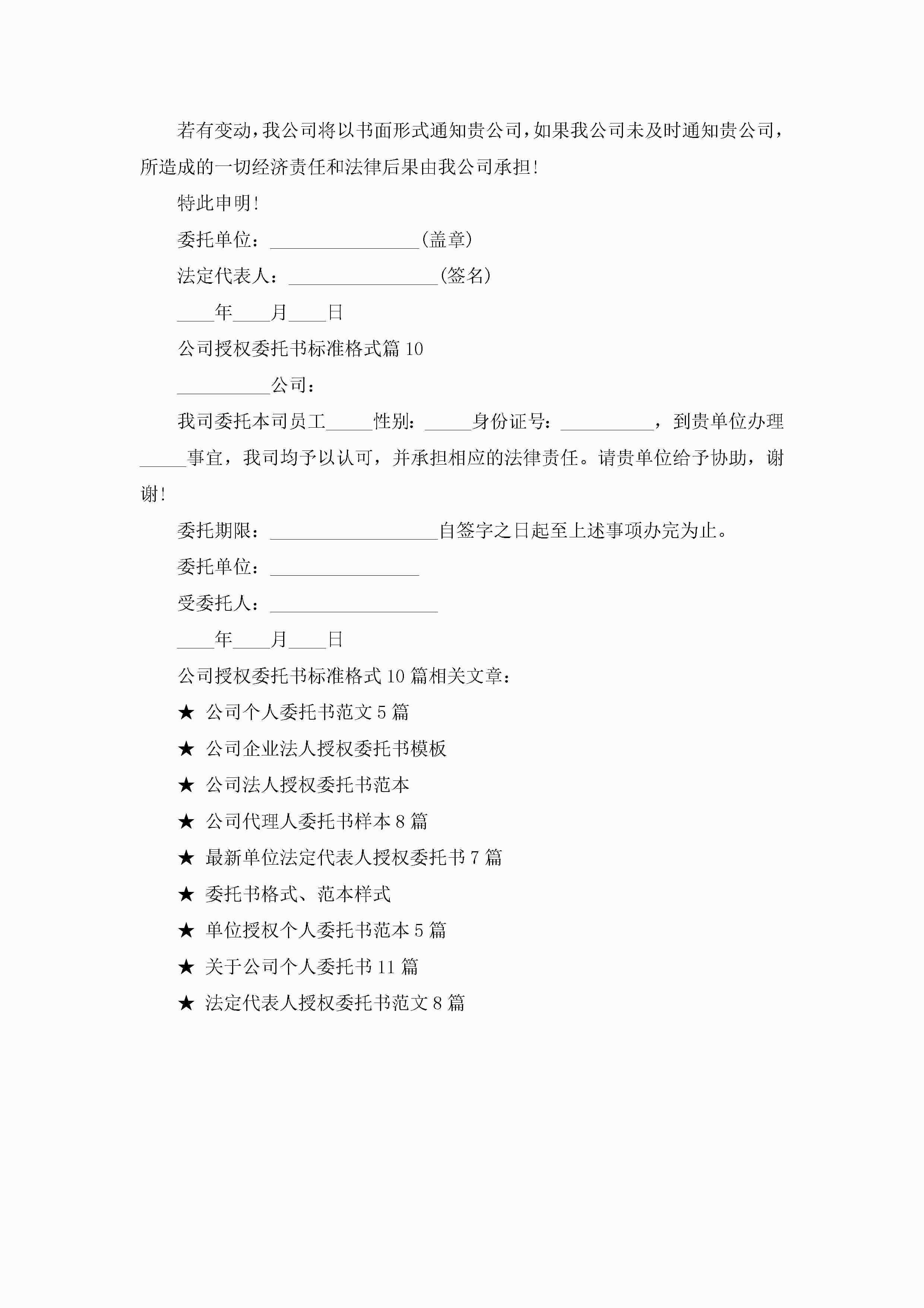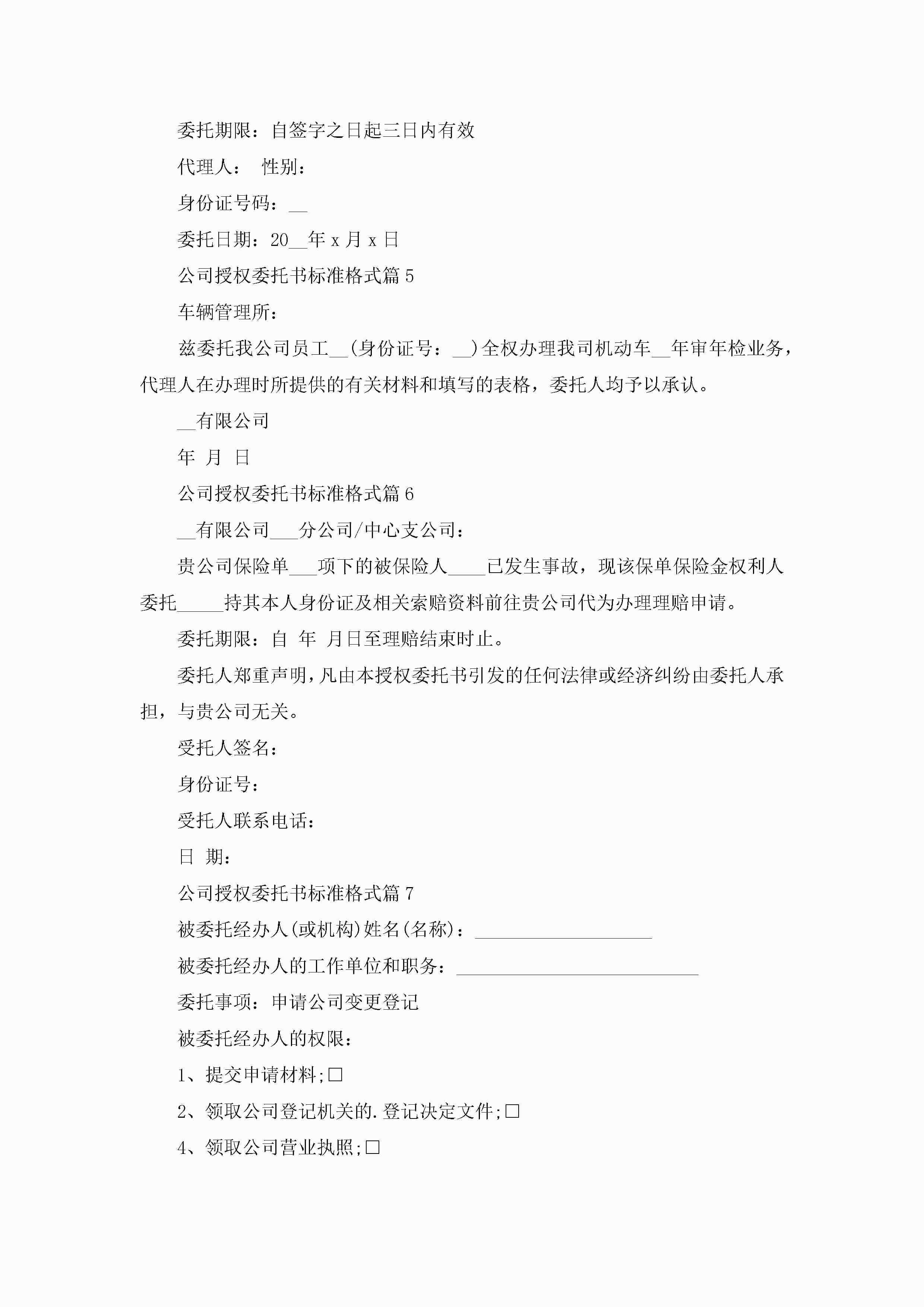 公司授权委托书标准格式范文10篇jugei3月22日 16:23发布关注281 公司授权委托书标准格式范文10篇此内容为付费资源,请付费后查看¥10.9 单篇文档限时特惠¥15个人会员开通企业会员开通立即下载无需登陆!可直接快捷下载单个模板付费资源© 版权声明THE ENDWord模板# 实用文档# 信函模板# 委托书# 公司授权委托书标准格式10篇 如有问题,可点击最底部“联系我们”联系客服 分享QQ空间微博QQ好友海报分享复制链接收藏