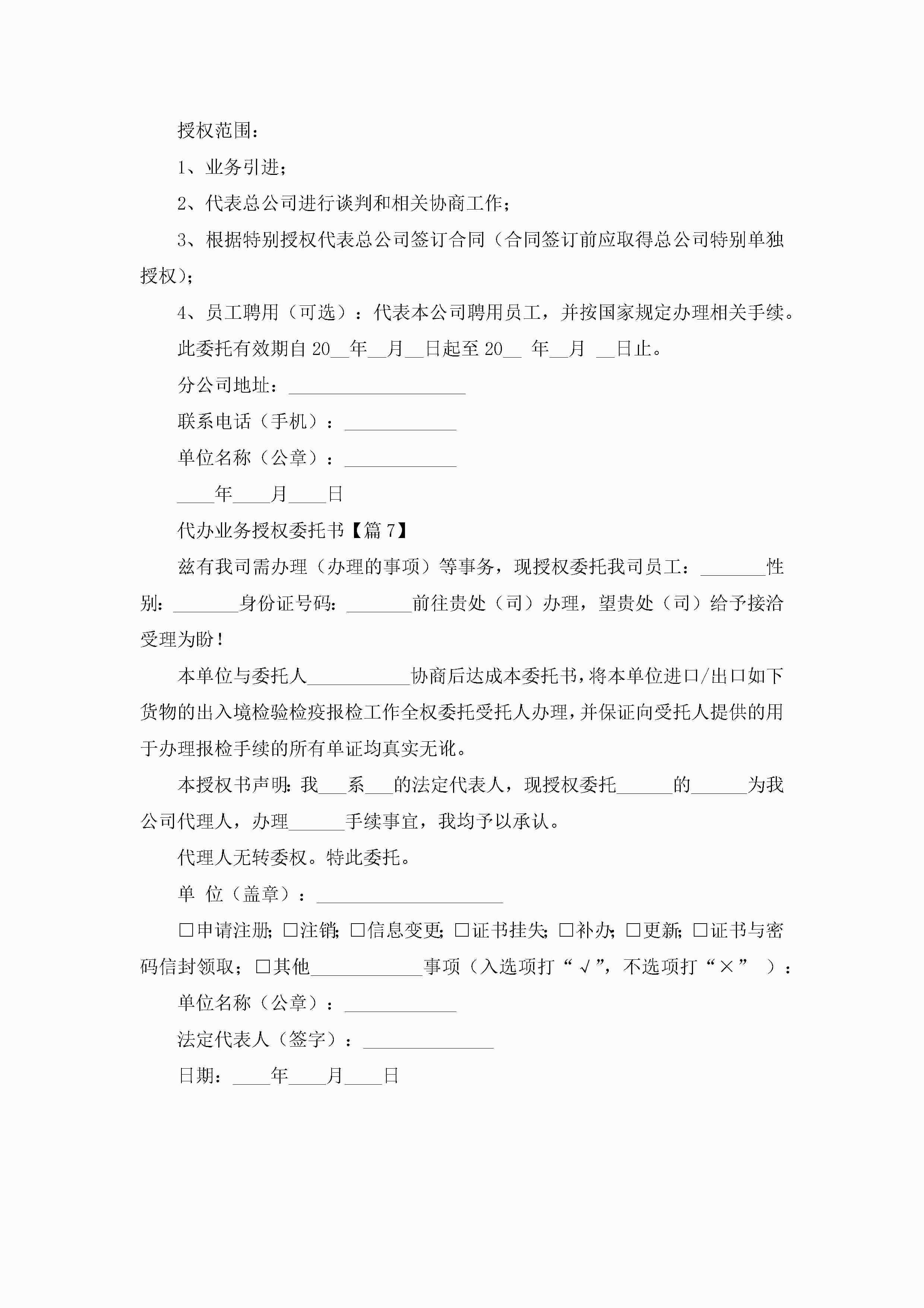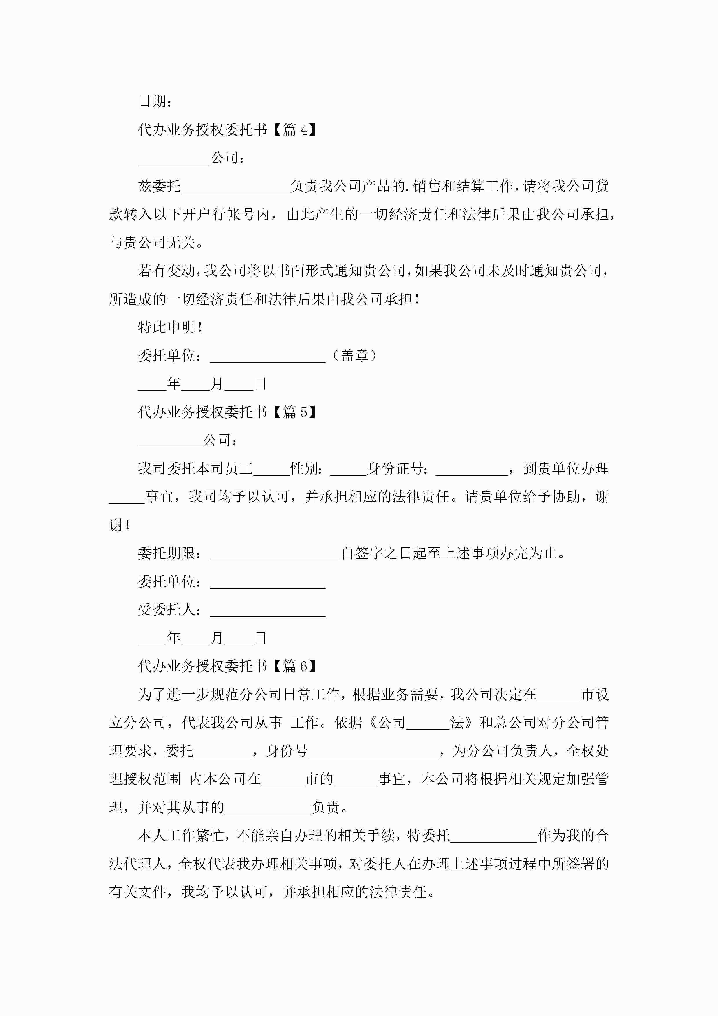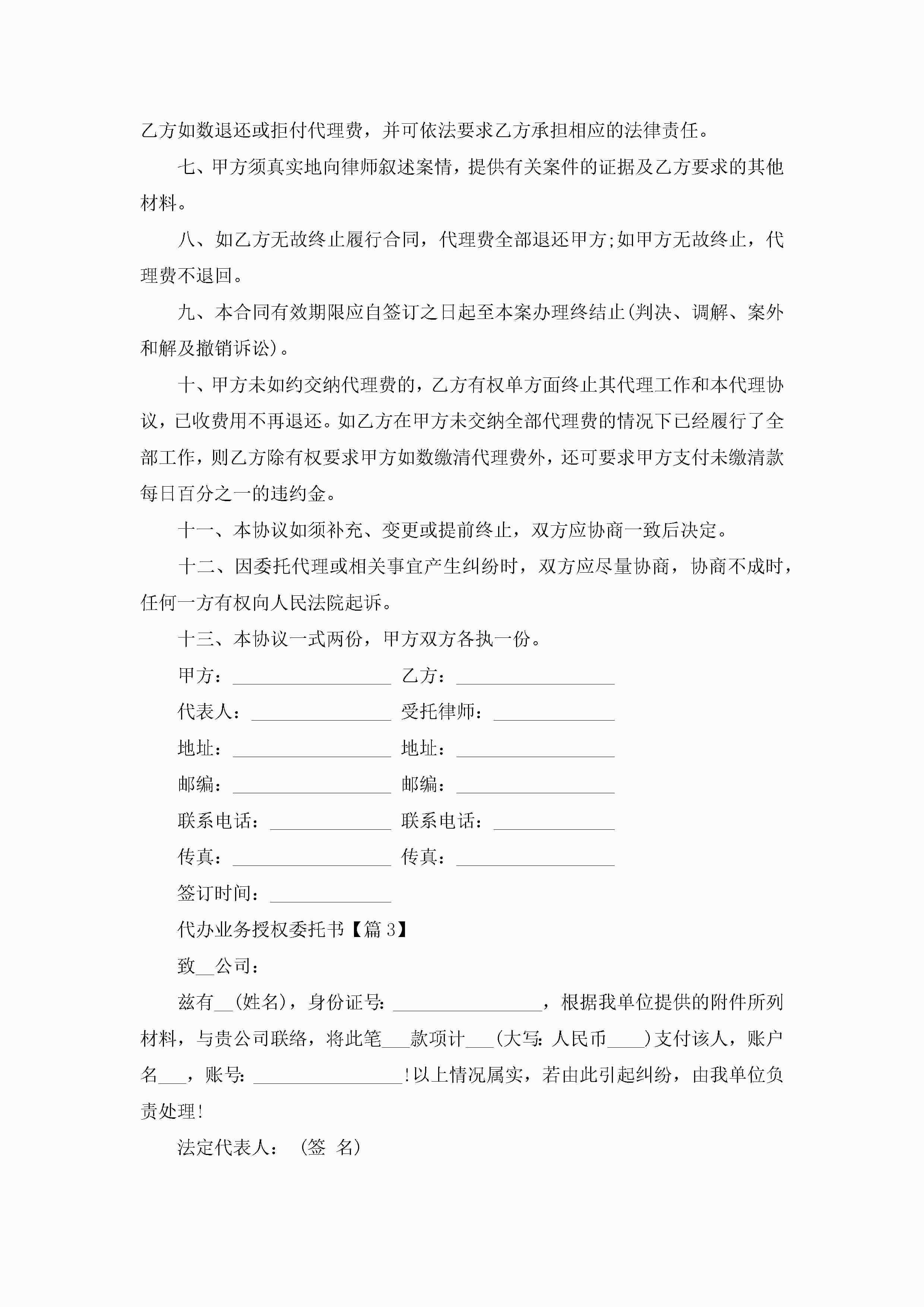 代办业务授权委托书【优秀7篇】jugei3月22日 16:23发布关注286 代办业务授权委托书【优秀7篇】此内容为付费资源,请付费后查看¥10.9 单篇文档限时特惠¥15个人会员开通企业会员开通立即下载无需登陆!可直接快捷下载单个模板付费资源© 版权声明THE ENDWord模板# 实用文档# 实用模板# 信函模板# 委托书 如有问题,可点击最底部“联系我们”联系客服 分享QQ空间微博QQ好友海报分享复制链接收藏