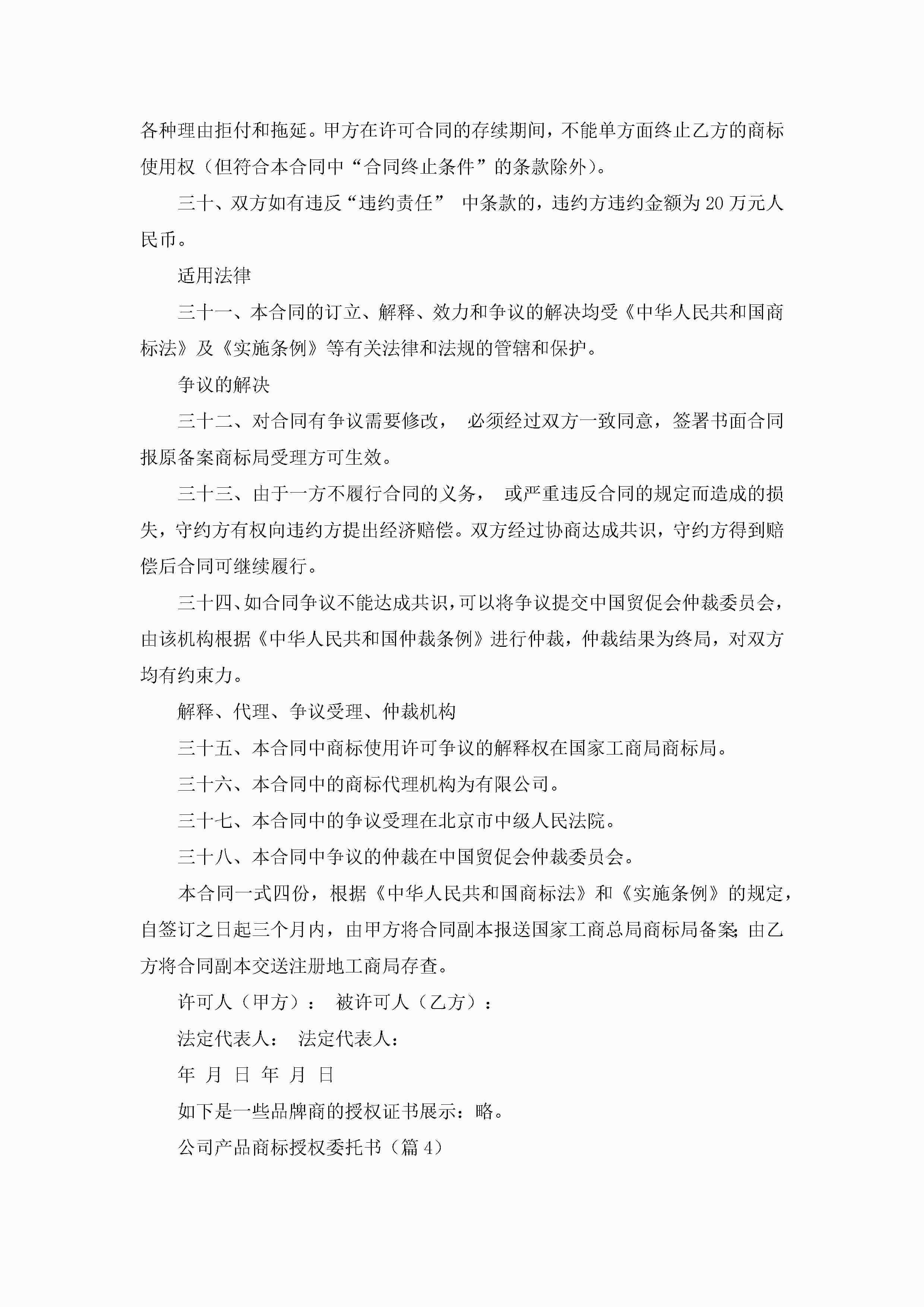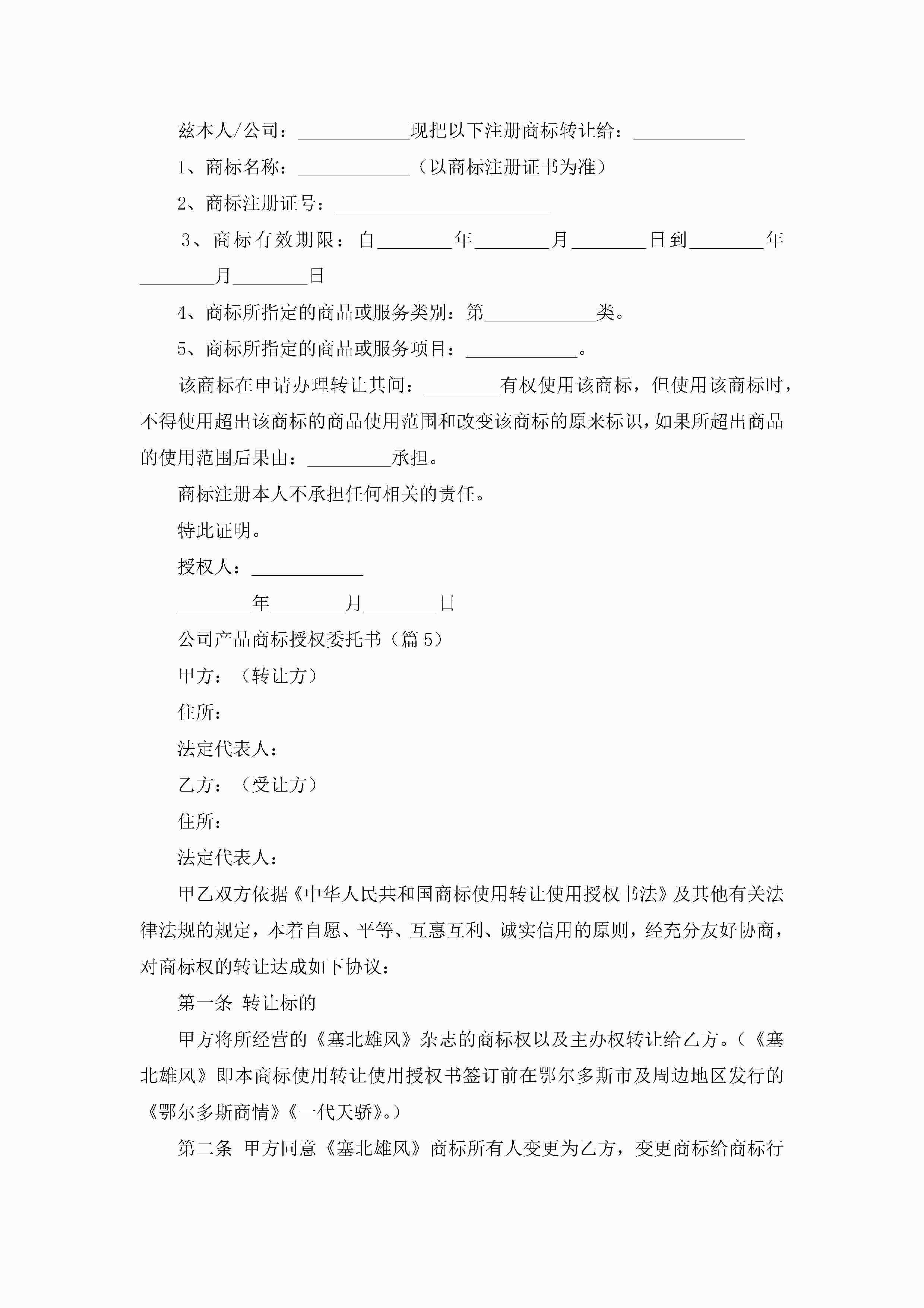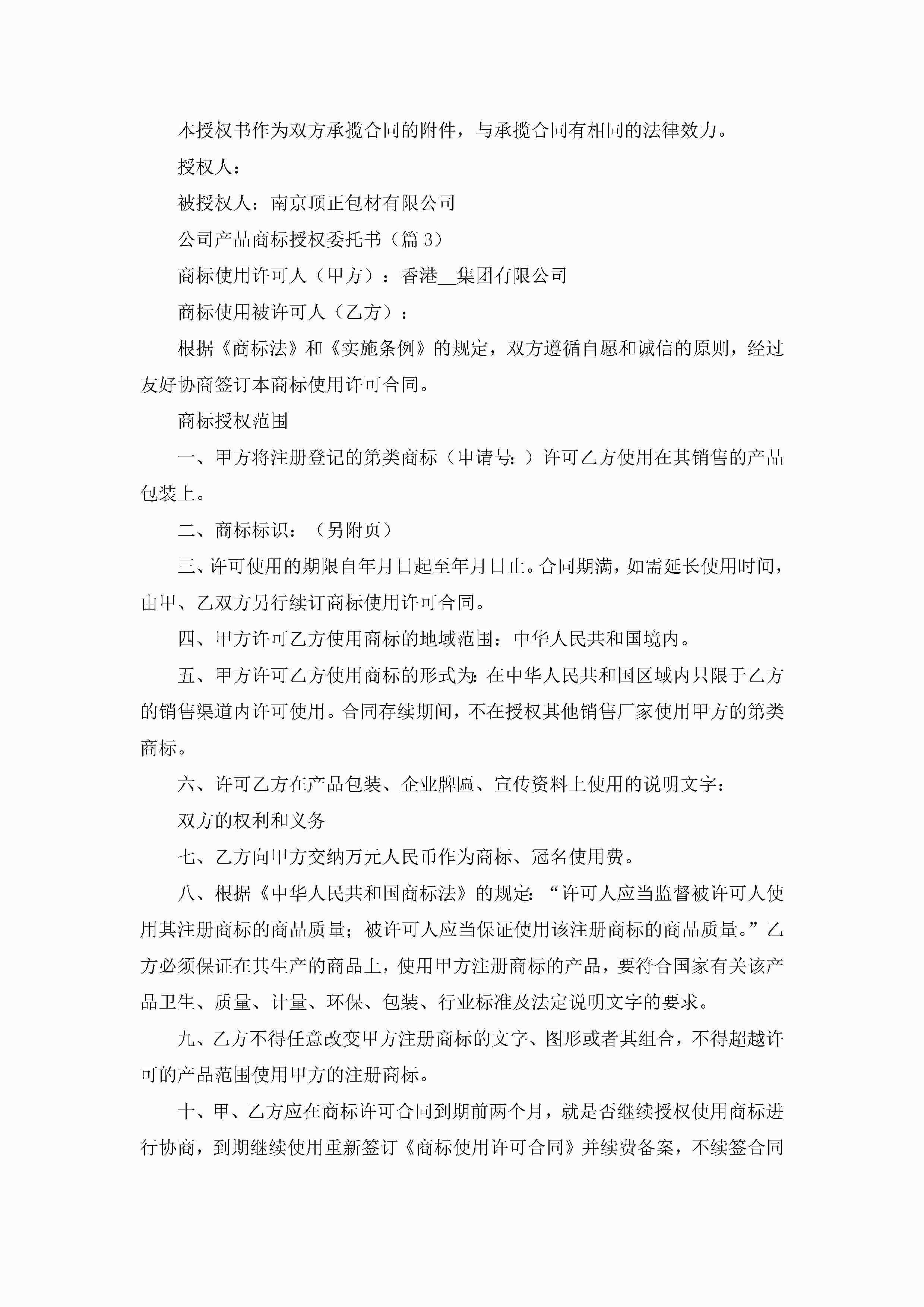 最新公司产品商标授权委托书(精选8篇)jugei3月22日 16:23发布关注310 最新公司产品商标授权委托书(精选8篇)此内容为付费资源,请付费后查看¥10.9 单篇文档限时特惠¥15个人会员开通企业会员开通立即下载无需登陆!可直接快捷下载单个模板付费资源© 版权声明THE ENDWord模板# 实用文档# 实用模板# 信函模板# 委托书 如有问题,可点击最底部“联系我们”联系客服 分享QQ空间微博QQ好友海报分享复制链接收藏