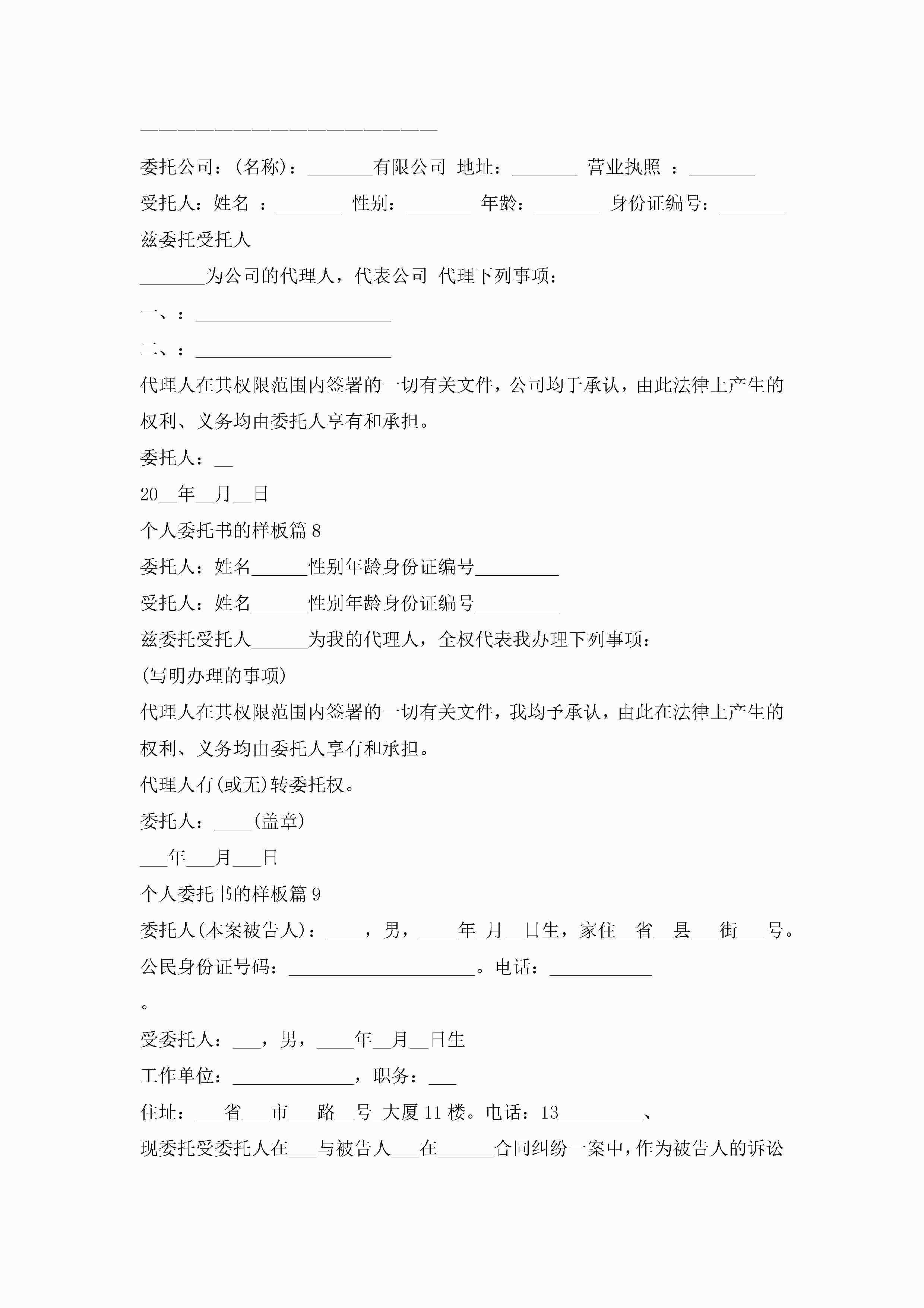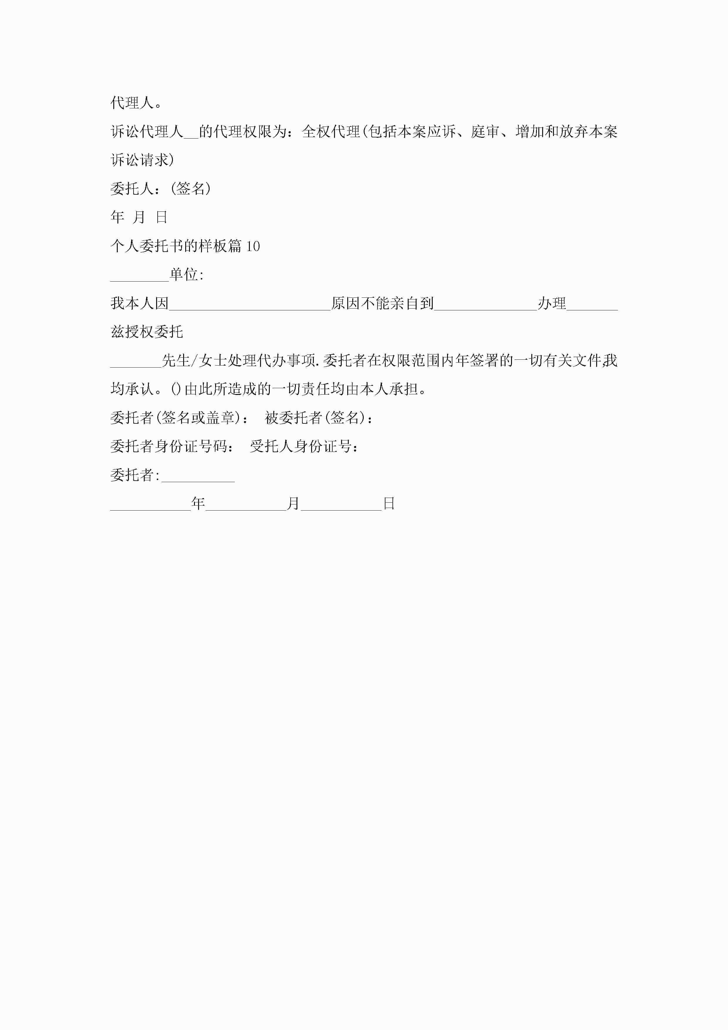 个人委托书的样板(精选10篇)jugei3月22日 16:23发布关注287 个人委托书的样板(精选10篇)此内容为付费资源,请付费后查看¥10.9 单篇文档限时特惠¥15个人会员开通企业会员开通立即下载无需登陆!可直接快捷下载单个模板付费资源© 版权声明THE ENDWord模板# 实用文档# 实用模板# 信函模板# 委托书 如有问题,可点击最底部“联系我们”联系客服 分享QQ空间微博QQ好友海报分享复制链接收藏