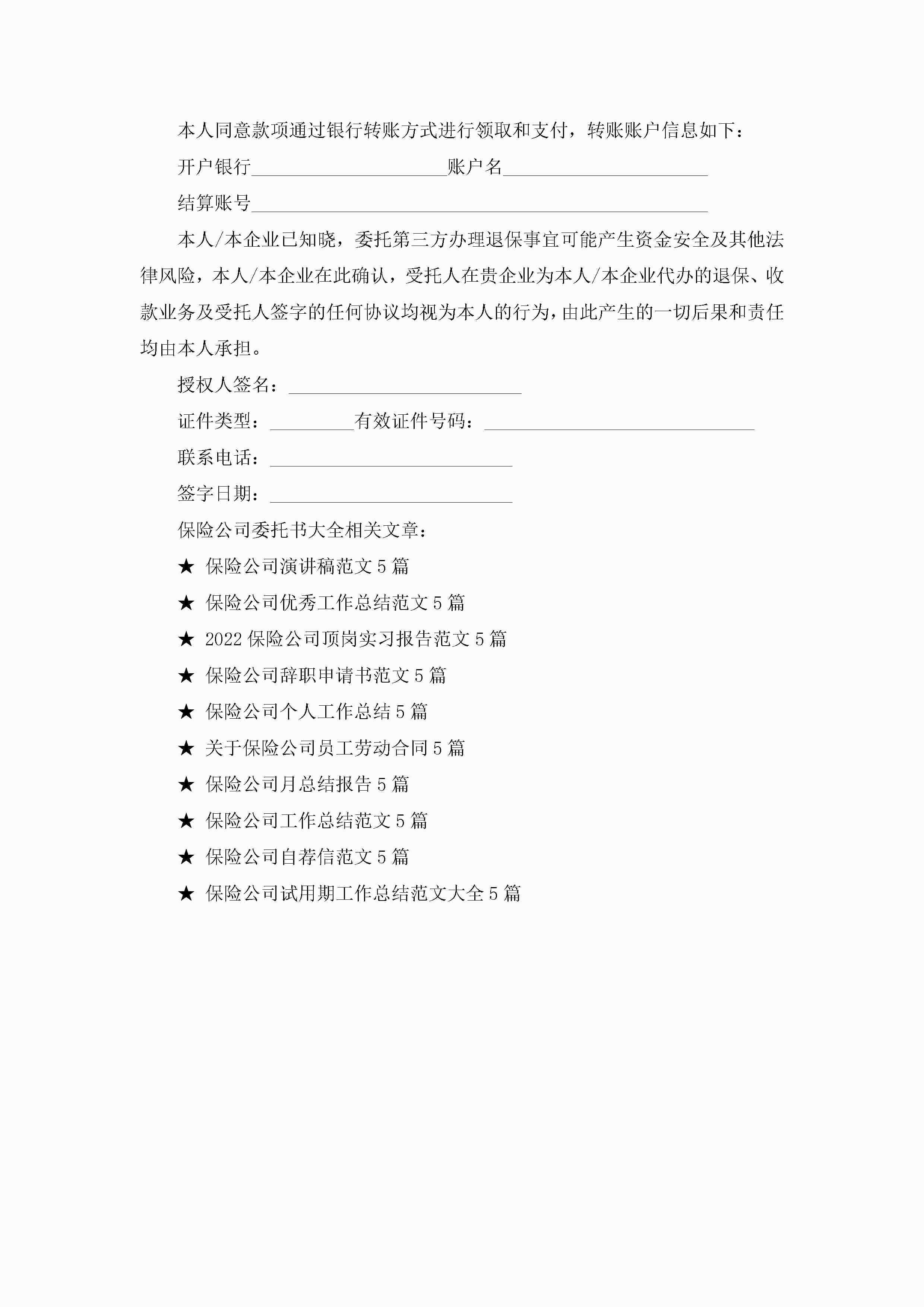 保险公司委托书大全8篇jugei3月22日 16:24发布关注357 保险公司委托书大全8篇此内容为付费资源,请付费后查看¥10.9 单篇文档限时特惠¥15个人会员开通企业会员开通立即下载无需登陆!可直接快捷下载单个模板付费资源© 版权声明THE ENDWord模板# 实用文档# 实用模板# 信函模板# 委托书 如有问题,可点击最底部“联系我们”联系客服 分享QQ空间微博QQ好友海报分享复制链接收藏