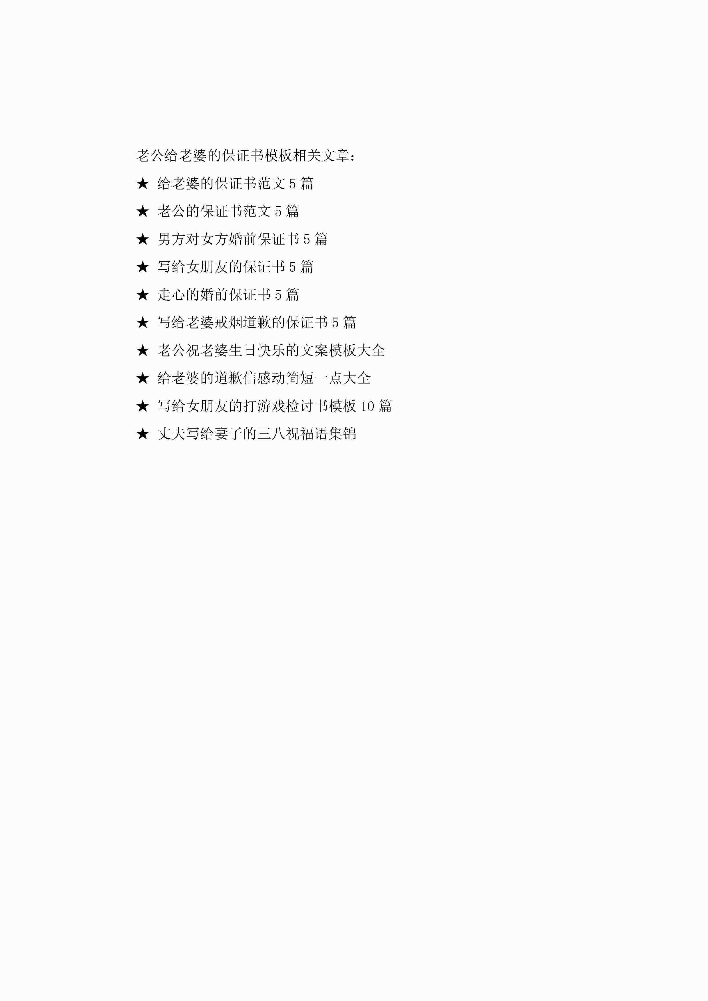 老公给老婆的保证书6篇jugei3月22日 16:24发布关注235 老公给老婆的保证书6篇此内容为付费资源,请付费后查看¥10.9 单篇文档限时特惠¥15个人会员开通企业会员开通立即下载无需登陆!可直接快捷下载单个模板付费资源© 版权声明THE ENDWord模板# 实用文档# 实用模板# 信函模板# 保证书 如有问题,可点击最底部“联系我们”联系客服 分享QQ空间微博QQ好友海报分享复制链接收藏