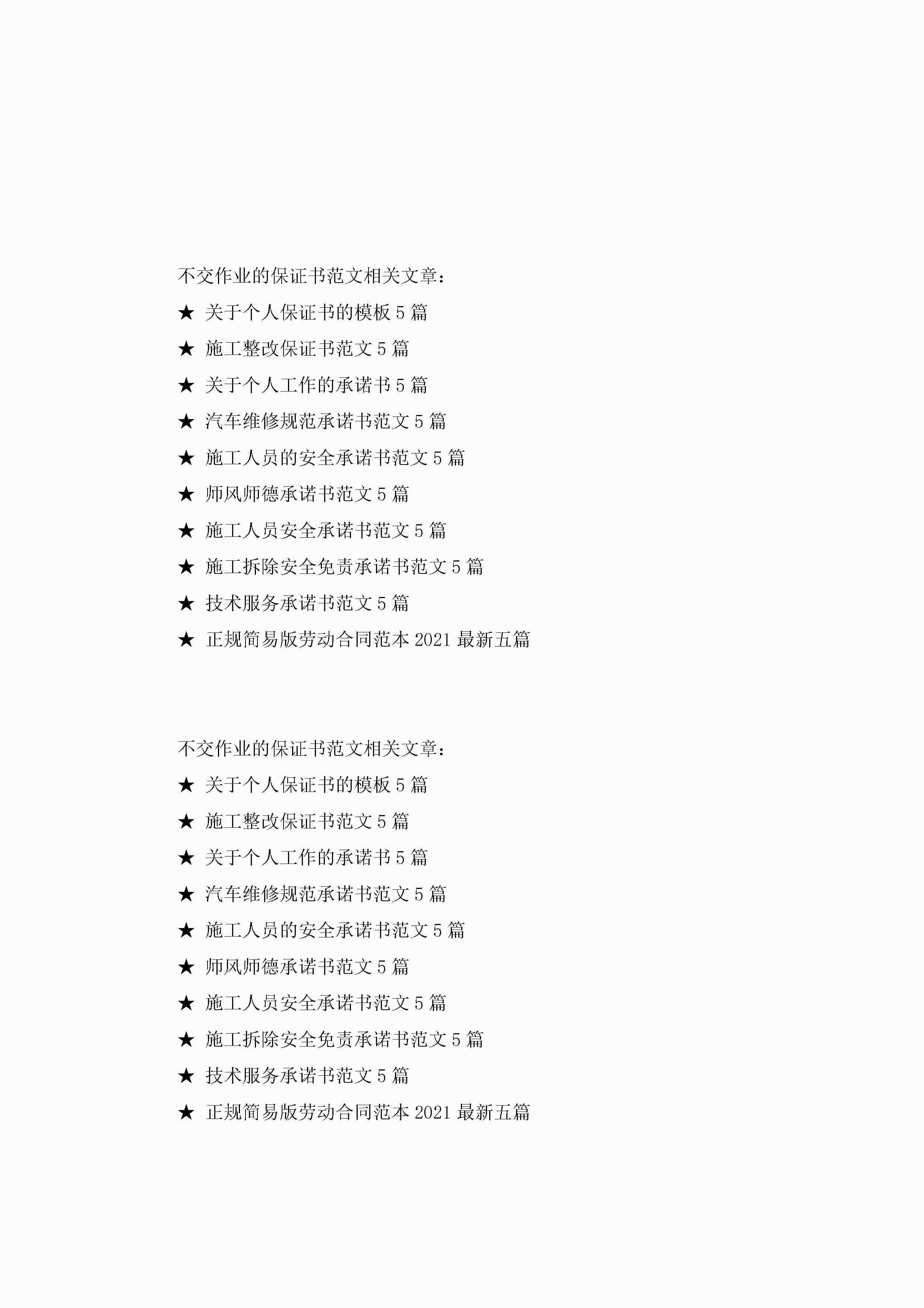 不交作业的保证书范文5篇jugei3月22日 16:24发布关注219 不交作业的保证书范文5篇此内容为付费资源,请付费后查看¥10.9 单篇文档限时特惠¥15个人会员开通企业会员开通立即下载无需登陆!可直接快捷下载单个模板付费资源© 版权声明THE ENDWord模板# 实用文档# 实用模板# 信函模板# 保证书 如有问题,可点击最底部“联系我们”联系客服 分享QQ空间微博QQ好友海报分享复制链接收藏
