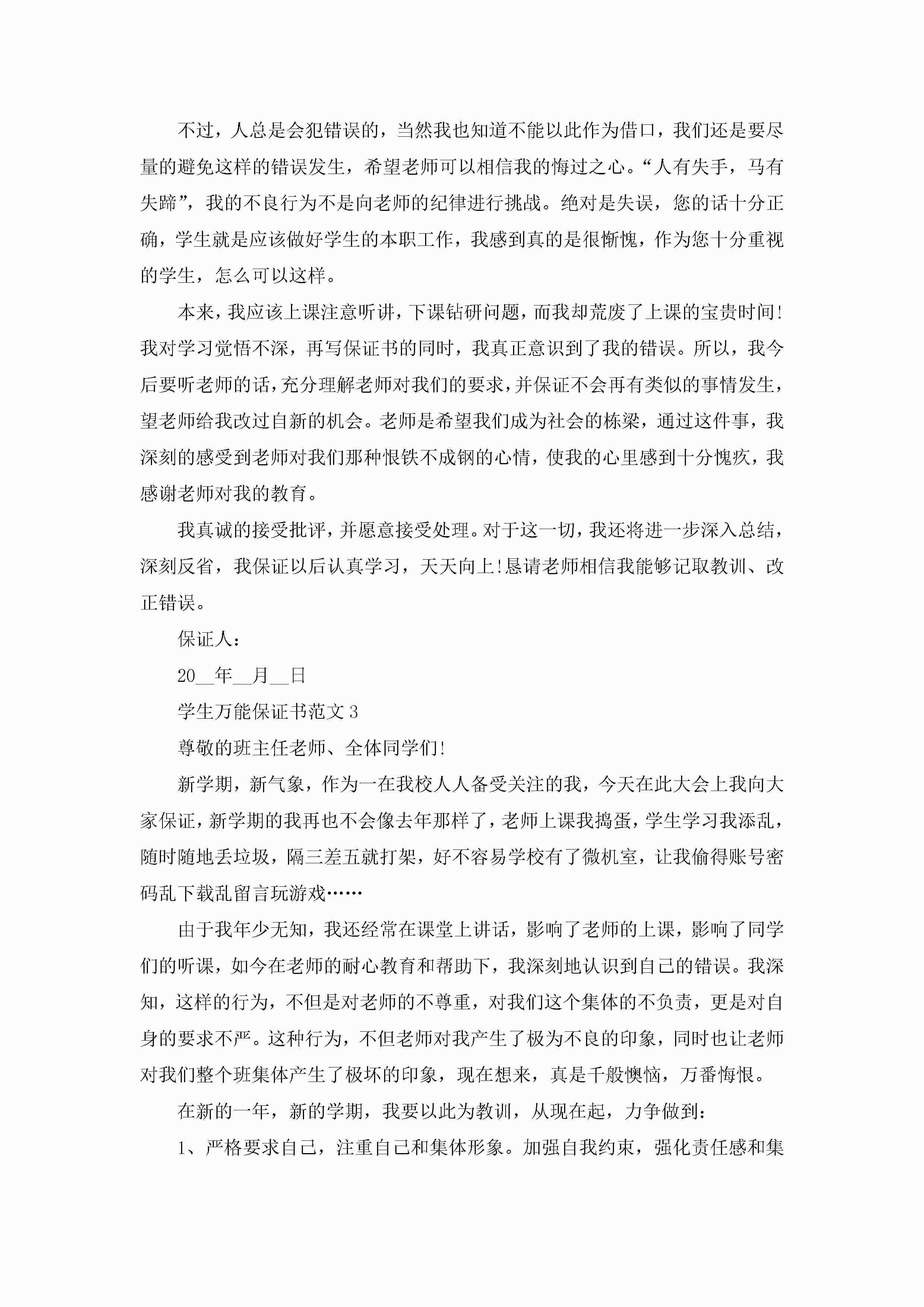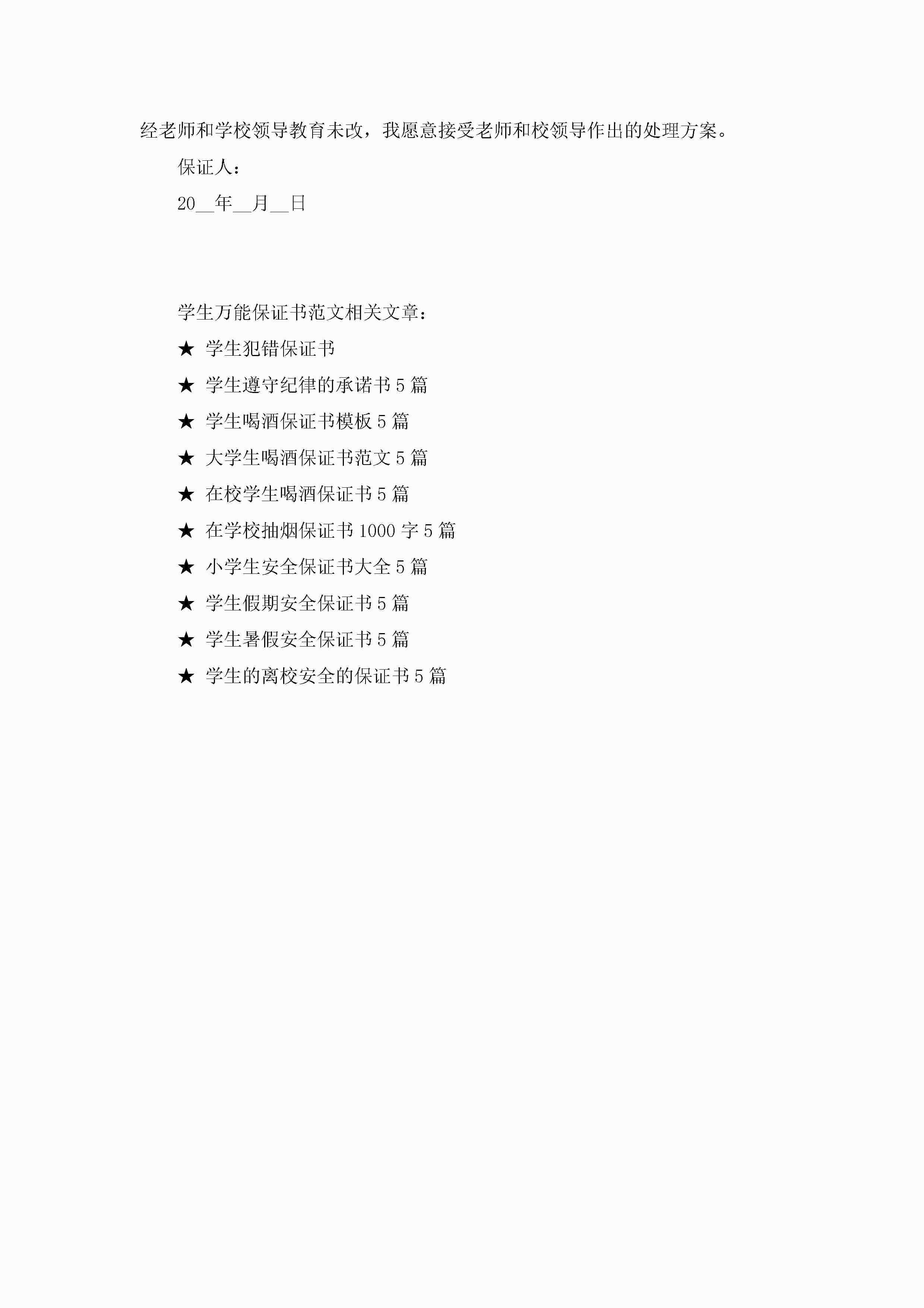学生万能保证书范文5篇jugei3月22日 16:24发布关注199 学生万能保证书范文5篇此内容为付费资源,请付费后查看¥10.9 单篇文档限时特惠¥15个人会员开通企业会员开通立即下载无需登陆!可直接快捷下载单个模板付费资源© 版权声明THE ENDWord模板# 实用文档# 实用模板# 信函模板# 保证书 如有问题,可点击最底部“联系我们”联系客服 分享QQ空间微博QQ好友海报分享复制链接收藏