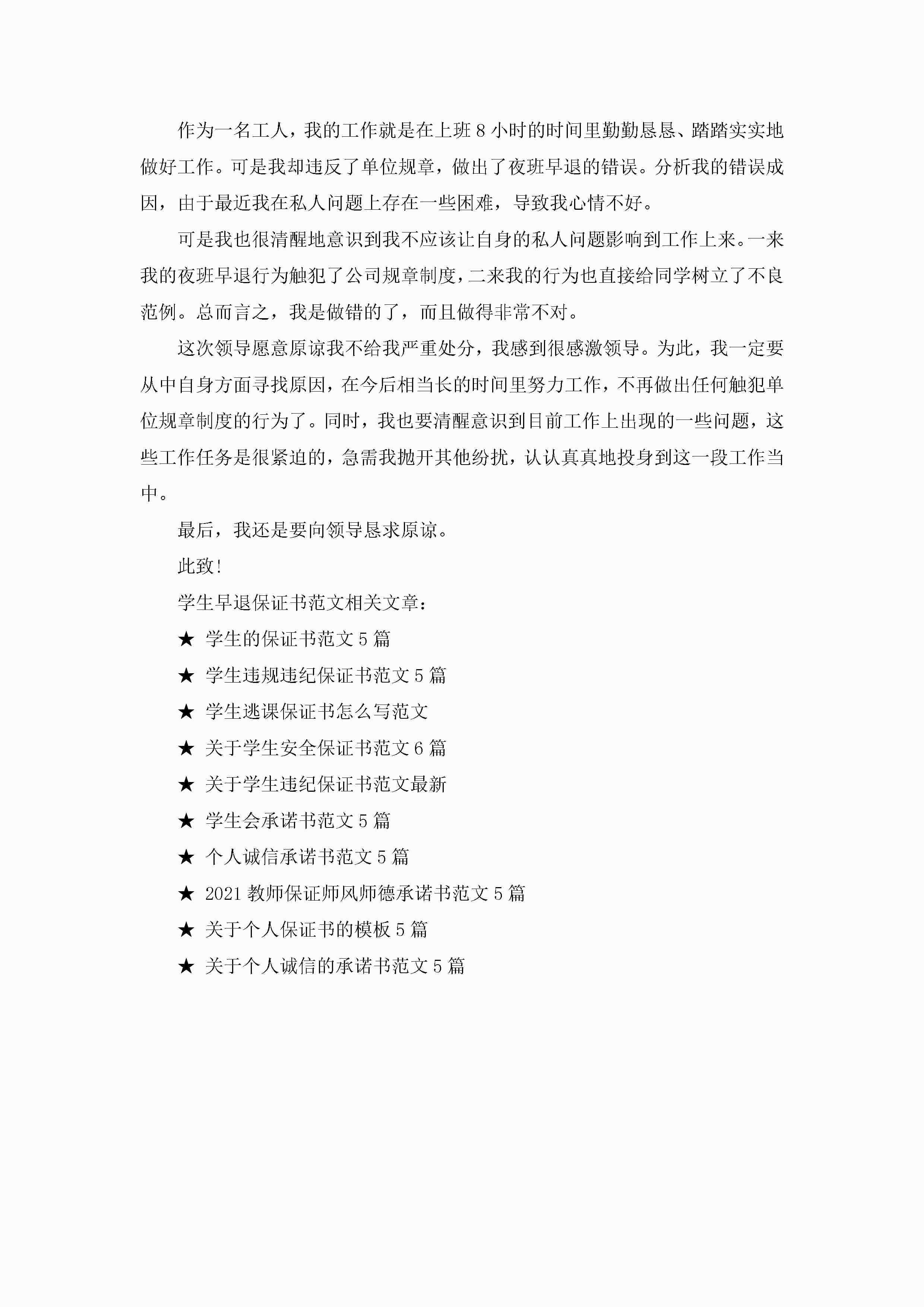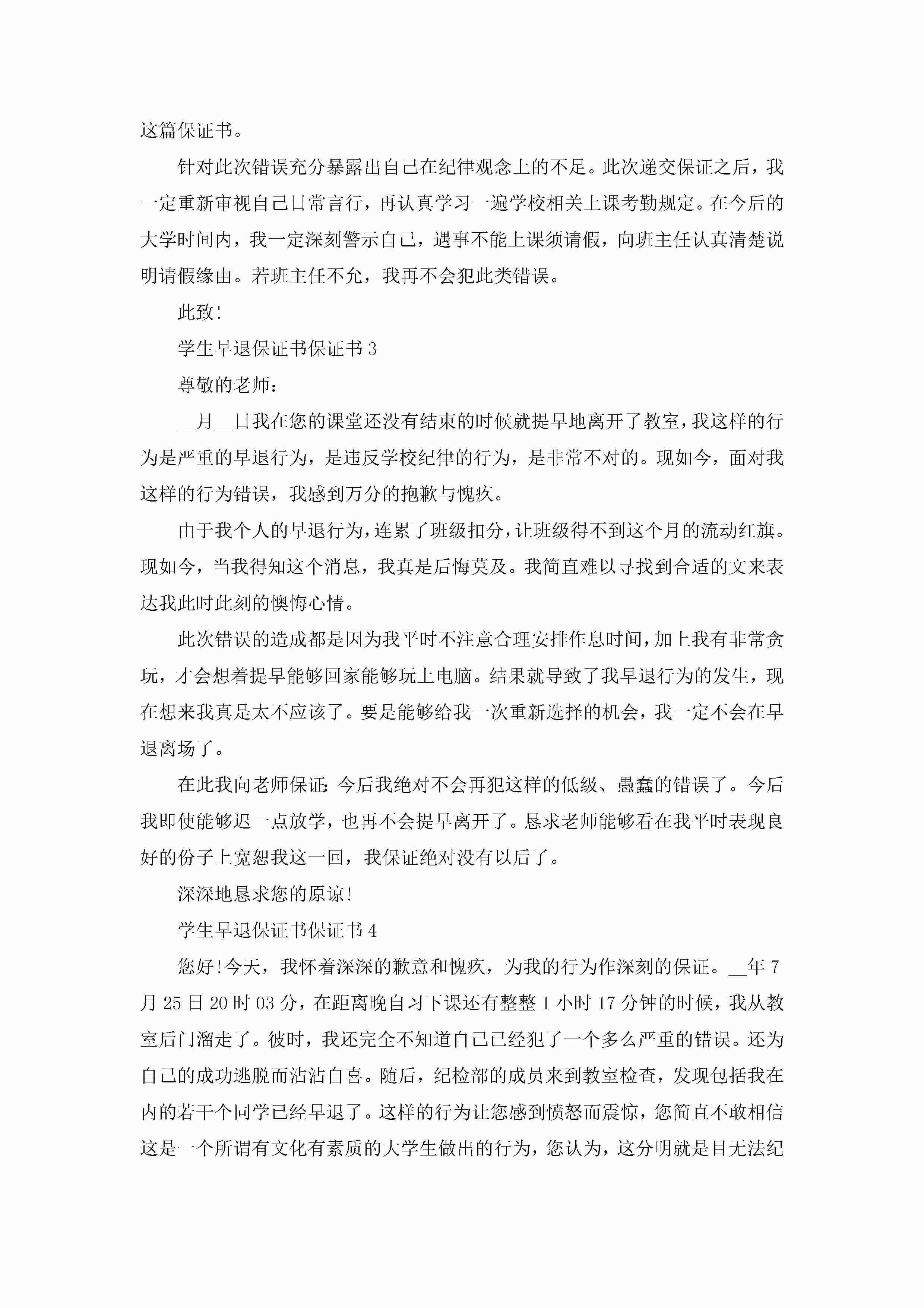 学生早退保证书范文5篇jugei3月22日 16:24发布关注207 学生早退保证书范文5篇此内容为付费资源,请付费后查看¥10.9 单篇文档限时特惠¥15个人会员开通企业会员开通立即下载无需登陆!可直接快捷下载单个模板付费资源© 版权声明THE ENDWord模板# 实用文档# 实用模板# 信函模板# 保证书 如有问题,可点击最底部“联系我们”联系客服 分享QQ空间微博QQ好友海报分享复制链接收藏