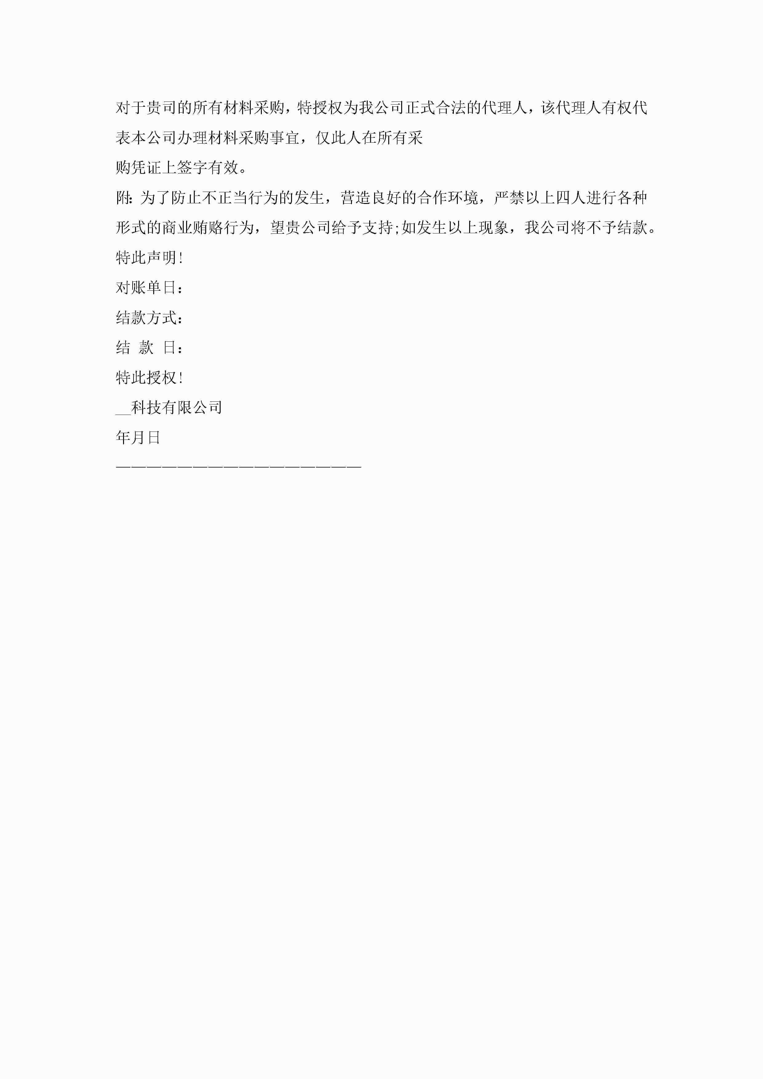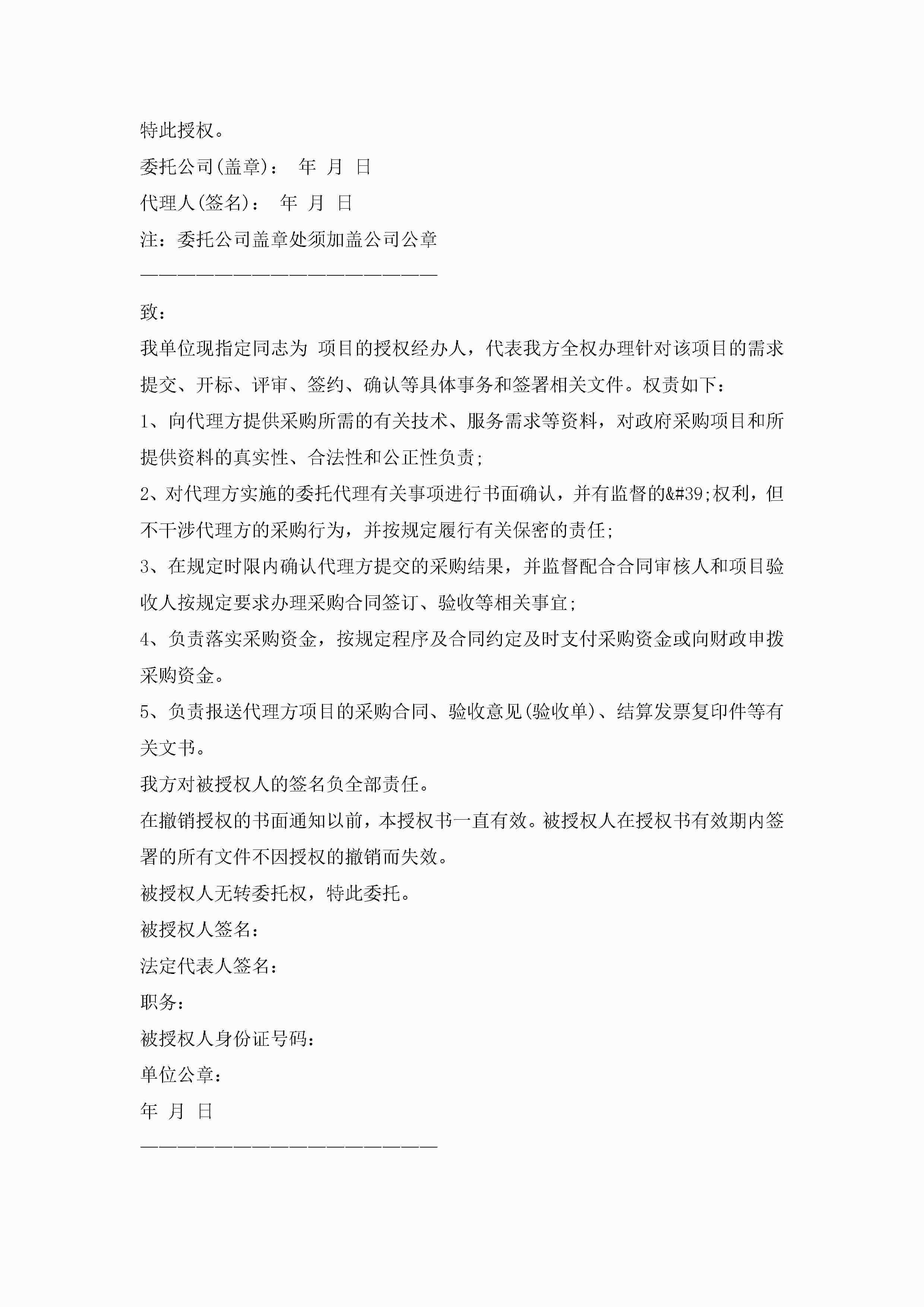 最新采购物品授权委托书9篇jugei3月22日 16:24发布关注234 最新采购物品授权委托书9篇此内容为付费资源,请付费后查看¥10.9 单篇文档限时特惠¥15个人会员开通企业会员开通立即下载无需登陆!可直接快捷下载单个模板付费资源© 版权声明THE ENDWord模板# 实用文档# 实用模板# 信函模板# 委托书 如有问题,可点击最底部“联系我们”联系客服 分享QQ空间微博QQ好友海报分享复制链接收藏