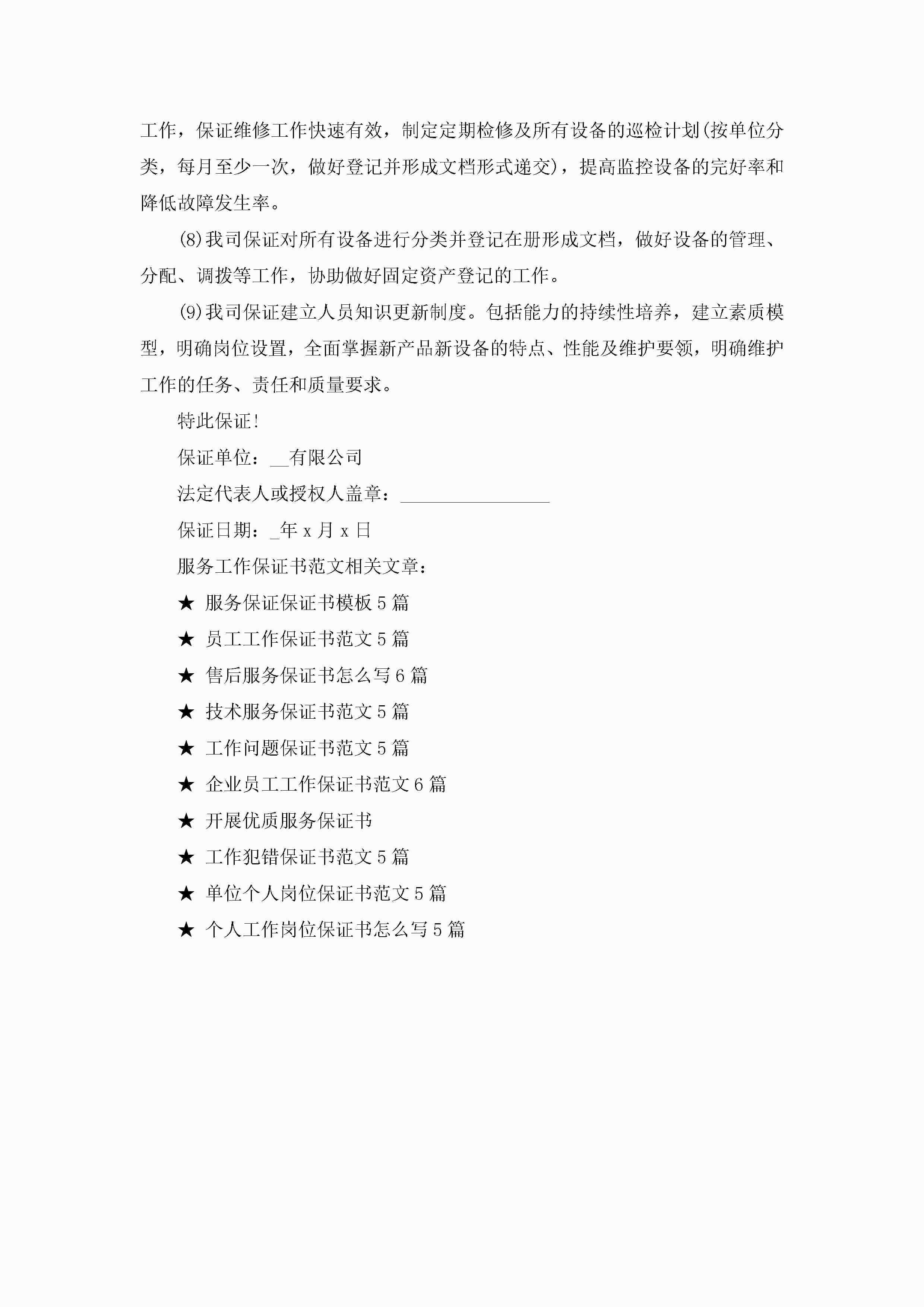服务工作保证书范文5篇jugei3月22日 16:24发布关注448 服务工作保证书范文5篇此内容为付费资源,请付费后查看¥10.9 单篇文档限时特惠¥15个人会员开通企业会员开通立即下载无需登陆!可直接快捷下载单个模板付费资源© 版权声明THE ENDWord模板# 实用文档# 实用模板# 信函模板# 保证书 如有问题,可点击最底部“联系我们”联系客服 分享QQ空间微博QQ好友海报分享复制链接收藏