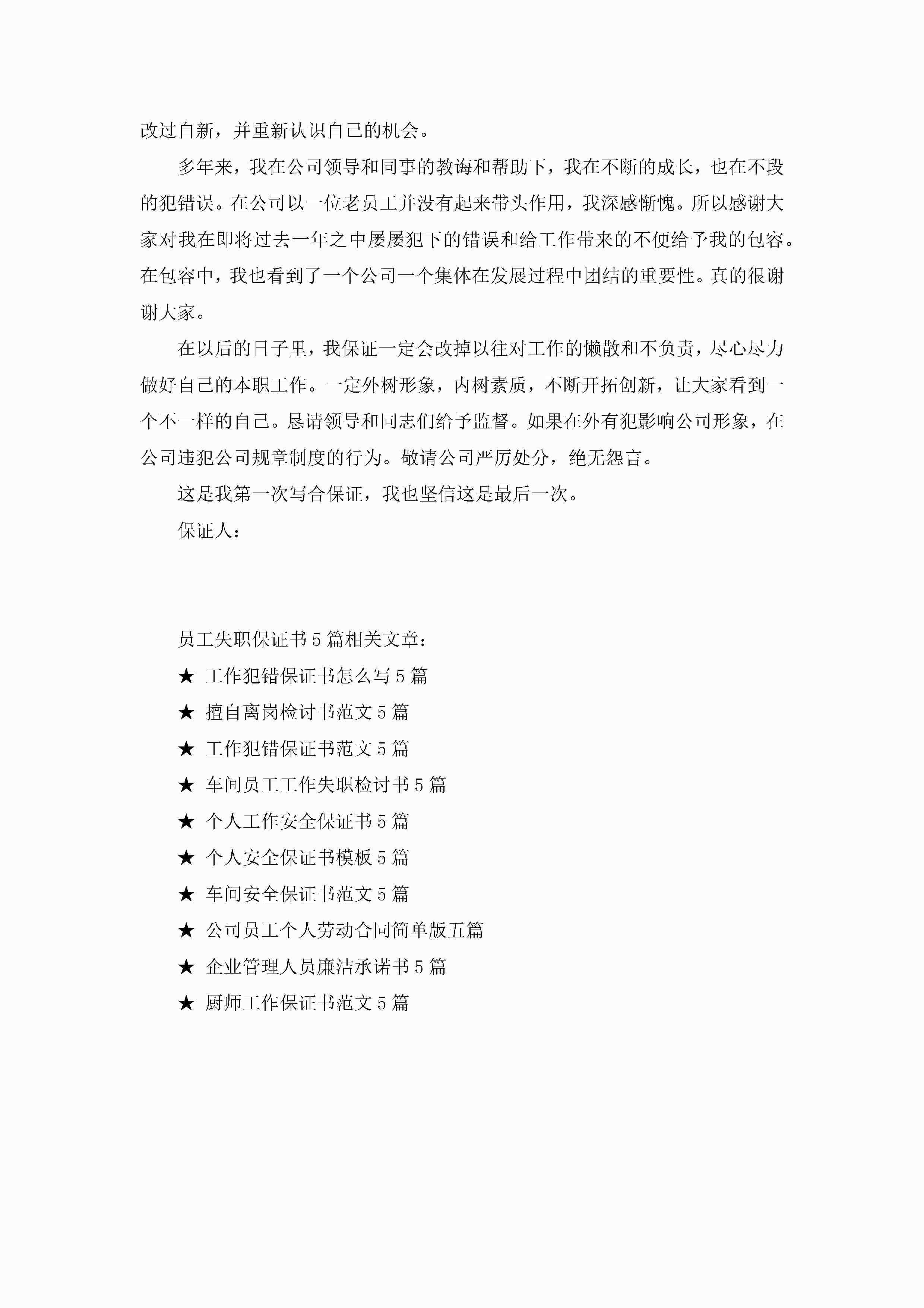 最新员工失职保证书5篇jugei3月22日 16:24发布关注230 最新员工失职保证书5篇此内容为付费资源,请付费后查看¥10.9 单篇文档限时特惠¥15个人会员开通企业会员开通立即下载无需登陆!可直接快捷下载单个模板付费资源© 版权声明THE ENDWord模板# 实用文档# 实用模板# 信函模板# 保证书 如有问题,可点击最底部“联系我们”联系客服 分享QQ空间微博QQ好友海报分享复制链接收藏