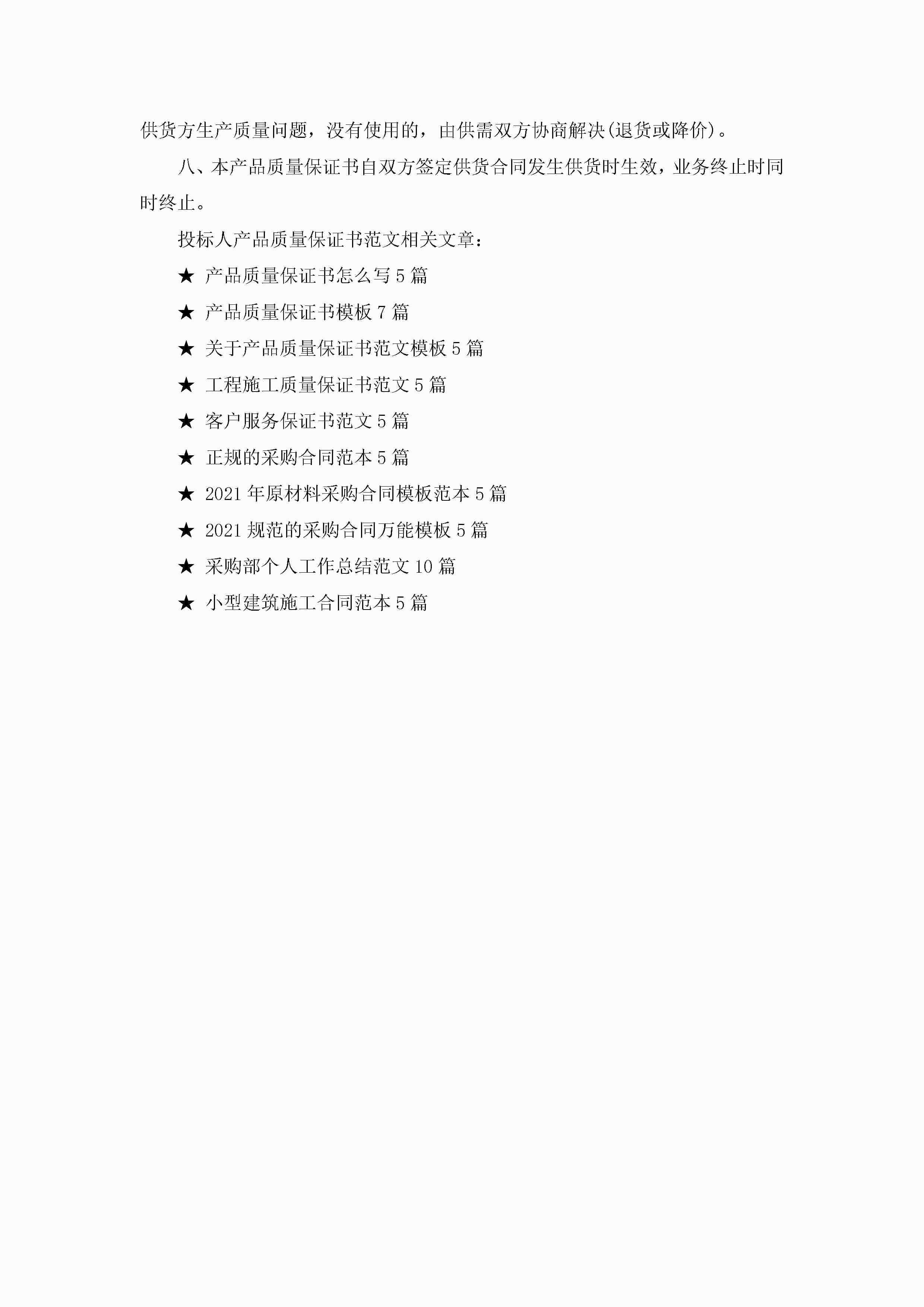 投标人产品质量保证书范文7篇jugei3月22日 16:25发布关注278 投标人产品质量保证书范文7篇此内容为付费资源,请付费后查看¥10.9 单篇文档限时特惠¥15个人会员开通企业会员开通立即下载无需登陆!可直接快捷下载单个模板付费资源© 版权声明THE ENDWord模板# 实用文档# 实用模板# 信函模板# 保证书 如有问题,可点击最底部“联系我们”联系客服 分享QQ空间微博QQ好友海报分享复制链接收藏