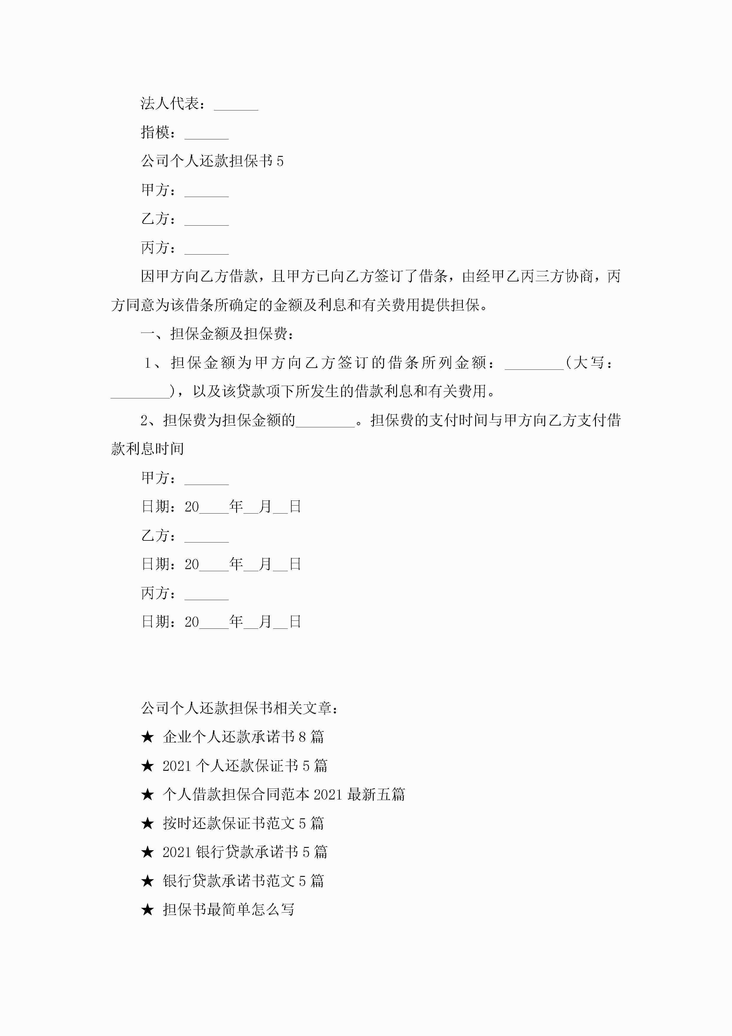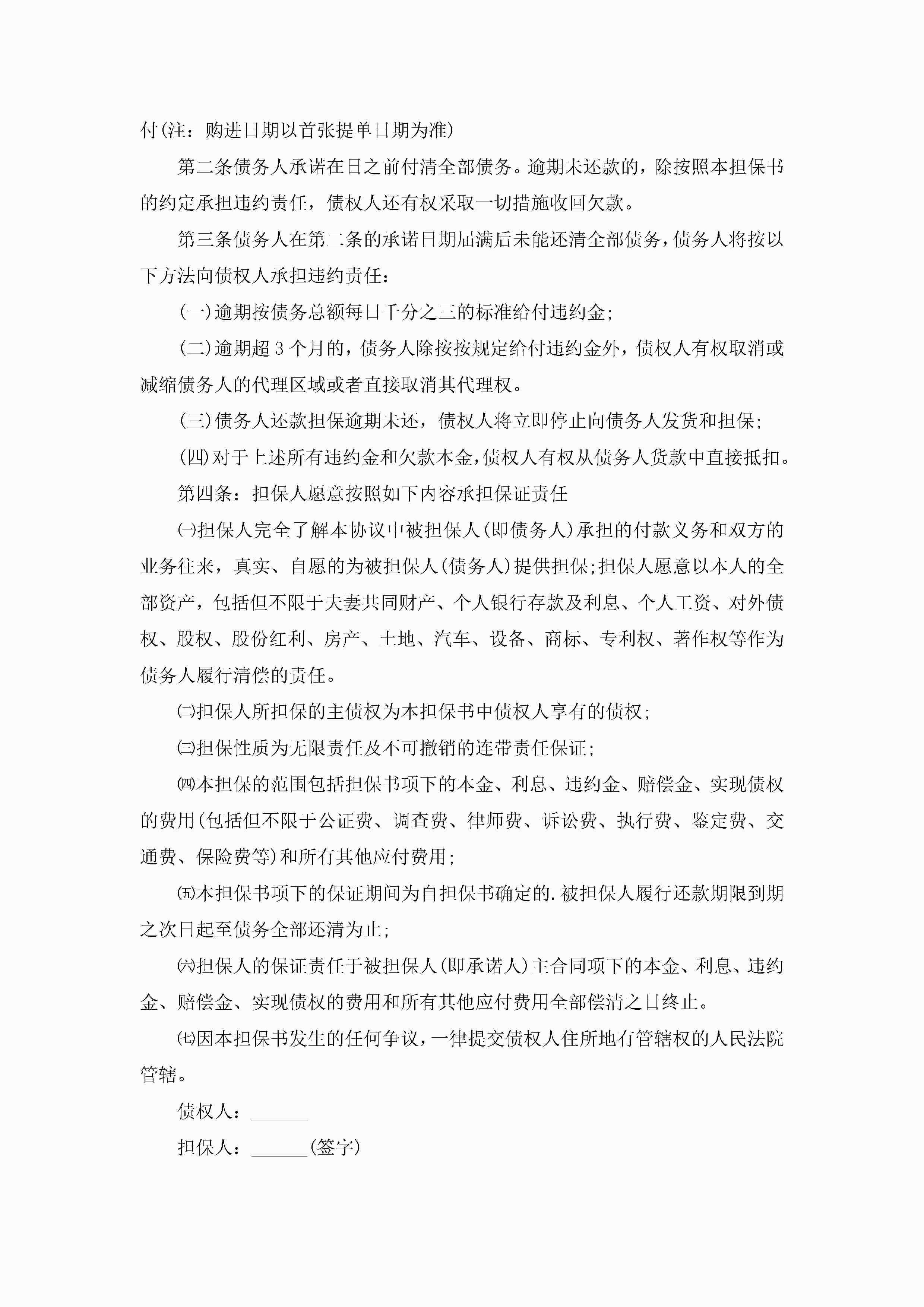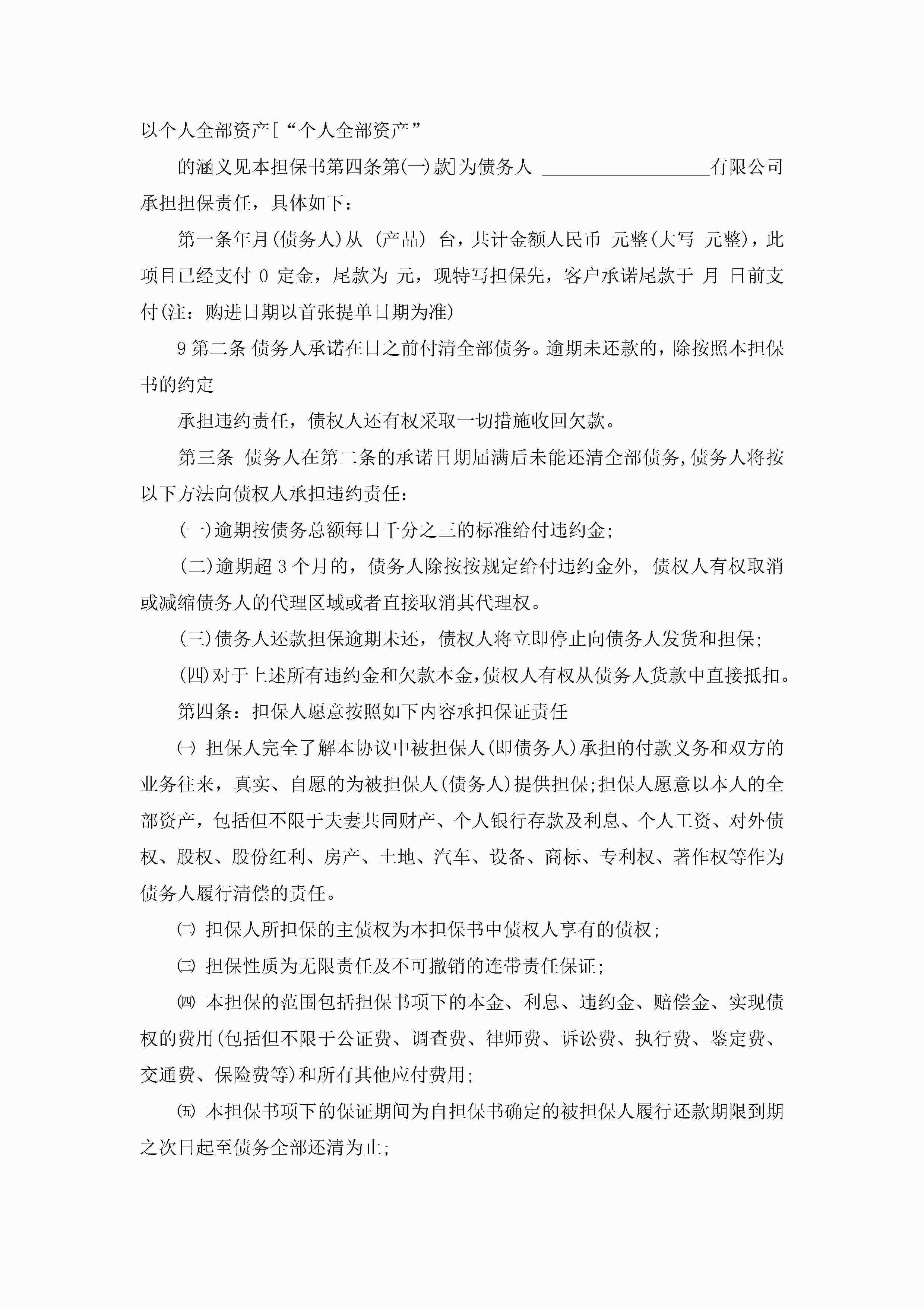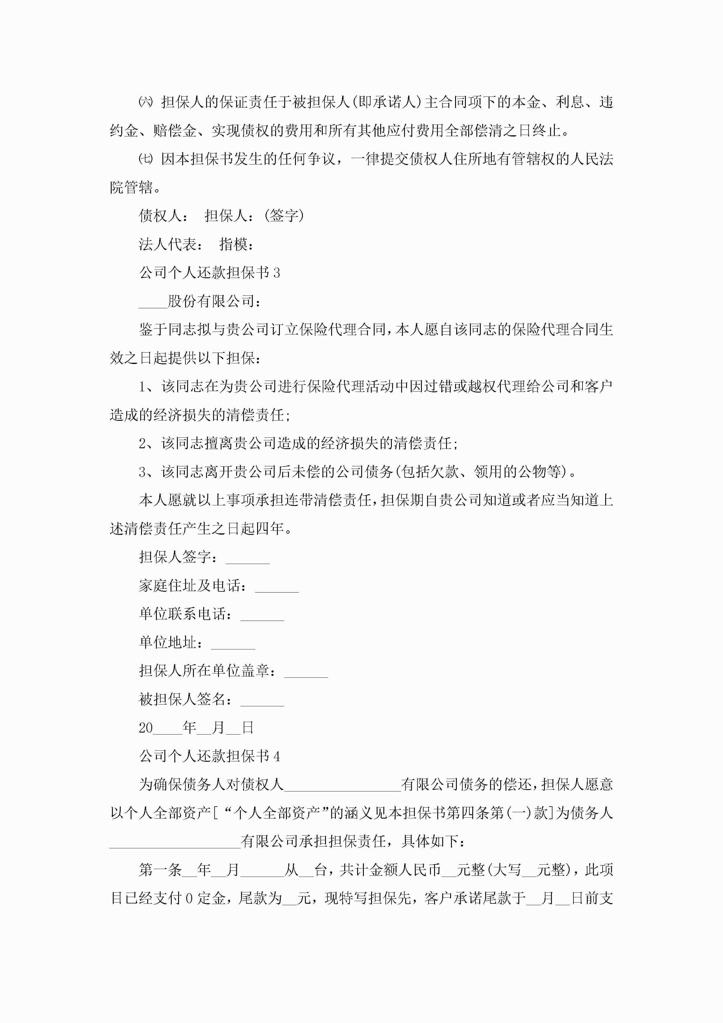 公司个人还款担保书5篇jugei3月22日 16:25发布关注202 公司个人还款担保书5篇此内容为付费资源,请付费后查看¥10.9 单篇文档限时特惠¥15个人会员开通企业会员开通立即下载无需登陆!可直接快捷下载单个模板付费资源© 版权声明THE ENDWord模板# 实用文档# 实用模板# 信函模板# 担保书 如有问题,可点击最底部“联系我们”联系客服 分享QQ空间微博QQ好友海报分享复制链接收藏