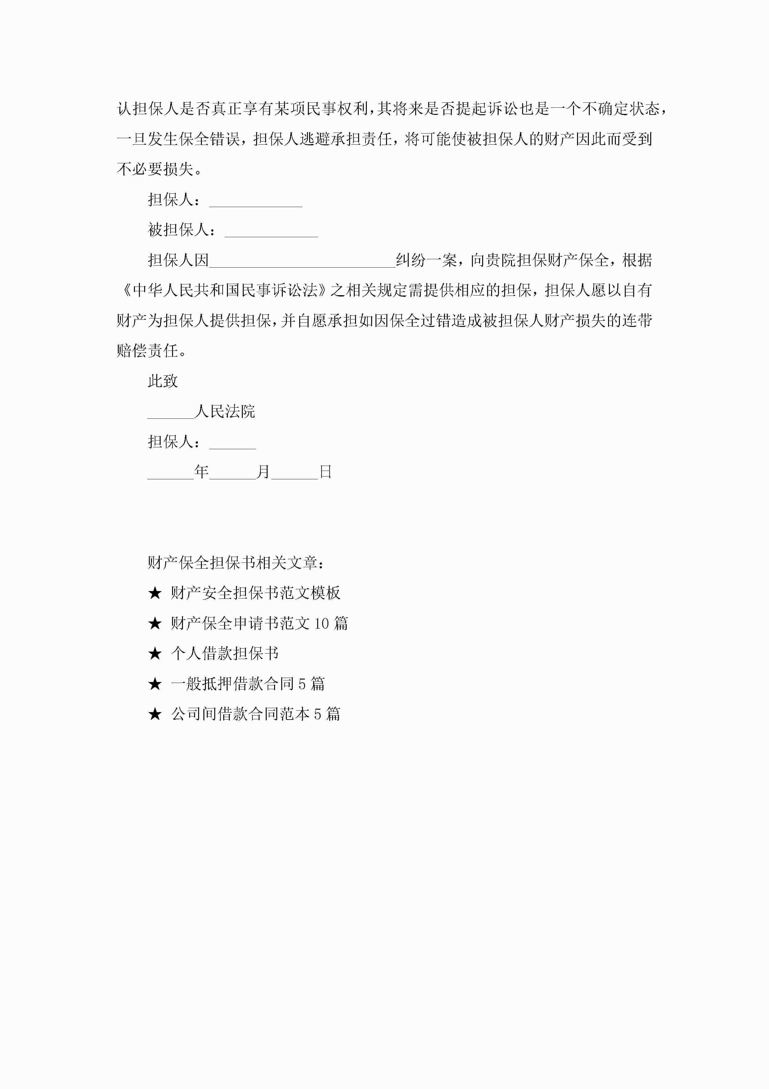 财产保全担保书范本10篇jugei3月22日 16:25发布关注211 财产保全担保书范本10篇此内容为付费资源,请付费后查看¥10.9 单篇文档限时特惠¥15个人会员开通企业会员开通立即下载无需登陆!可直接快捷下载单个模板付费资源© 版权声明THE ENDWord模板# 实用文档# 实用模板# 信函模板# 担保书 如有问题,可点击最底部“联系我们”联系客服 分享QQ空间微博QQ好友海报分享复制链接收藏