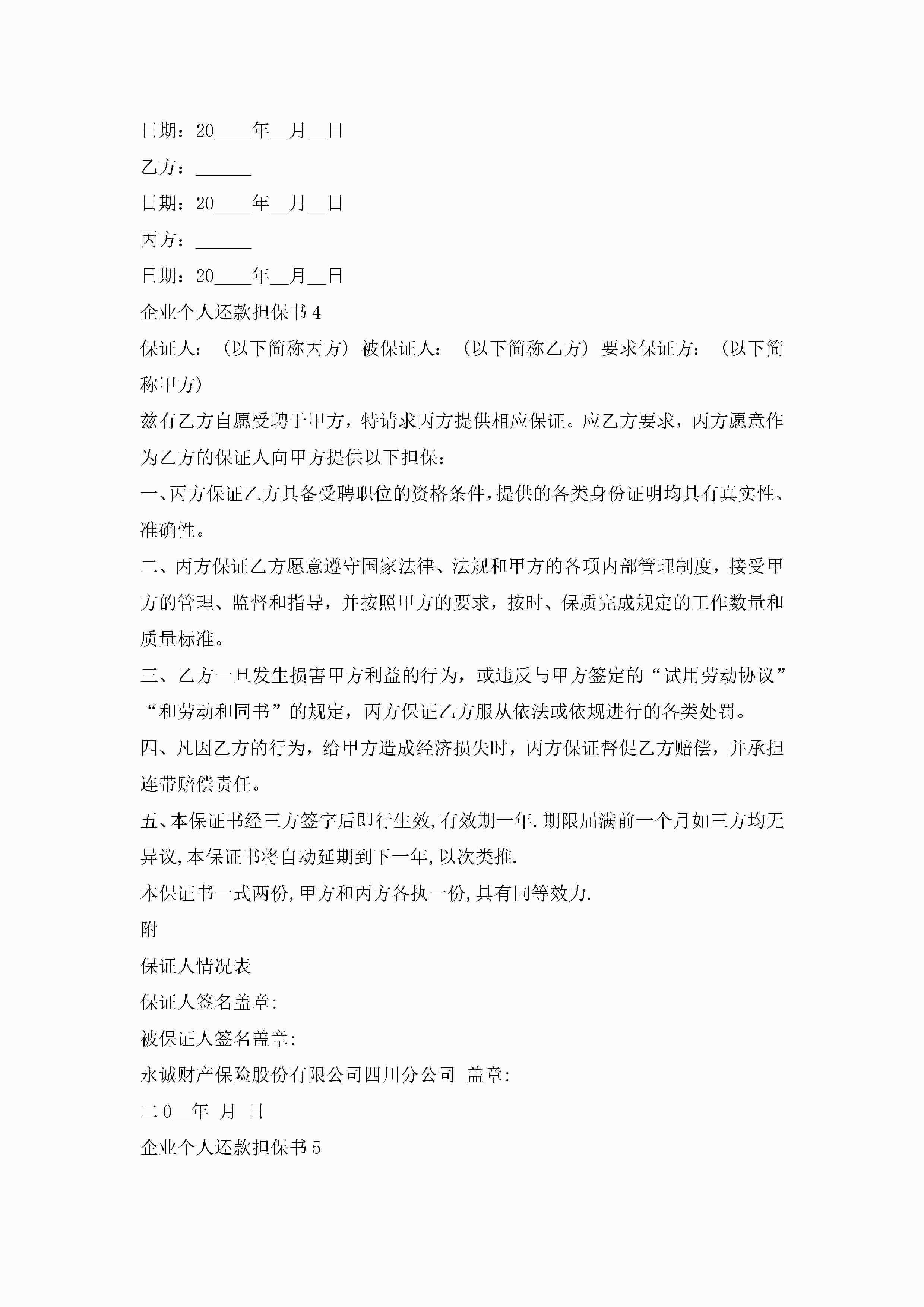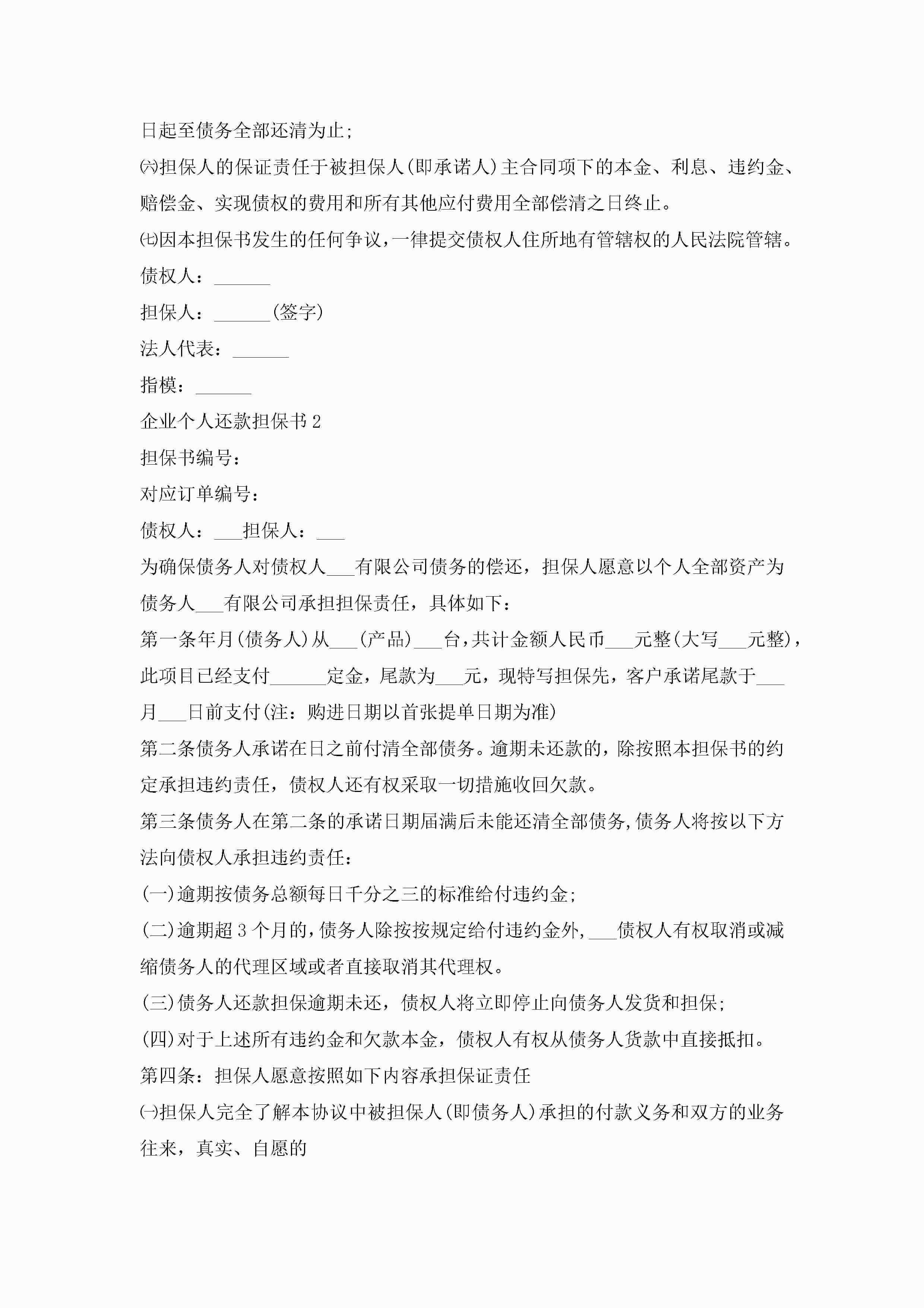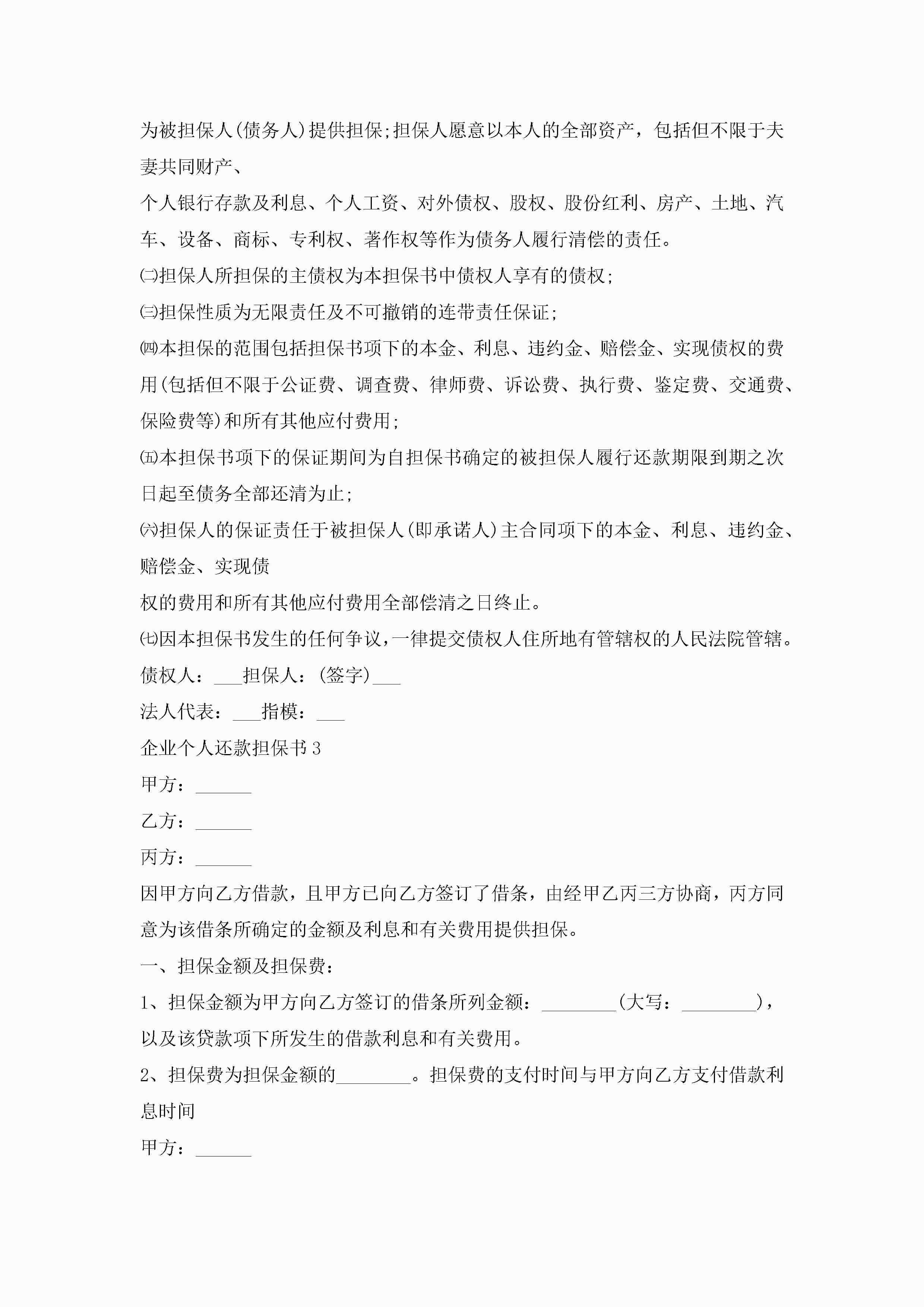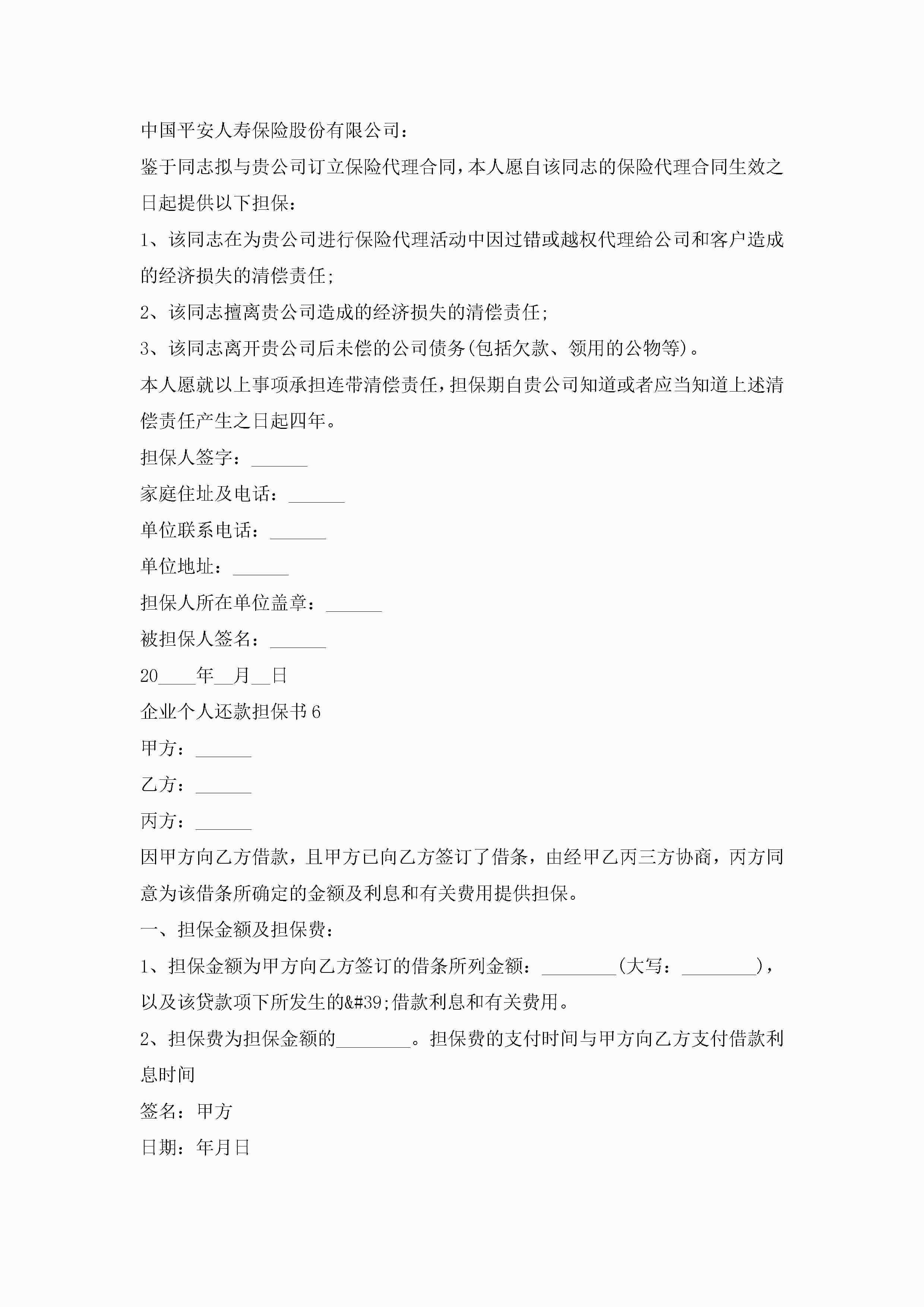 企业个人还款担保书6篇jugei3月22日 16:25发布关注244 企业个人还款担保书6篇此内容为付费资源,请付费后查看¥10.9 单篇文档限时特惠¥15个人会员开通企业会员开通立即下载无需登陆!可直接快捷下载单个模板付费资源© 版权声明THE ENDWord模板# 实用文档# 实用模板# 信函模板# 担保书 如有问题,可点击最底部“联系我们”联系客服 分享QQ空间微博QQ好友海报分享复制链接收藏