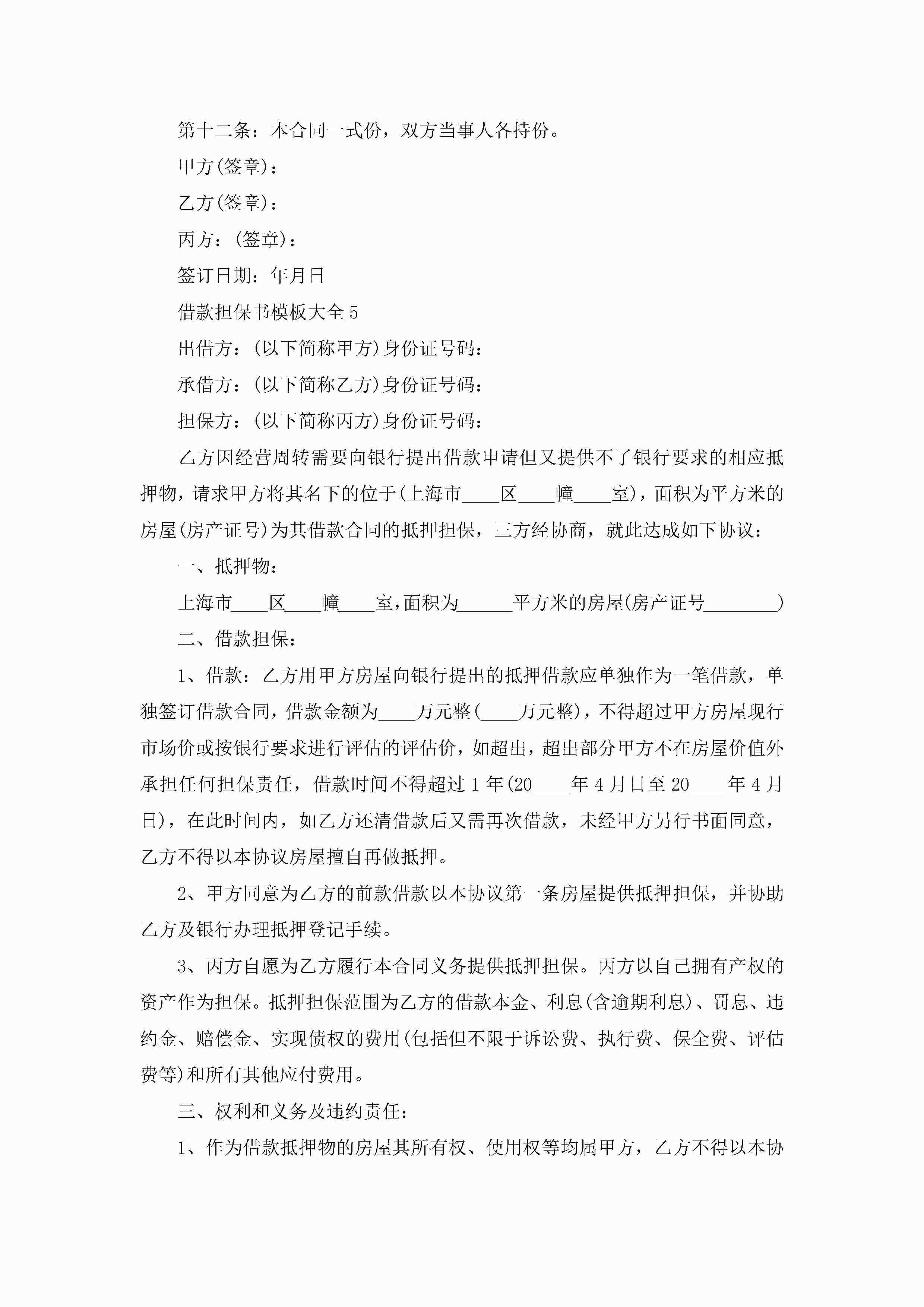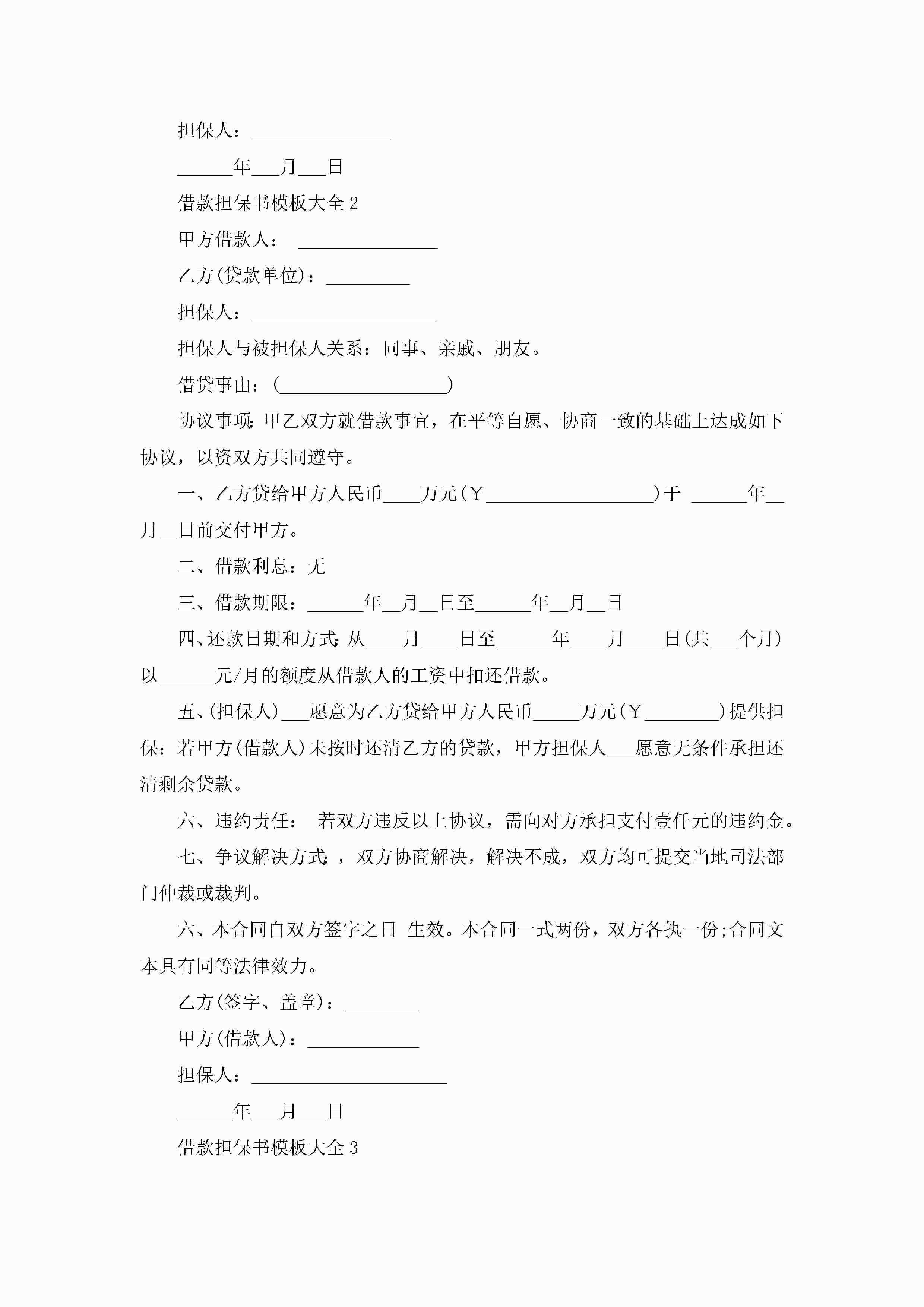借款担保书模板大全5篇jugei3月22日 16:25发布关注240 借款担保书模板大全5篇此内容为付费资源,请付费后查看¥10.9 单篇文档限时特惠¥15个人会员开通企业会员开通立即下载无需登陆!可直接快捷下载单个模板付费资源© 版权声明THE ENDWord模板# 实用文档# 实用模板# 信函模板# 担保书 如有问题,可点击最底部“联系我们”联系客服 分享QQ空间微博QQ好友海报分享复制链接收藏