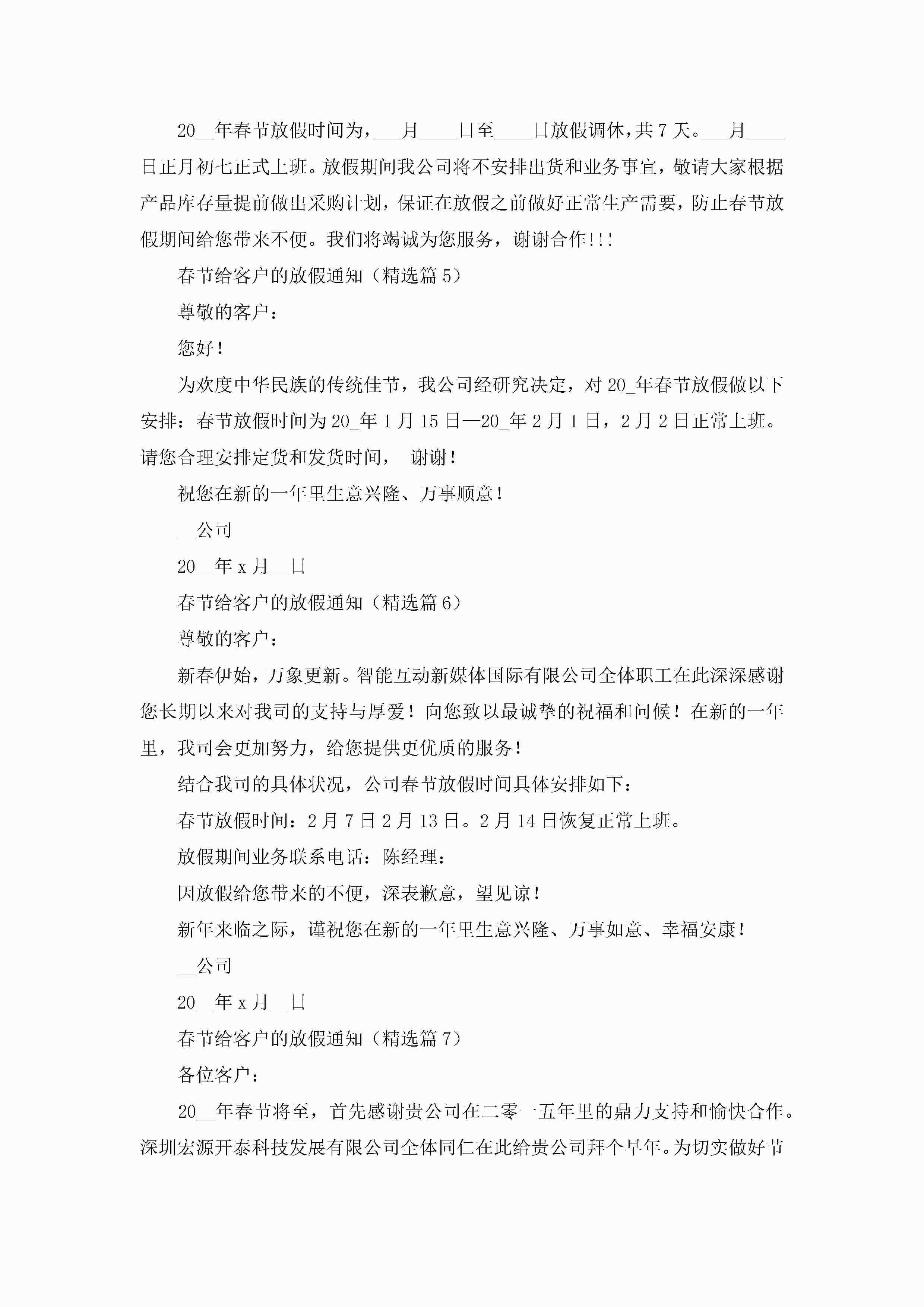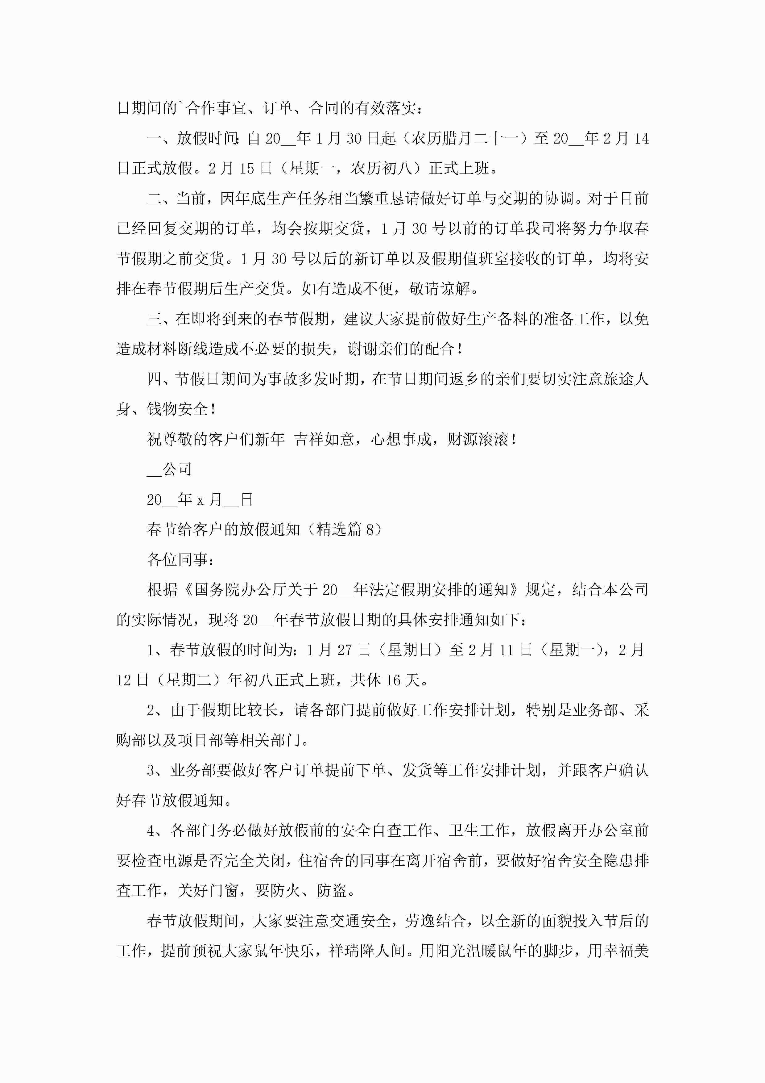 春节给客户的放假通知8篇jugei3月22日 16:25发布关注307 春节给客户的放假通知8篇此内容为付费资源,请付费后查看¥10.9 单篇文档限时特惠¥15个人会员开通企业会员开通立即下载无需登陆!可直接快捷下载单个模板付费资源© 版权声明THE ENDWord模板# 实用文档# 实用模板# 信函模板# 通知书 如有问题,可点击最底部“联系我们”联系客服 分享QQ空间微博QQ好友海报分享复制链接收藏