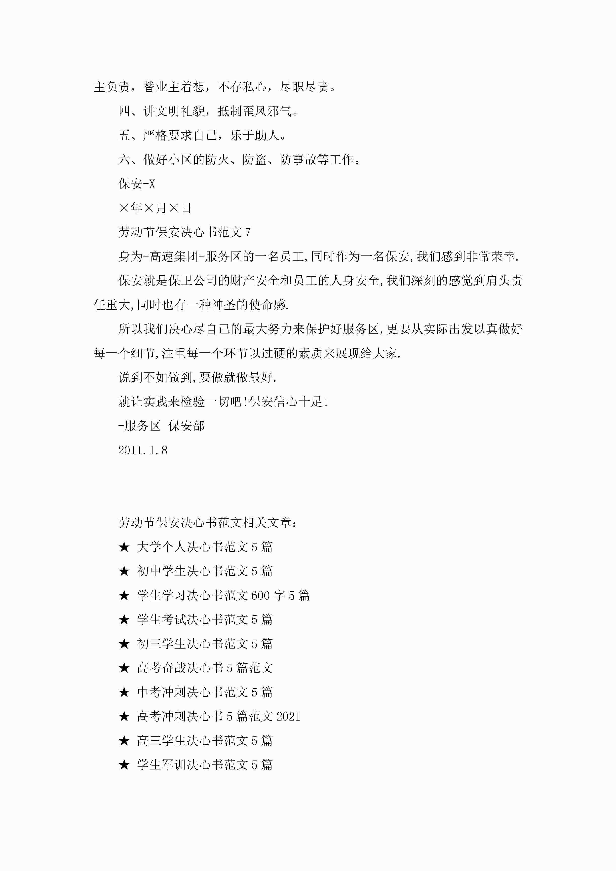 劳动节保安决心书范文7篇jugei3月22日 16:26发布关注338 劳动节保安决心书范文7篇此内容为付费资源,请付费后查看¥10.9 单篇文档限时特惠¥15个人会员开通企业会员开通立即下载无需登陆!可直接快捷下载单个模板付费资源© 版权声明THE ENDWord模板# 实用文档# 实用模板# 信函模板# 决心书 如有问题,可点击最底部“联系我们”联系客服 分享QQ空间微博QQ好友海报分享复制链接收藏