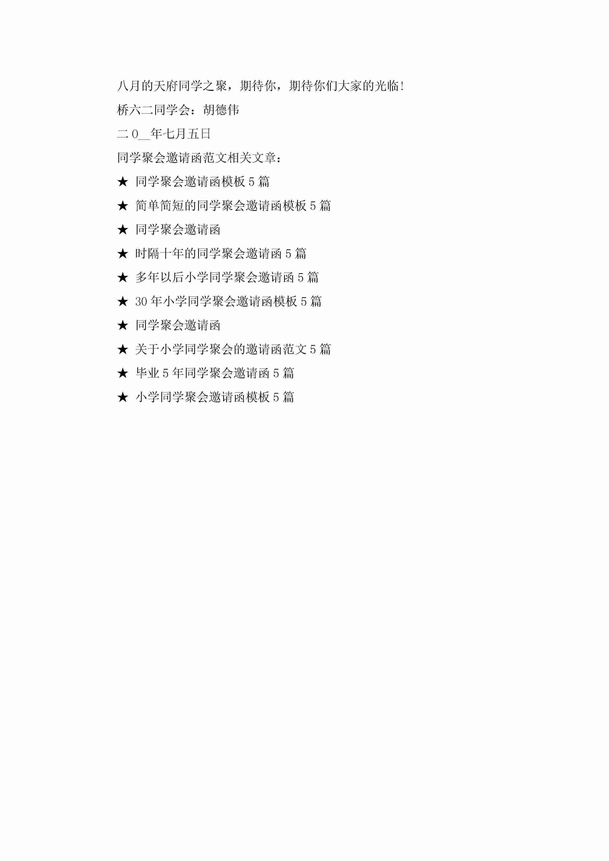 同学聚会邀请函范文5篇jugei3月22日 16:26发布关注220 同学聚会邀请函范文5篇此内容为付费资源,请付费后查看¥10.9 单篇文档限时特惠¥15个人会员开通企业会员开通立即下载无需登陆!可直接快捷下载单个模板付费资源© 版权声明THE ENDWord模板# 实用文档# 实用模板# 信函模板# 邀请函 如有问题,可点击最底部“联系我们”联系客服 分享QQ空间微博QQ好友海报分享复制链接收藏