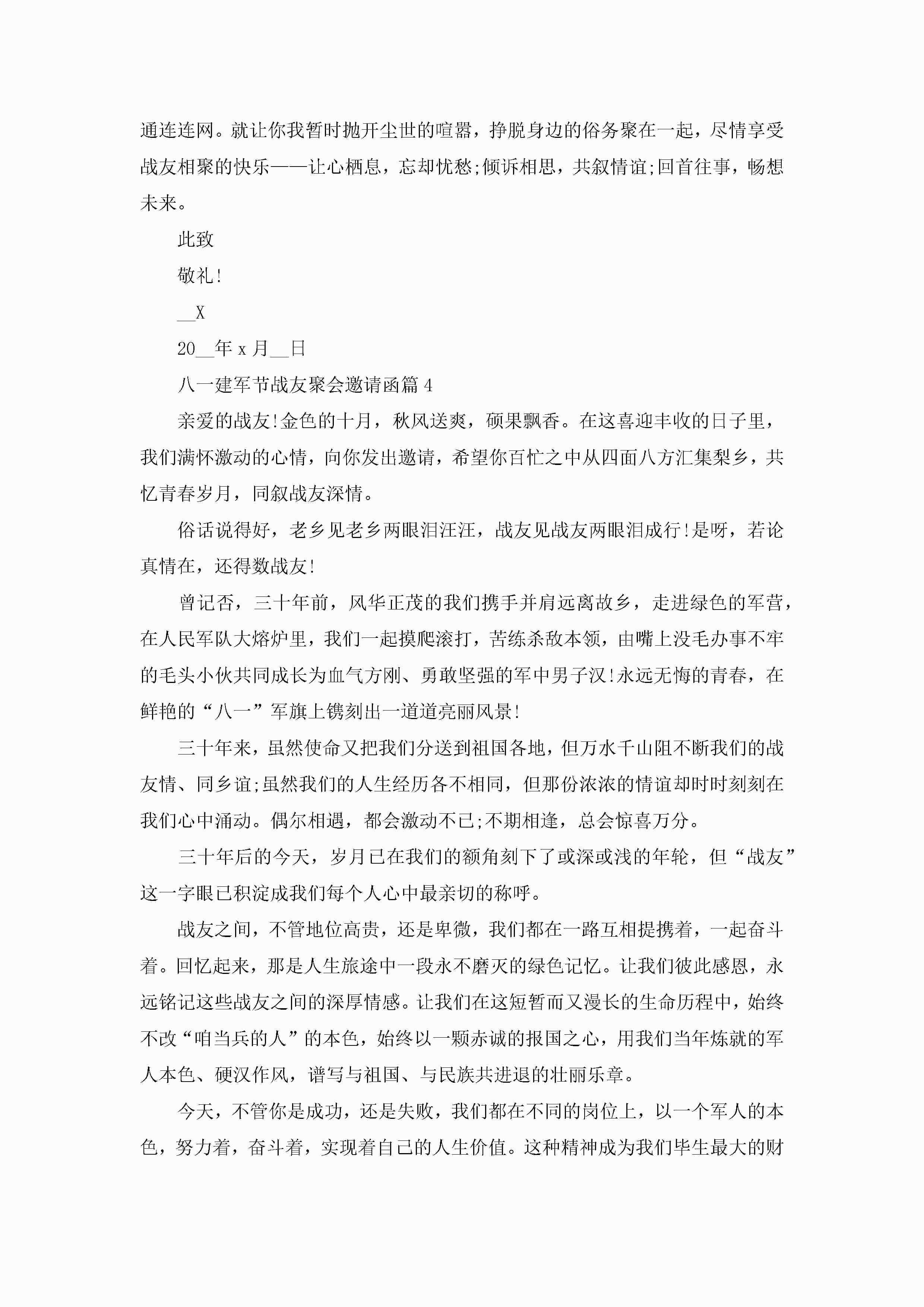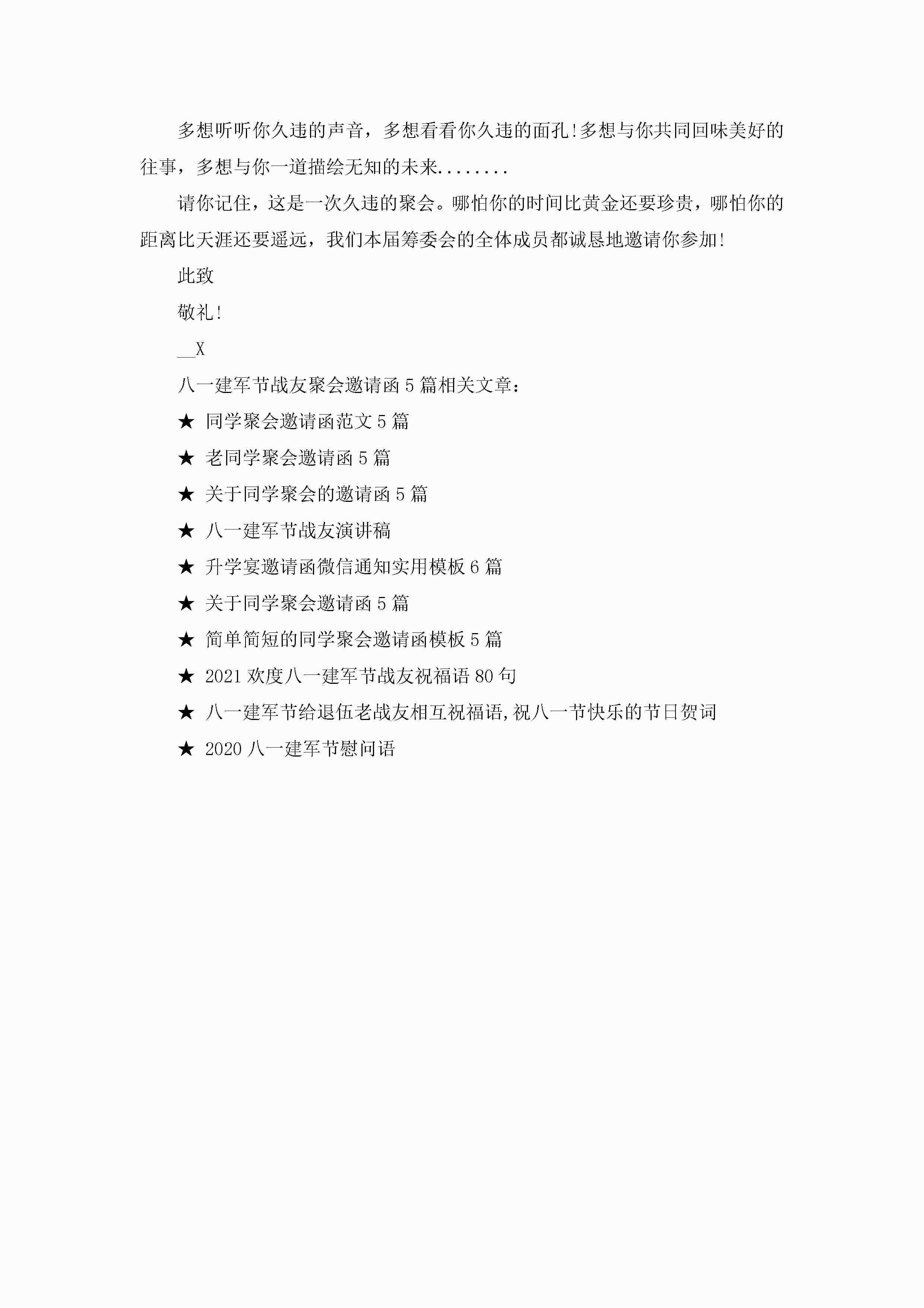 八一建军节战友聚会邀请函范文5篇jugei3月22日 16:26发布关注231 八一建军节战友聚会邀请函范文5篇此内容为付费资源,请付费后查看¥10.9 单篇文档限时特惠¥15个人会员开通企业会员开通立即下载无需登陆!可直接快捷下载单个模板付费资源© 版权声明THE ENDWord模板# 实用文档# 信函模板# 邀请函# 八一建军节战友聚会邀请函5篇 如有问题,可点击最底部“联系我们”联系客服 分享QQ空间微博QQ好友海报分享复制链接收藏