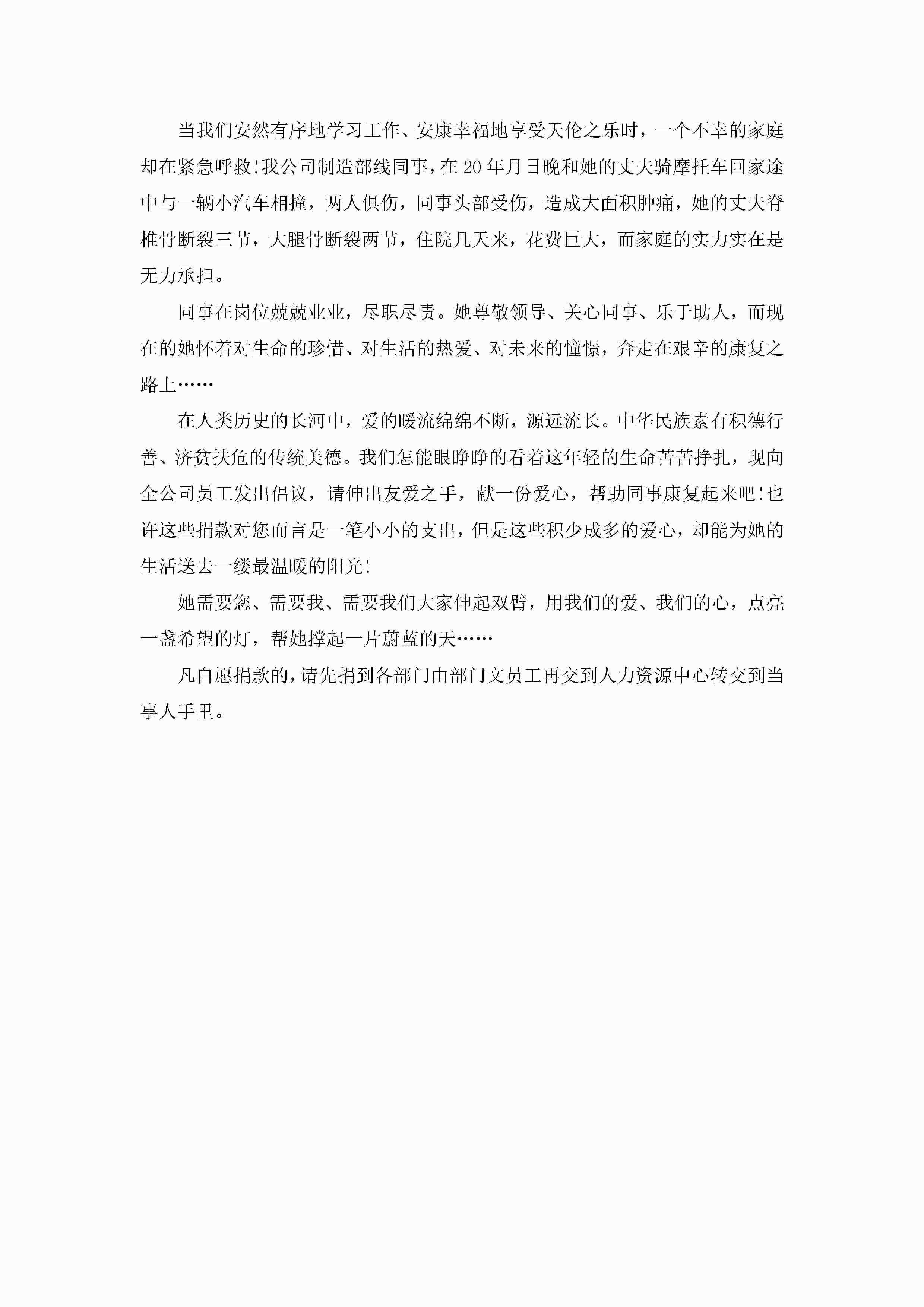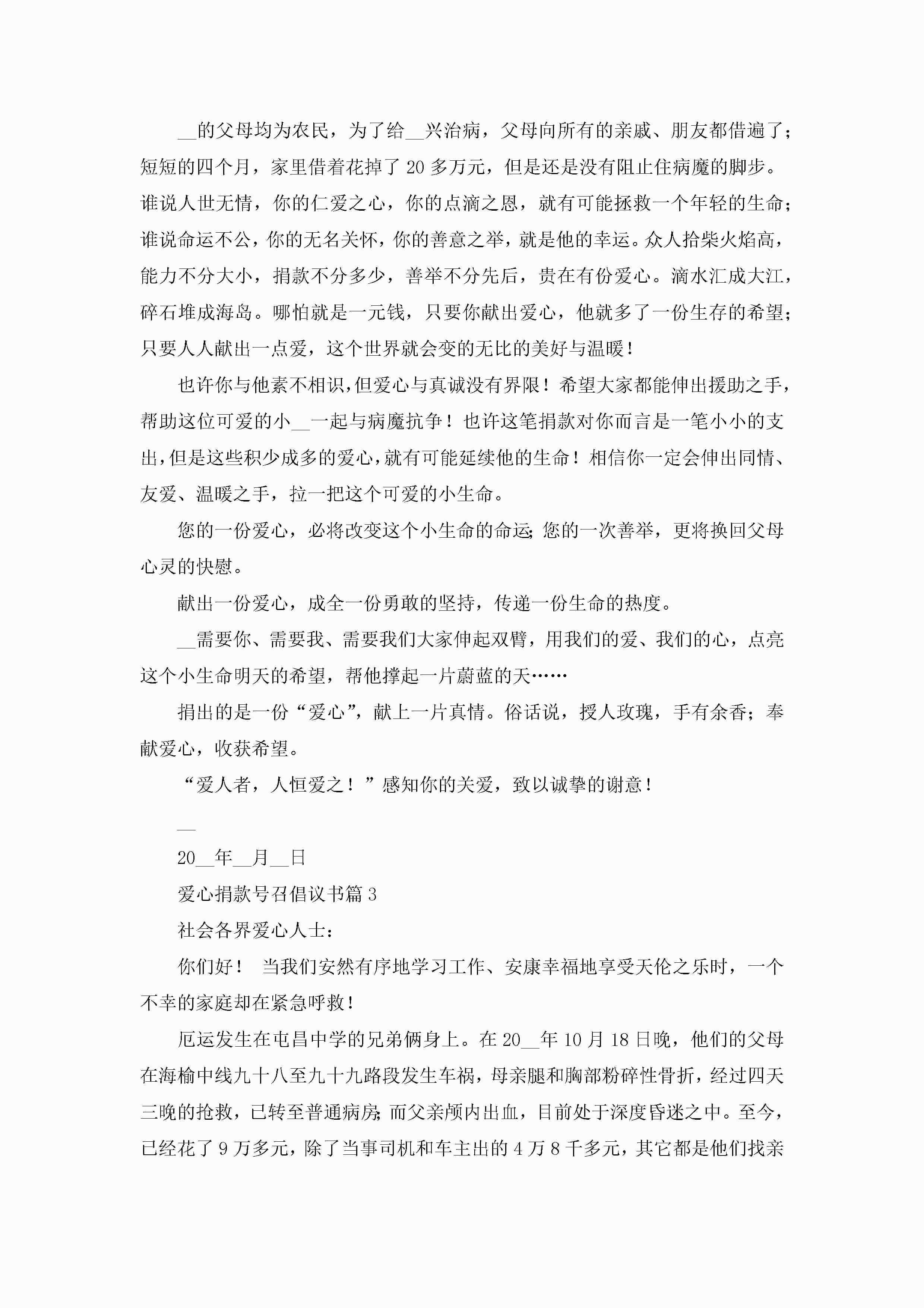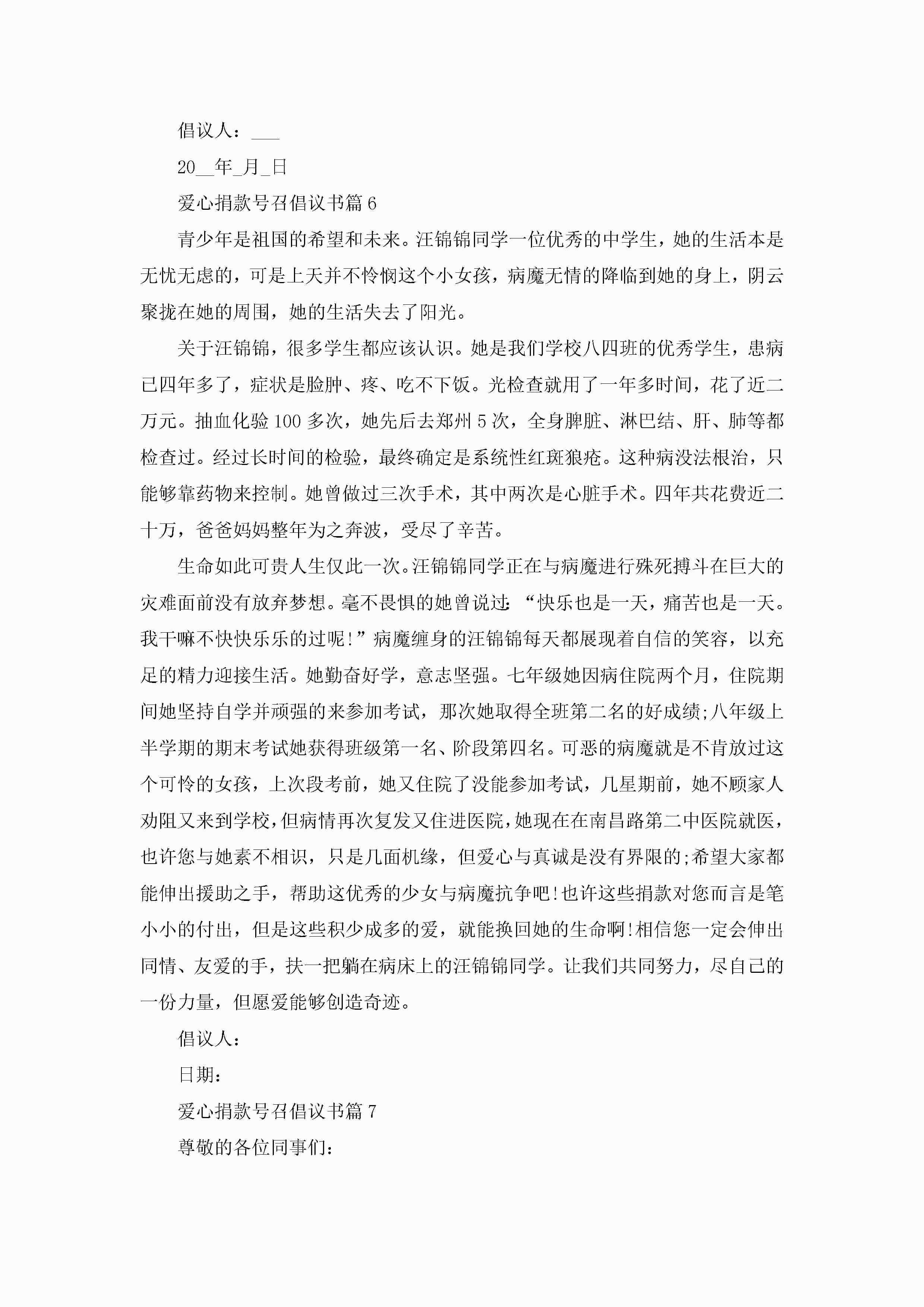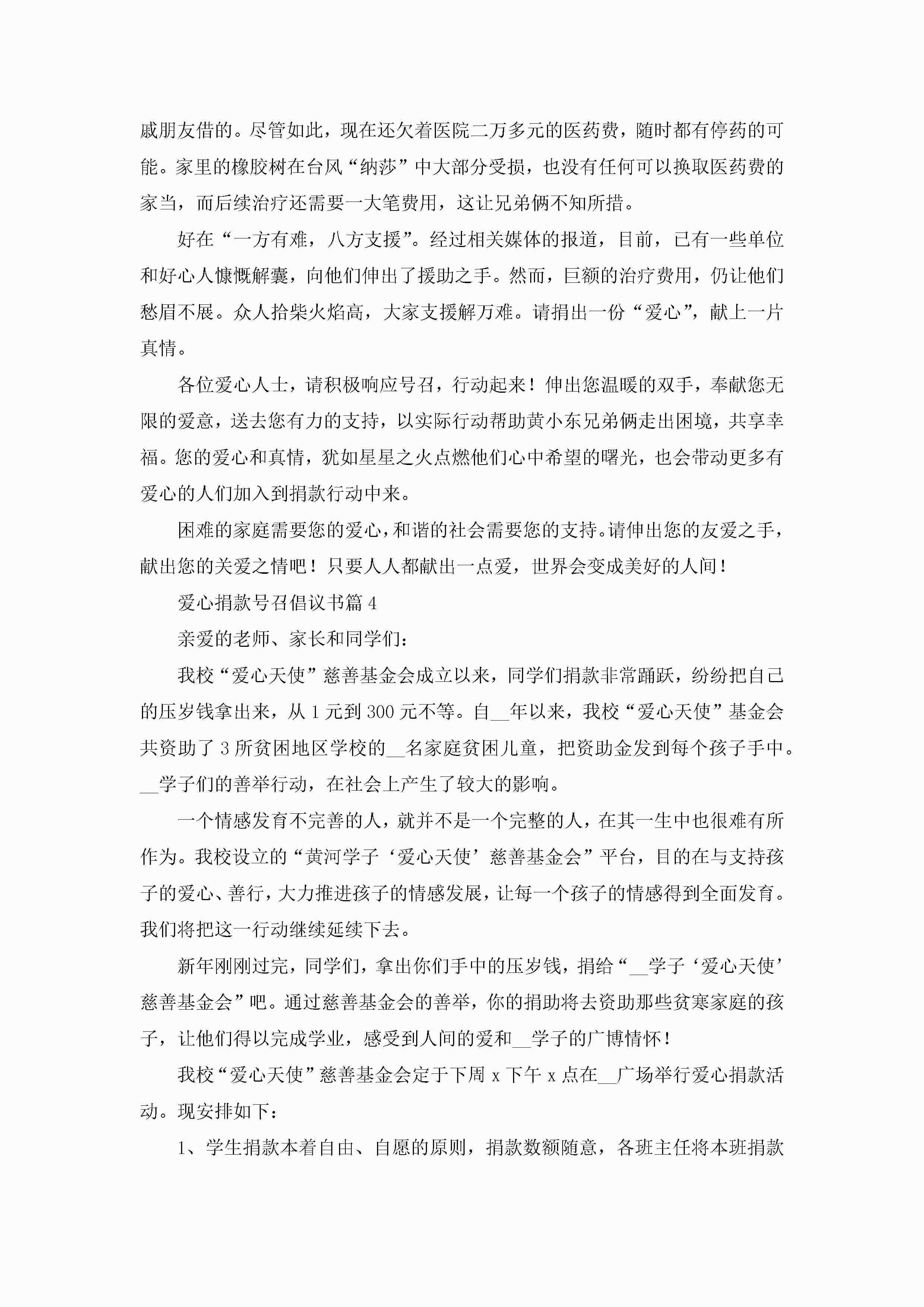 爱心捐款号召倡议书七篇精选2023jugei3月22日 16:26发布关注203 爱心捐款号召倡议书七篇精选2023此内容为付费资源,请付费后查看¥10.9 单篇文档限时特惠¥15个人会员开通企业会员开通立即下载无需登陆!可直接快捷下载单个模板付费资源© 版权声明THE ENDWord模板# 实用文档# 实用模板# 信函模板# 倡议书# 爱心捐款号召倡议书七篇精选 如有问题,可点击最底部“联系我们”联系客服 分享QQ空间微博QQ好友海报分享复制链接收藏