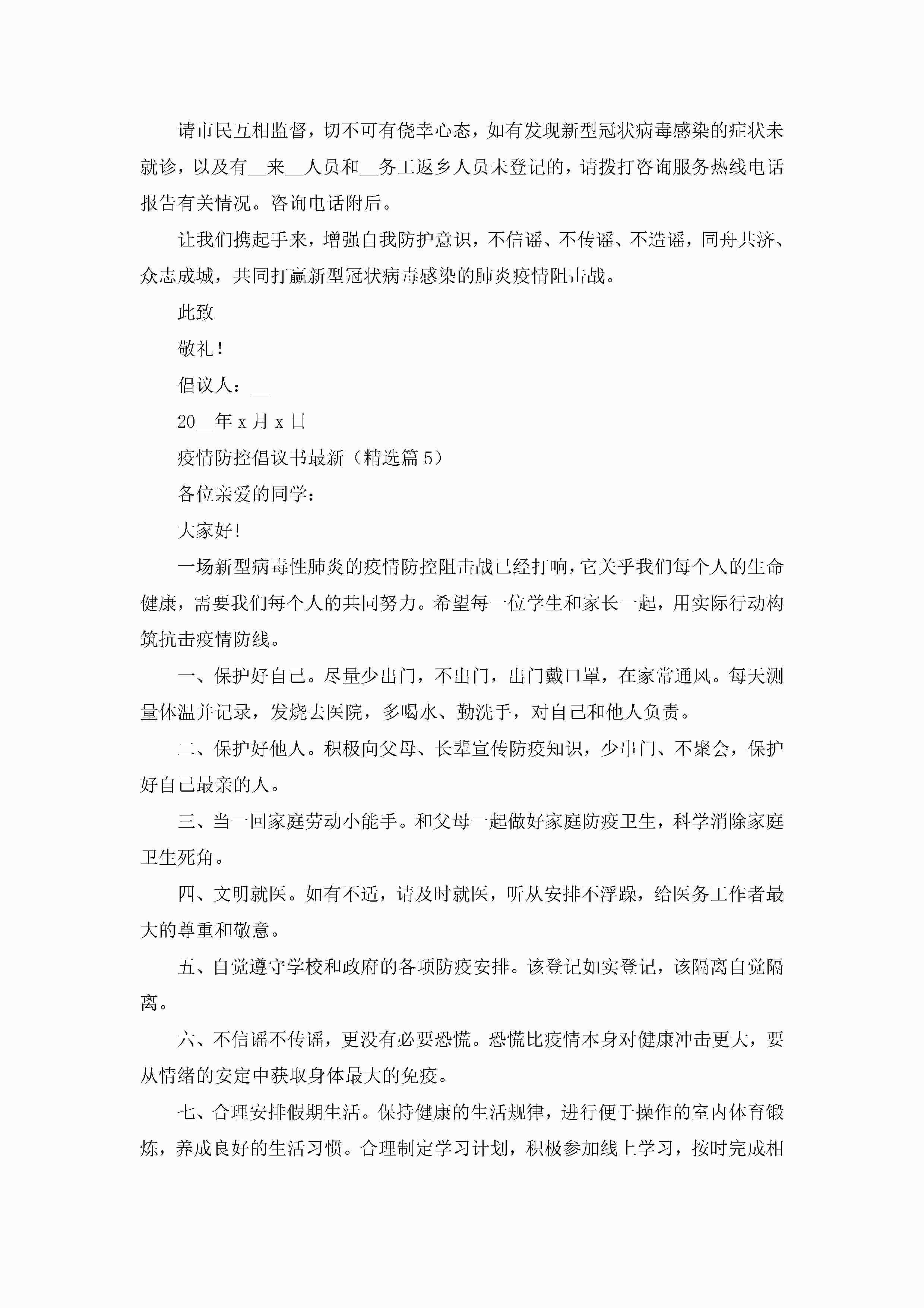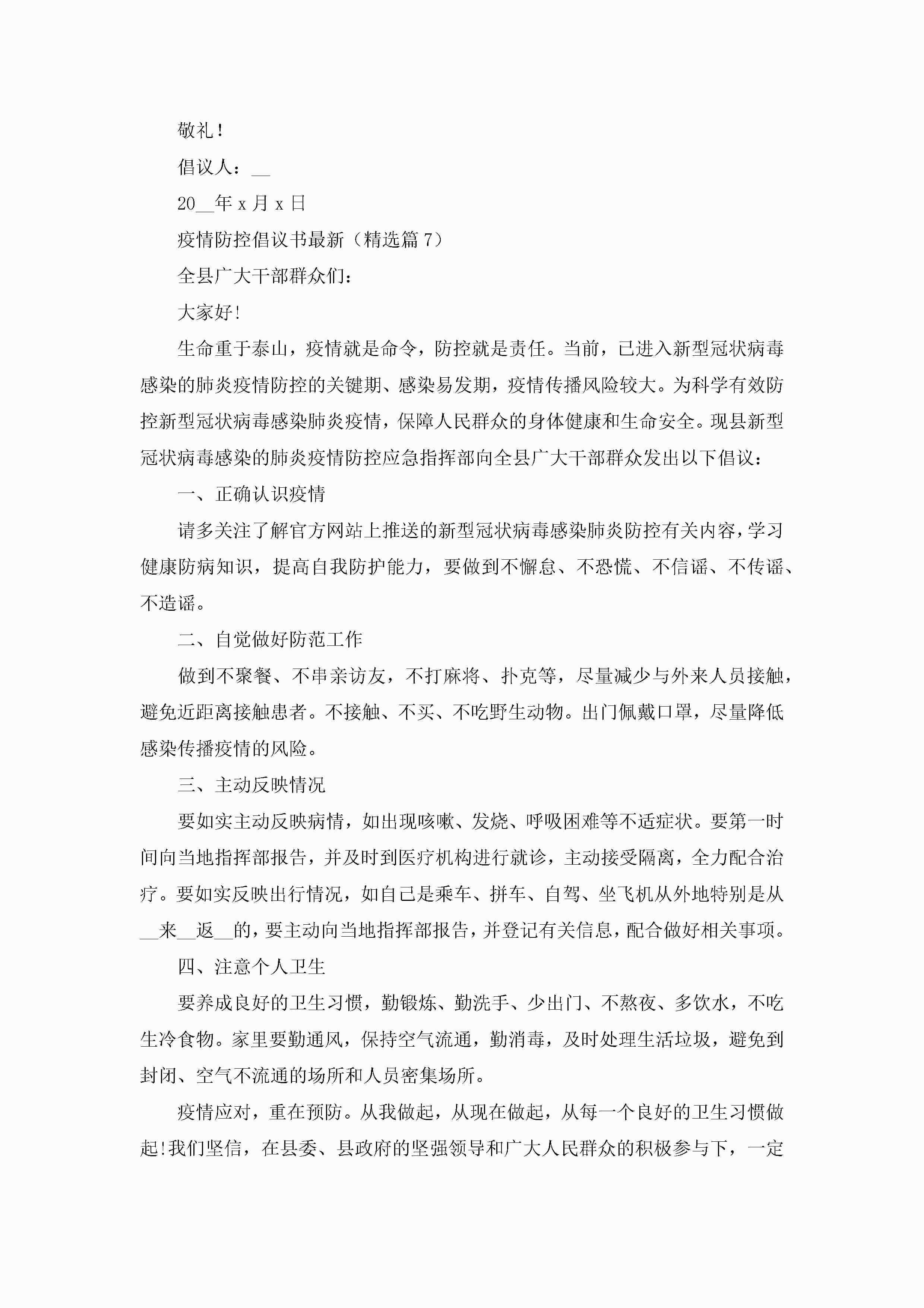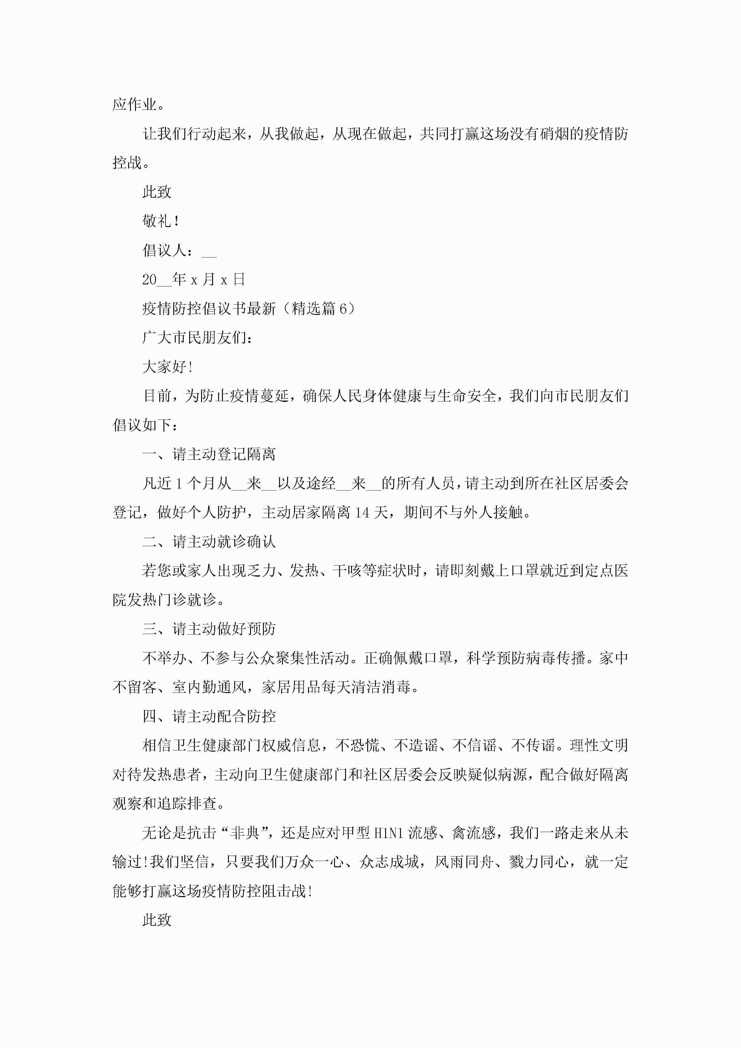 疫情防控倡议书最新【通用8篇】jugei3月22日 16:26发布关注215 疫情防控倡议书最新【通用8篇】此内容为付费资源,请付费后查看¥10.9 单篇文档限时特惠¥15个人会员开通企业会员开通立即下载无需登陆!可直接快捷下载单个模板付费资源© 版权声明THE ENDWord模板# 实用文档# 实用模板# 信函模板# 倡议书# 疫情防控倡议书最新8篇 如有问题,可点击最底部“联系我们”联系客服 分享QQ空间微博QQ好友海报分享复制链接收藏
