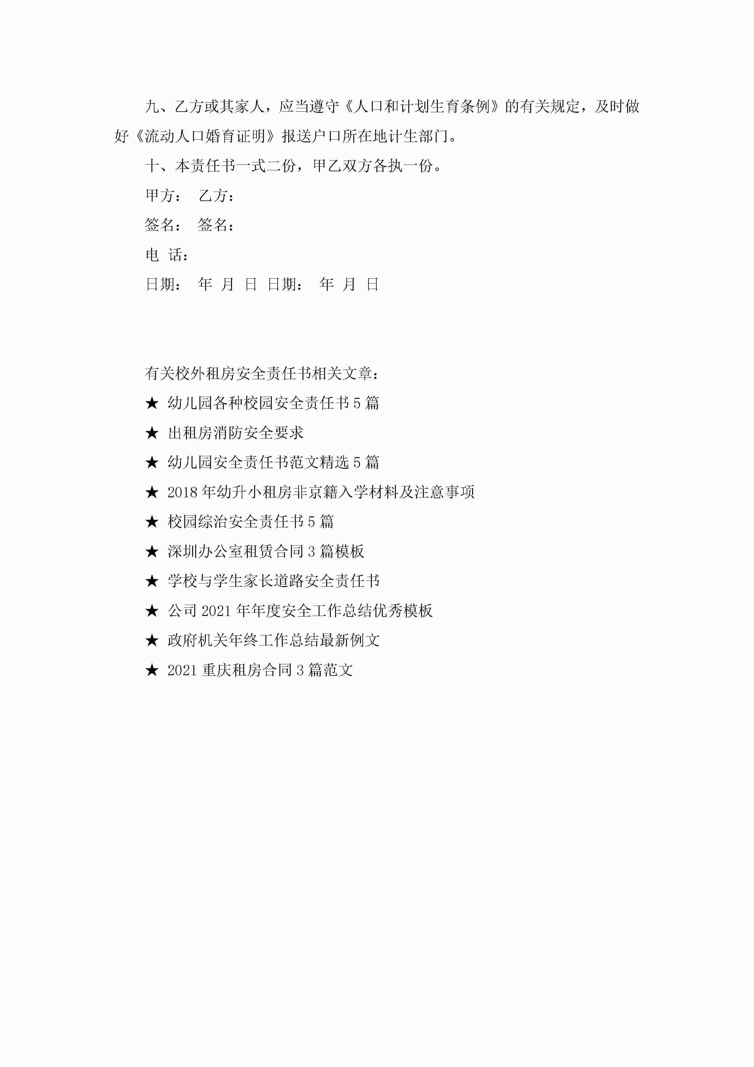 有关校外租房安全责任书5篇jugei3月22日 16:26发布关注206 有关校外租房安全责任书5篇此内容为付费资源,请付费后查看¥10.9 单篇文档限时特惠¥15个人会员开通企业会员开通立即下载无需登陆!可直接快捷下载单个模板付费资源© 版权声明THE ENDWord模板# 实用文档# 实用模板# 信函模板# 责任书 如有问题,可点击最底部“联系我们”联系客服 分享QQ空间微博QQ好友海报分享复制链接收藏