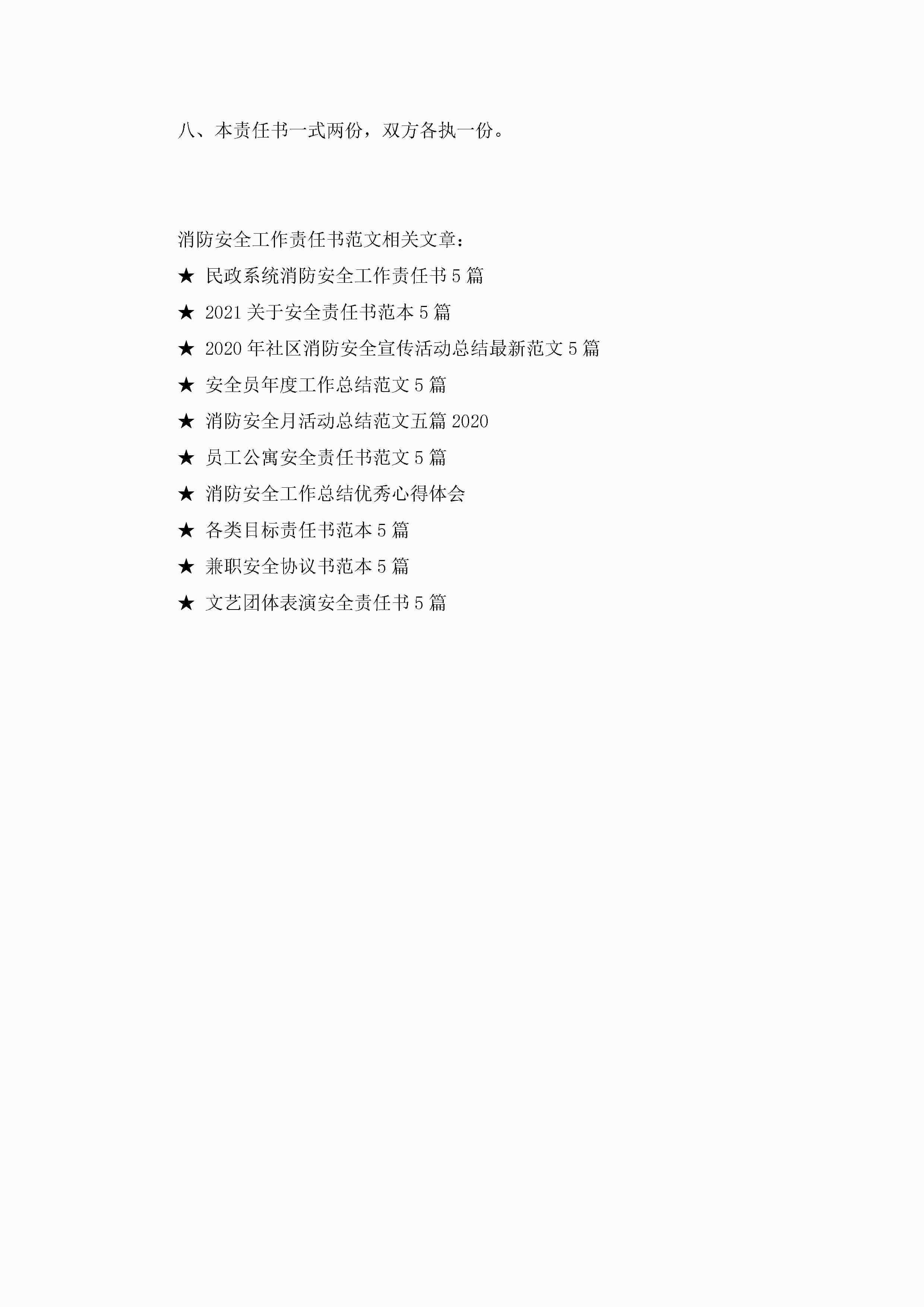 消防安全工作责任书范文5篇jugei3月22日 16:27发布关注229 消防安全工作责任书范文5篇此内容为付费资源,请付费后查看¥10.9 单篇文档限时特惠¥15个人会员开通企业会员开通立即下载无需登陆!可直接快捷下载单个模板付费资源© 版权声明THE ENDWord模板# 实用文档# 实用模板# 信函模板# 责任书 如有问题,可点击最底部“联系我们”联系客服 分享QQ空间微博QQ好友海报分享复制链接收藏