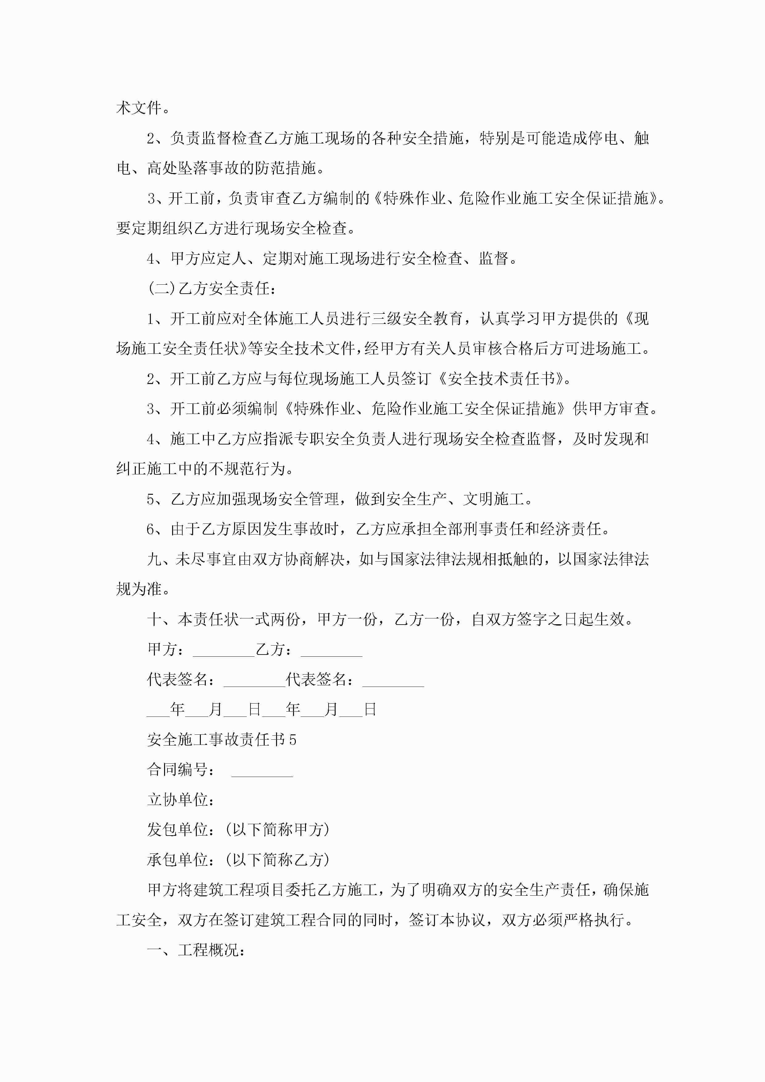 关于安全施工事故责任书5篇jugei3月22日 16:27发布关注297 关于安全施工事故责任书5篇此内容为付费资源,请付费后查看¥10.9 单篇文档限时特惠¥15个人会员开通企业会员开通立即下载无需登陆!可直接快捷下载单个模板付费资源© 版权声明THE ENDWord模板# 实用文档# 实用模板# 信函模板# 责任书 如有问题,可点击最底部“联系我们”联系客服 分享QQ空间微博QQ好友海报分享复制链接收藏