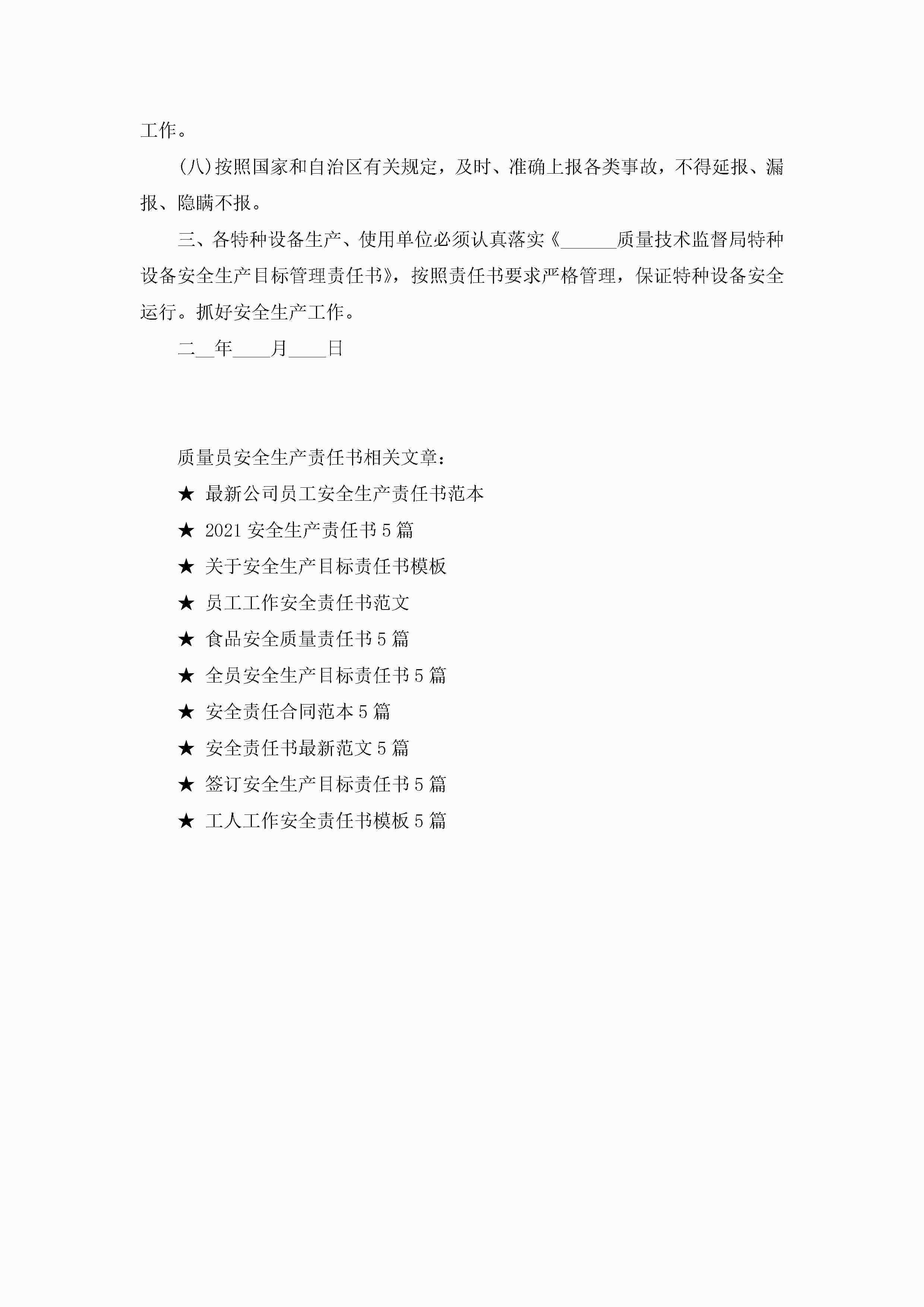质量员安全生产责任书5篇jugei3月22日 16:27发布关注216 质量员安全生产责任书5篇此内容为付费资源,请付费后查看¥10.9 单篇文档限时特惠¥15个人会员开通企业会员开通立即下载无需登陆!可直接快捷下载单个模板付费资源© 版权声明THE ENDWord模板# 实用文档# 实用模板# 信函模板# 责任书 如有问题,可点击最底部“联系我们”联系客服 分享QQ空间微博QQ好友海报分享复制链接收藏