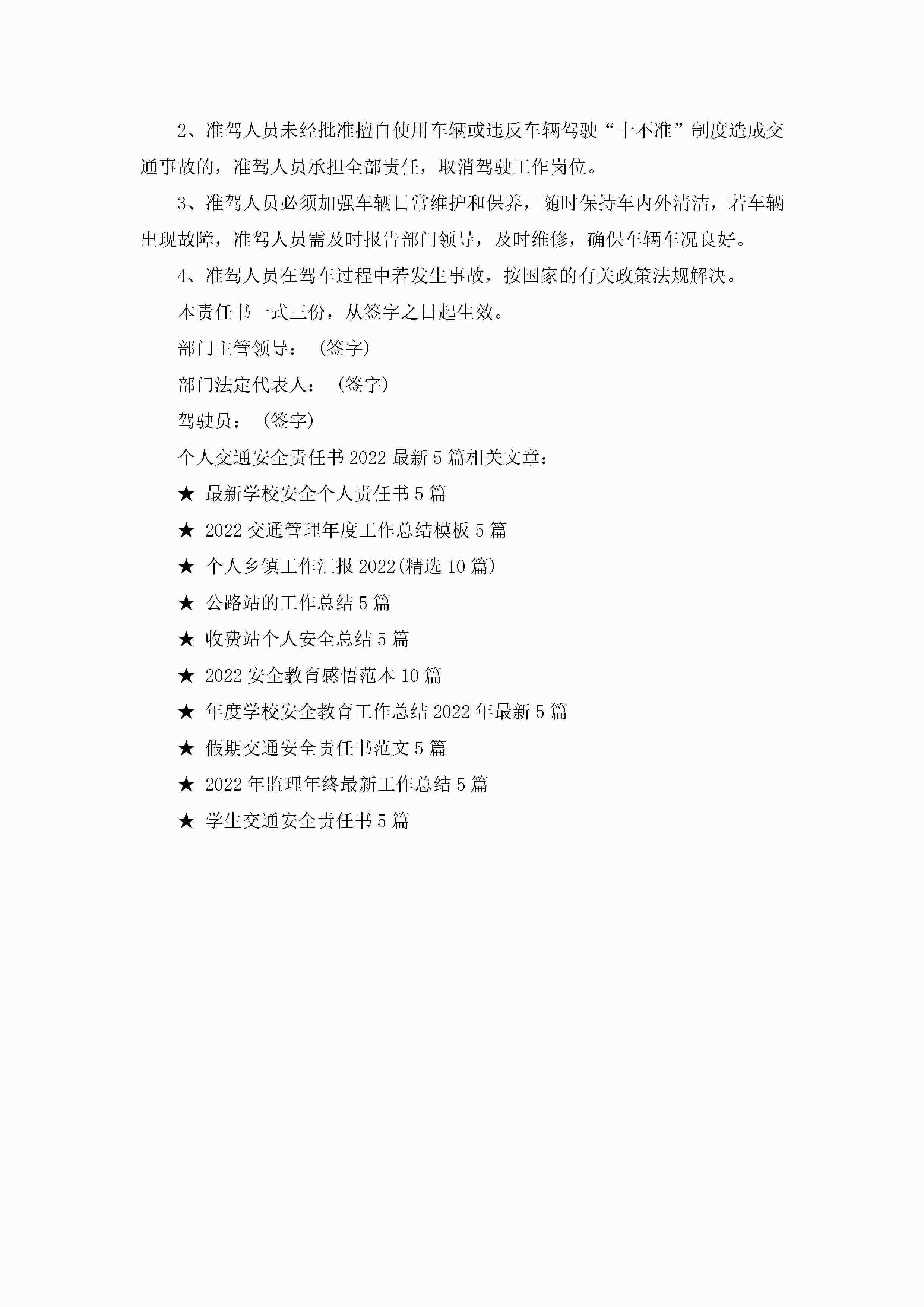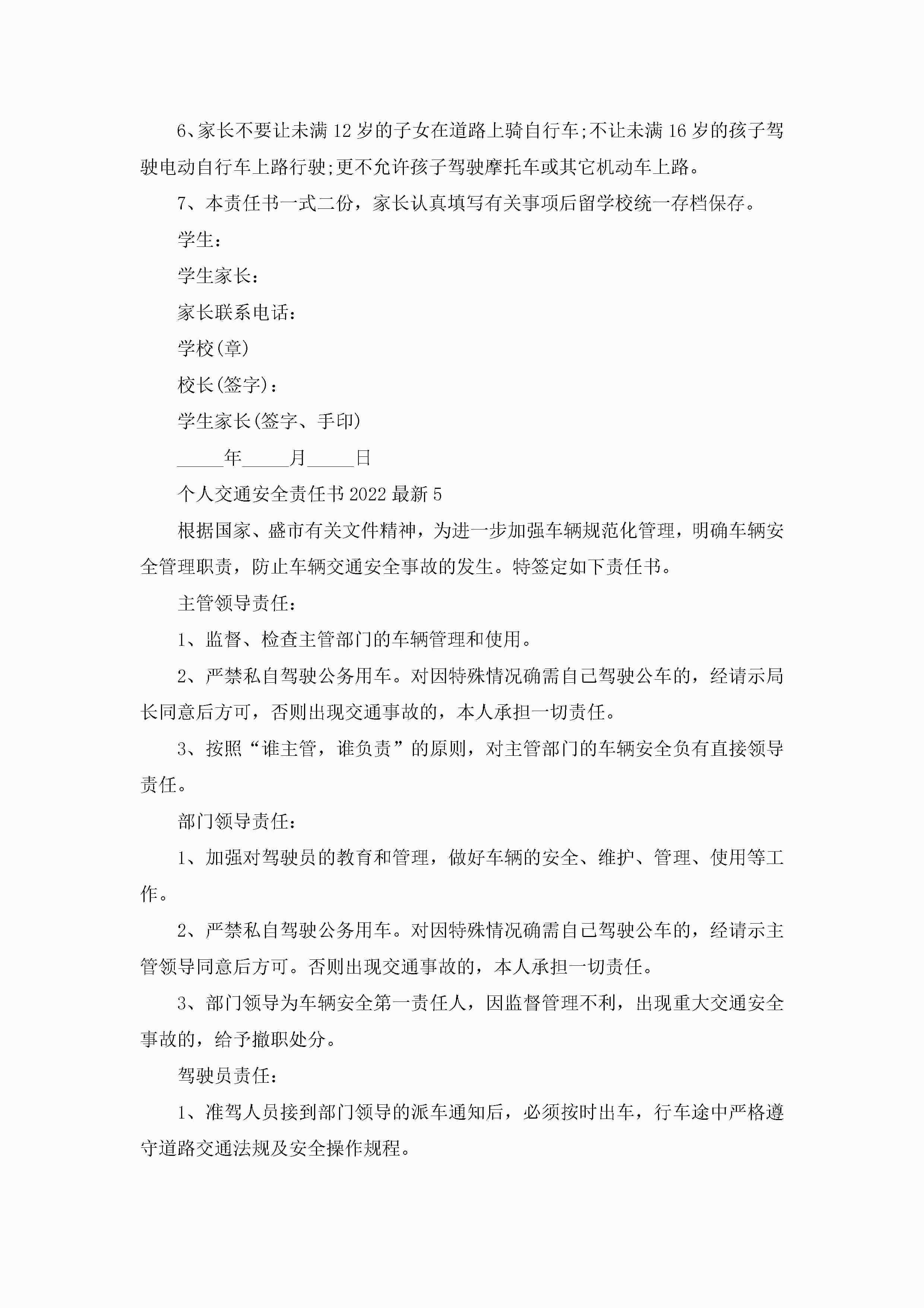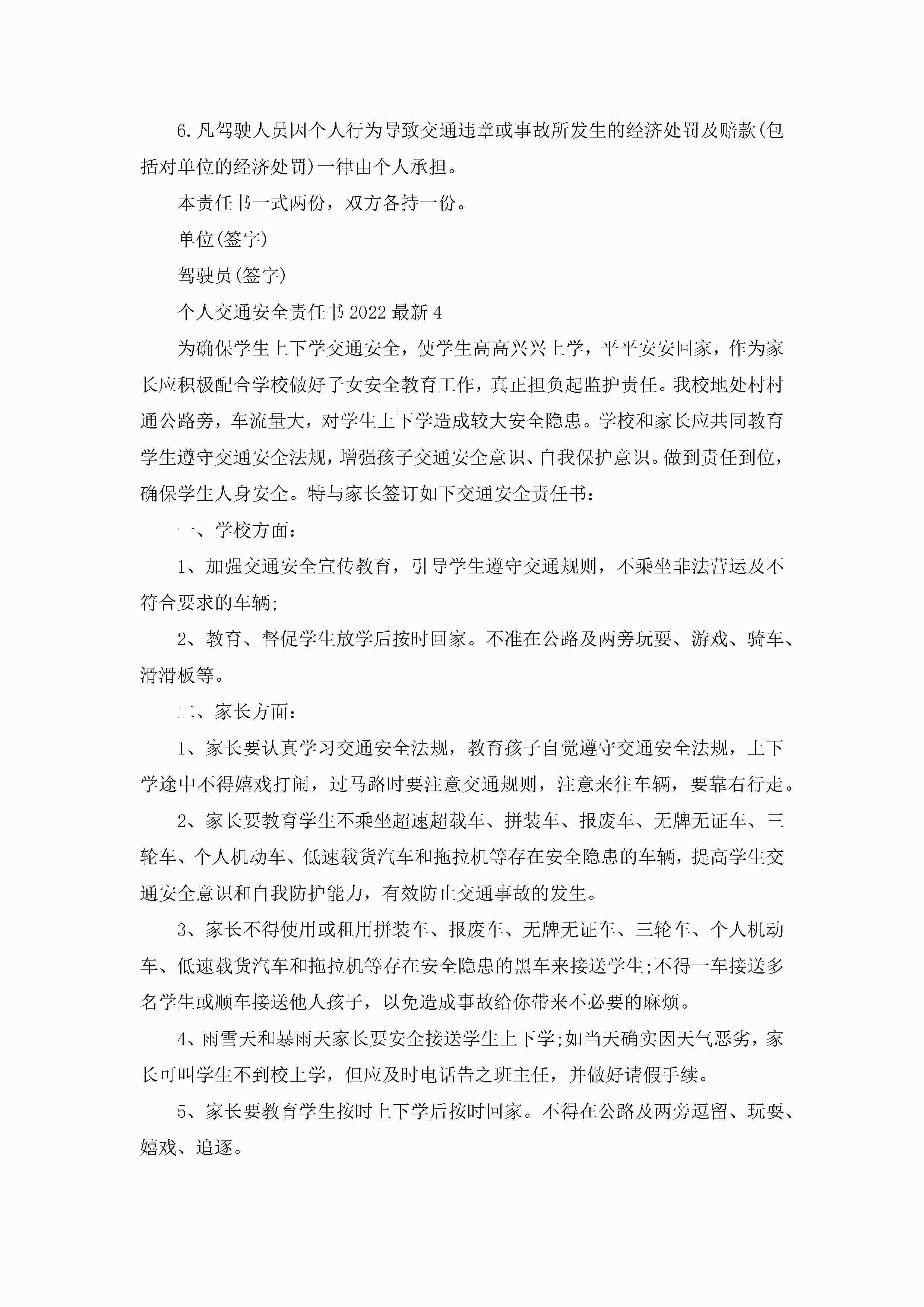 关于个人交通安全责任书2022最新5篇jugei3月22日 16:27发布关注328 关于个人交通安全责任书2022最新5篇此内容为付费资源,请付费后查看¥10.9 单篇文档限时特惠¥15个人会员开通企业会员开通立即下载无需登陆!可直接快捷下载单个模板付费资源© 版权声明THE ENDWord模板# 实用文档# 实用模板# 信函模板# 责任书 如有问题,可点击最底部“联系我们”联系客服 分享QQ空间微博QQ好友海报分享复制链接收藏