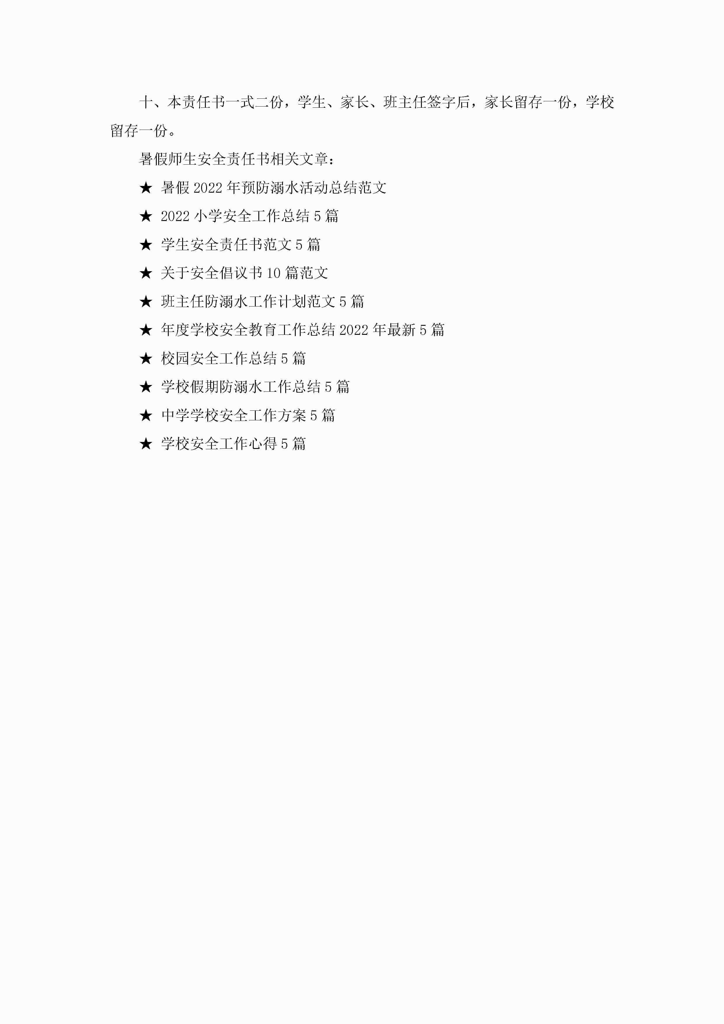 暑假师生安全责任书5篇jugei3月22日 16:27发布关注237 暑假师生安全责任书5篇此内容为付费资源,请付费后查看¥10.9 单篇文档限时特惠¥15个人会员开通企业会员开通立即下载无需登陆!可直接快捷下载单个模板付费资源© 版权声明THE ENDWord模板# 实用文档# 实用模板# 信函模板# 责任书 如有问题,可点击最底部“联系我们”联系客服 分享QQ空间微博QQ好友海报分享复制链接收藏