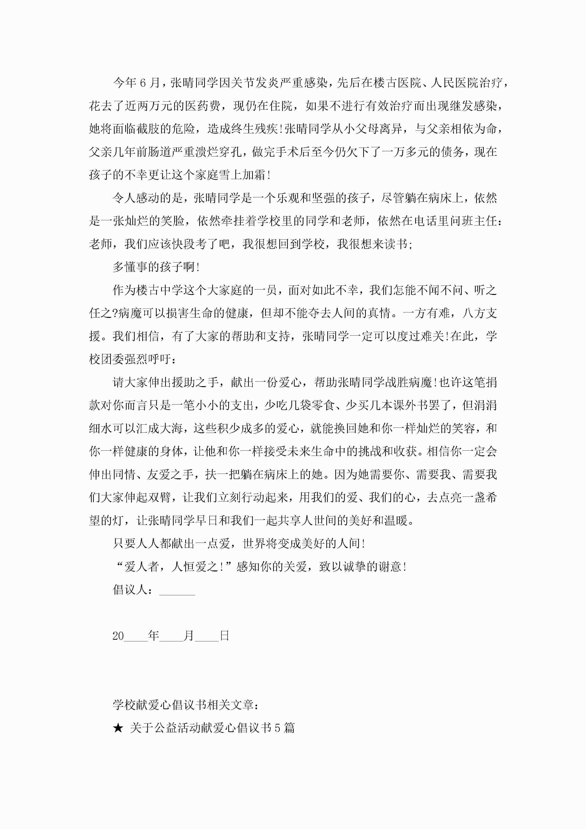 学校献爱心倡议书5篇jugei3月22日 16:28发布关注192 学校献爱心倡议书5篇此内容为付费资源,请付费后查看¥10.9 单篇文档限时特惠¥15个人会员开通企业会员开通立即下载无需登陆!可直接快捷下载单个模板付费资源© 版权声明THE ENDWord模板# 实用文档# 实用模板# 信函模板# 倡议书 如有问题,可点击最底部“联系我们”联系客服 分享QQ空间微博QQ好友海报分享复制链接收藏