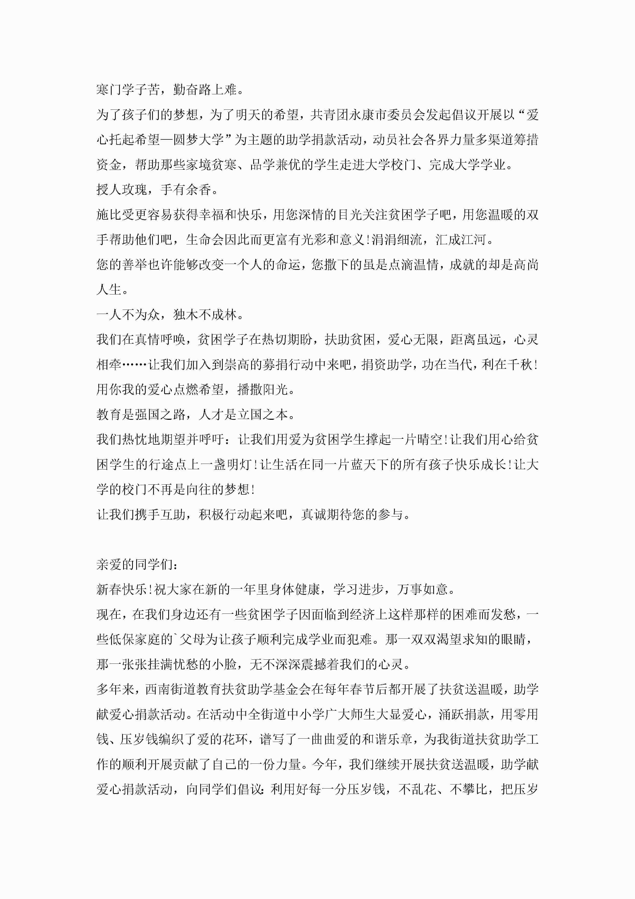 助学基金会捐款倡议书5篇jugei3月22日 16:28发布关注211 助学基金会捐款倡议书5篇此内容为付费资源,请付费后查看¥10.9 单篇文档限时特惠¥15个人会员开通企业会员开通立即下载无需登陆!可直接快捷下载单个模板付费资源© 版权声明THE ENDWord模板# 实用文档# 实用模板# 信函模板# 倡议书 如有问题,可点击最底部“联系我们”联系客服 分享QQ空间微博QQ好友海报分享复制链接收藏