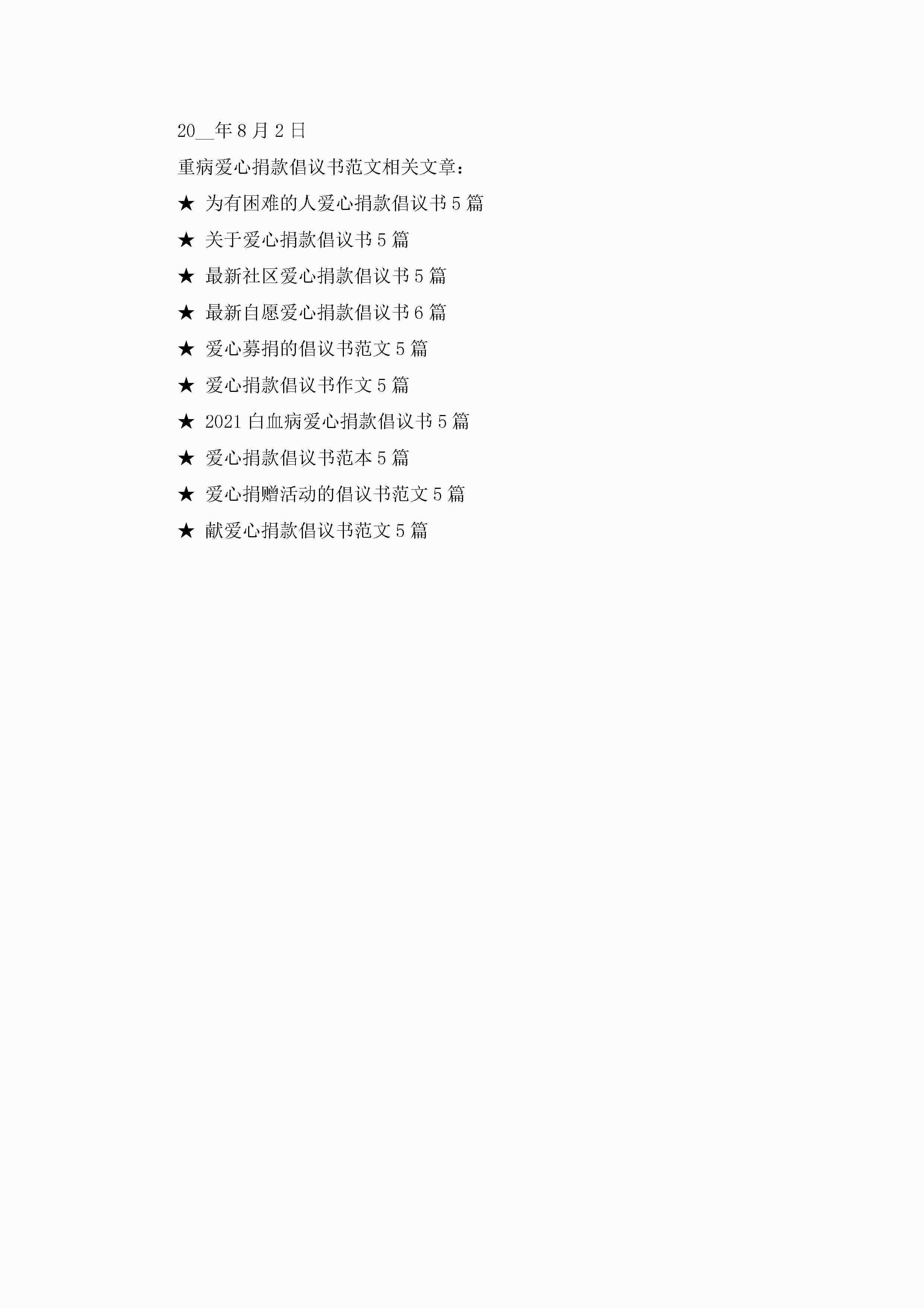 重病爱心捐款倡议书范文5篇jugei3月22日 16:28发布关注193 重病爱心捐款倡议书范文5篇此内容为付费资源,请付费后查看¥10.9 单篇文档限时特惠¥15个人会员开通企业会员开通立即下载无需登陆!可直接快捷下载单个模板付费资源© 版权声明THE ENDWord模板# 实用文档# 实用模板# 信函模板# 倡议书 如有问题,可点击最底部“联系我们”联系客服 分享QQ空间微博QQ好友海报分享复制链接收藏