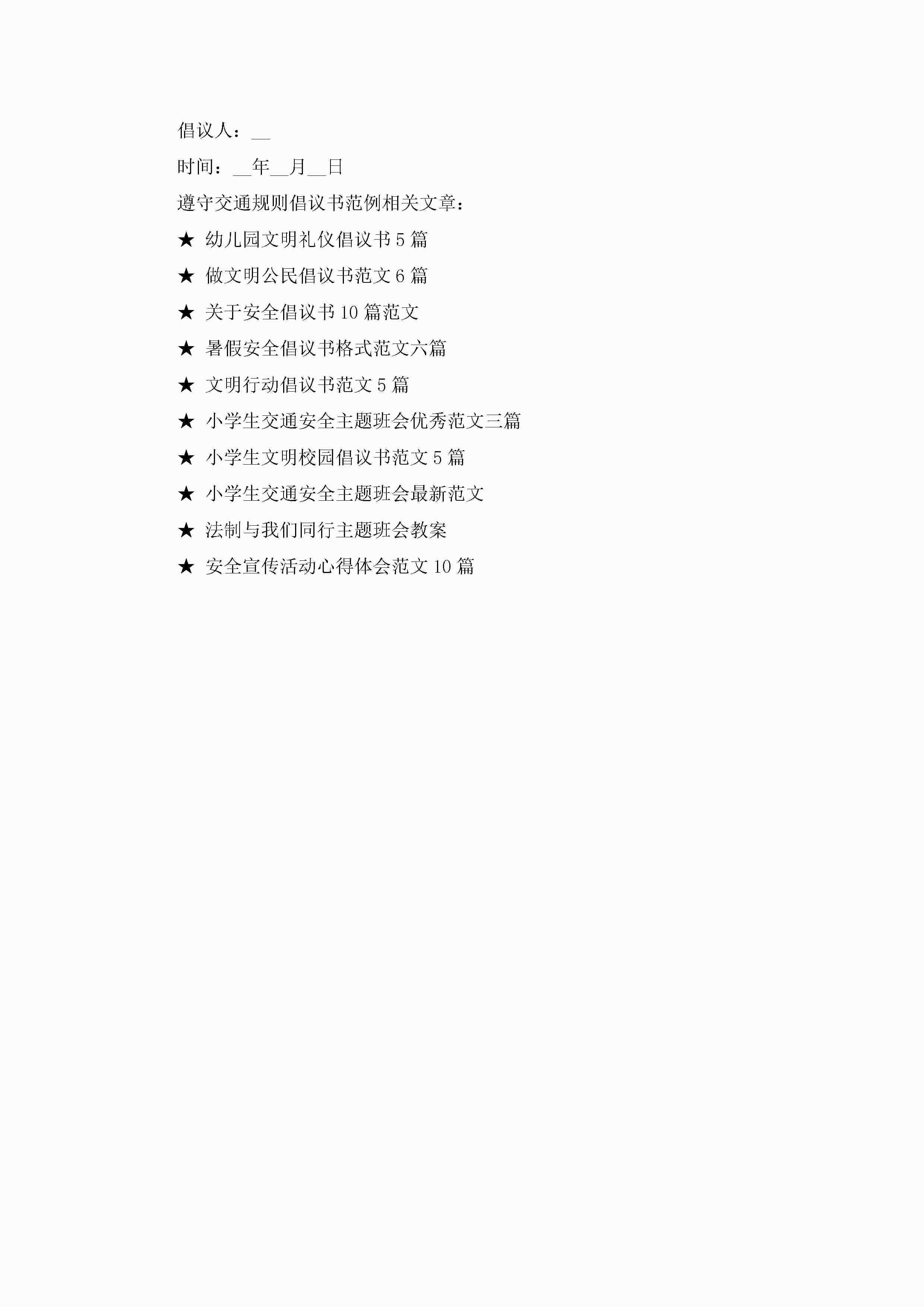 遵守交通规则倡议书范例5篇jugei3月22日 16:28发布关注196 遵守交通规则倡议书范例5篇此内容为付费资源,请付费后查看¥10.9 单篇文档限时特惠¥15个人会员开通企业会员开通立即下载无需登陆!可直接快捷下载单个模板付费资源© 版权声明THE ENDWord模板# 实用文档# 实用模板# 信函模板# 倡议书 如有问题,可点击最底部“联系我们”联系客服 分享QQ空间微博QQ好友海报分享复制链接收藏