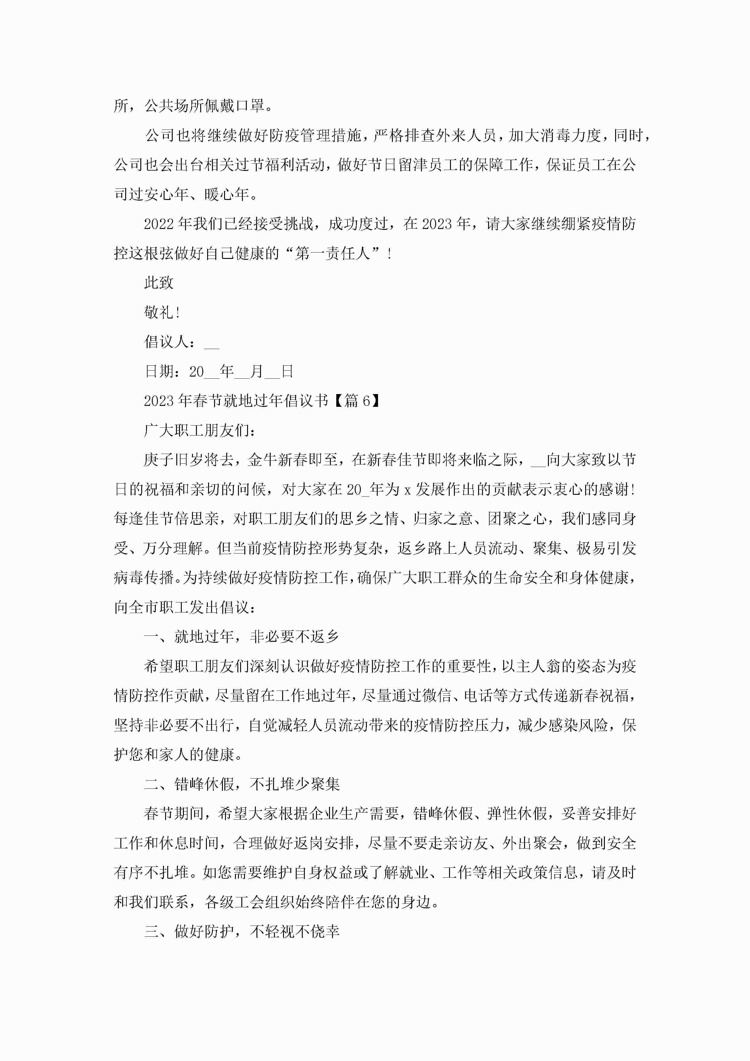 2023年春节就地过年倡议书(通用7篇)jugei3月22日 16:28发布关注193 2023年春节就地过年倡议书(通用7篇)此内容为付费资源,请付费后查看¥10.9 单篇文档限时特惠¥15个人会员开通企业会员开通立即下载无需登陆!可直接快捷下载单个模板付费资源© 版权声明THE ENDWord模板# 实用文档# 实用模板# 信函模板# 倡议书 如有问题,可点击最底部“联系我们”联系客服 分享QQ空间微博QQ好友海报分享复制链接收藏