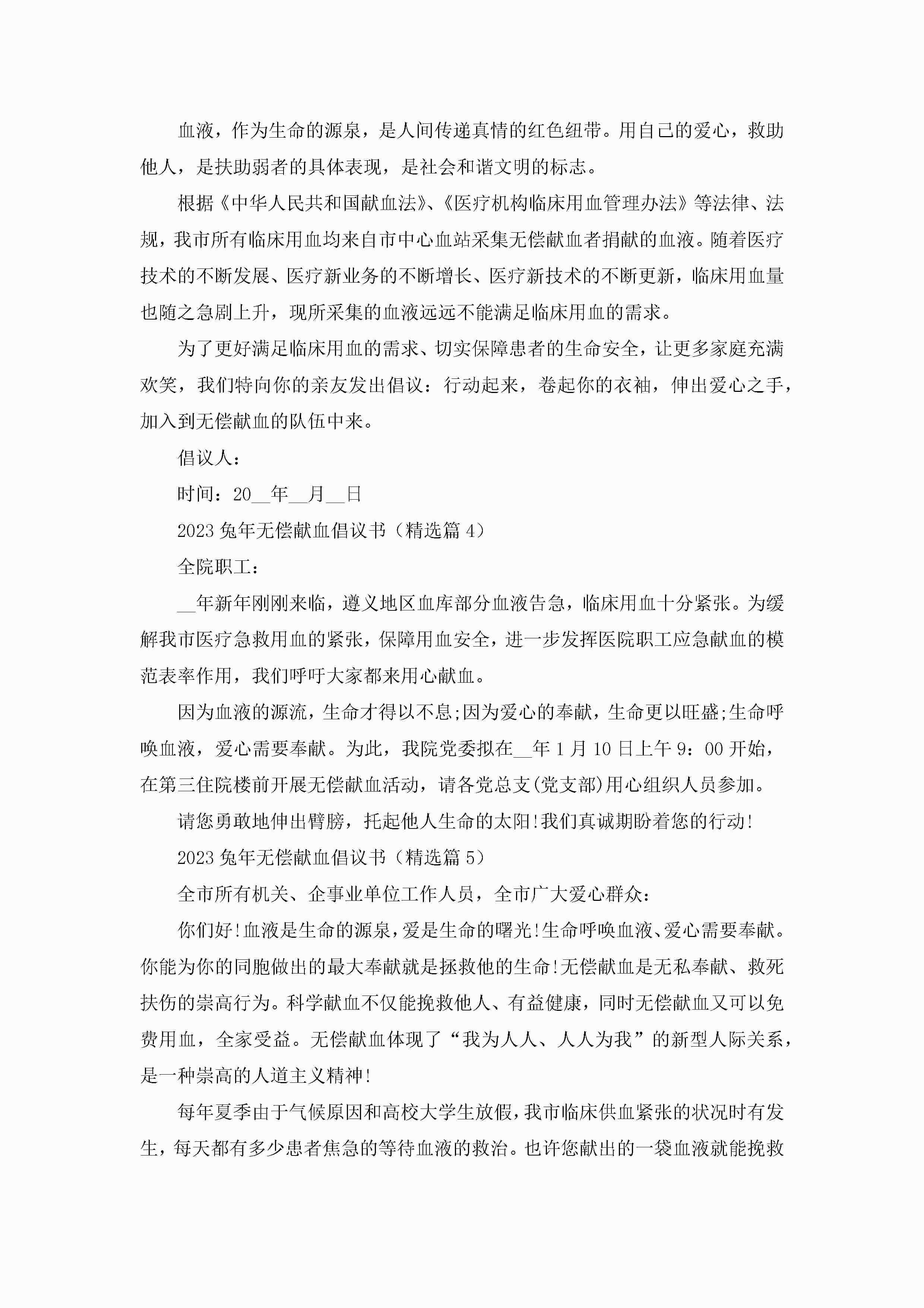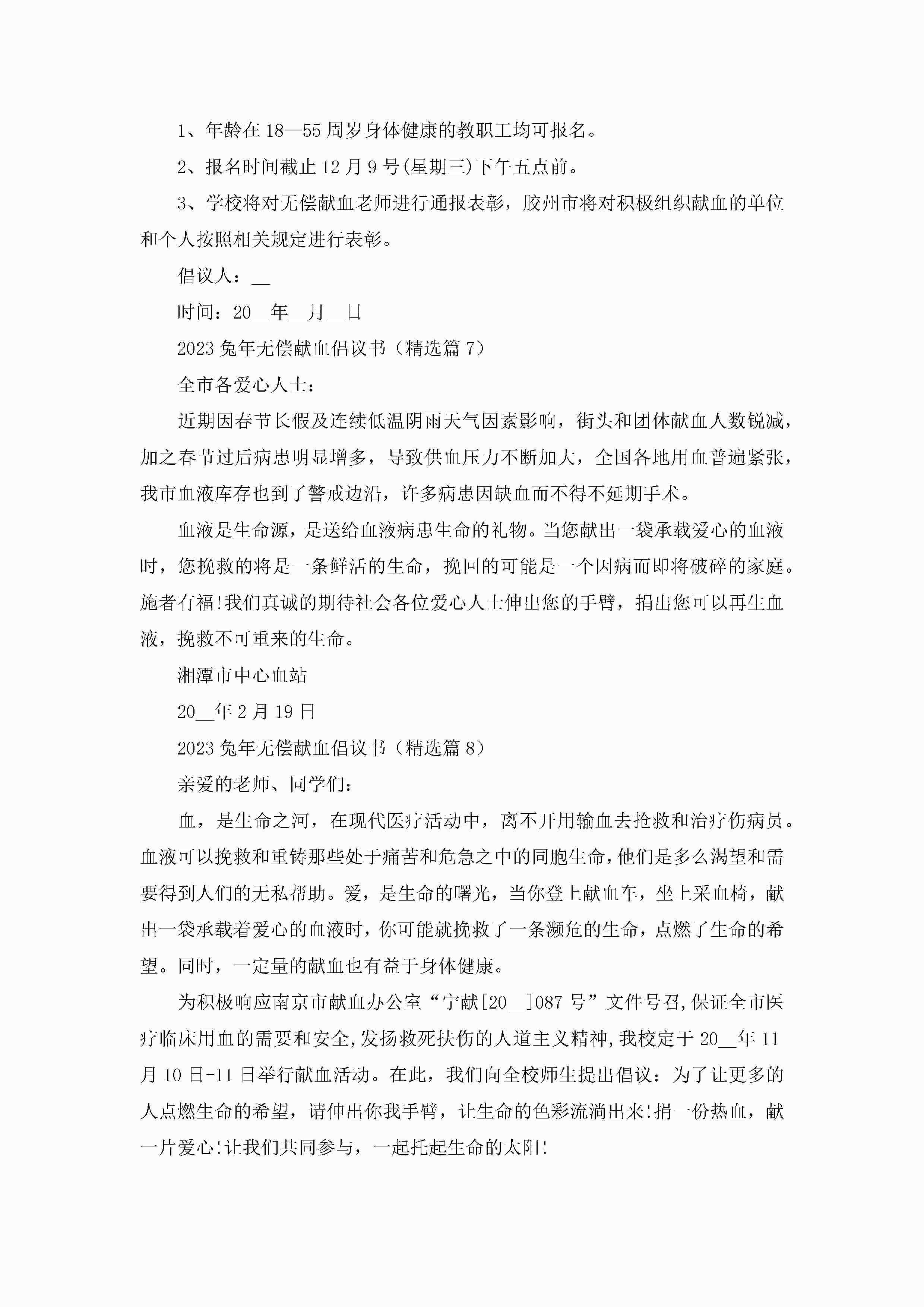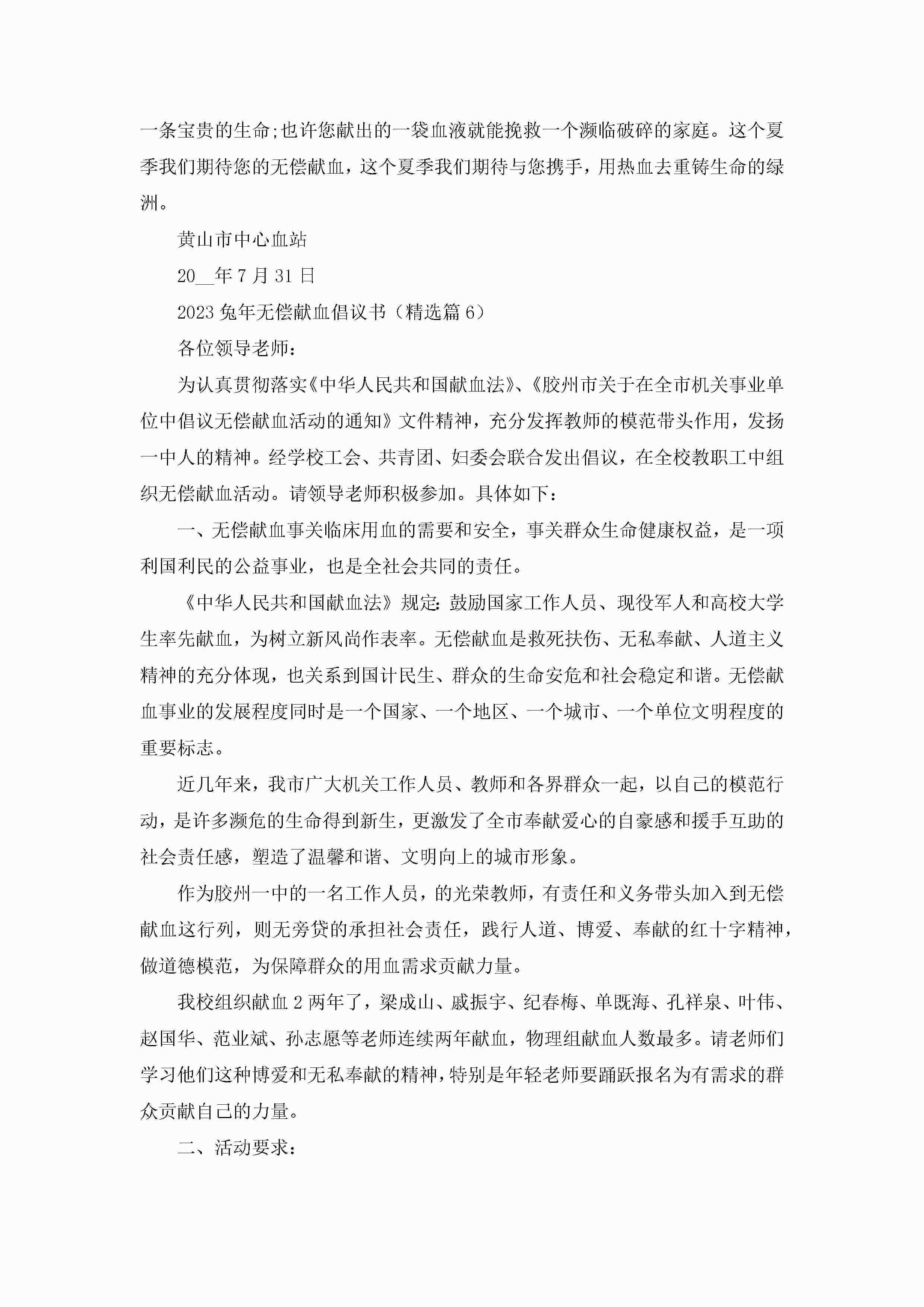 2023兔年无偿献血倡议书范文(最新8篇)jugei3月22日 16:28发布关注294 2023兔年无偿献血倡议书范文(最新8篇)此内容为付费资源,请付费后查看¥10.9 单篇文档限时特惠¥15个人会员开通企业会员开通立即下载无需登陆!可直接快捷下载单个模板付费资源© 版权声明THE ENDWord模板# 实用文档# 实用模板# 信函模板# 倡议书 如有问题,可点击最底部“联系我们”联系客服 分享QQ空间微博QQ好友海报分享复制链接收藏