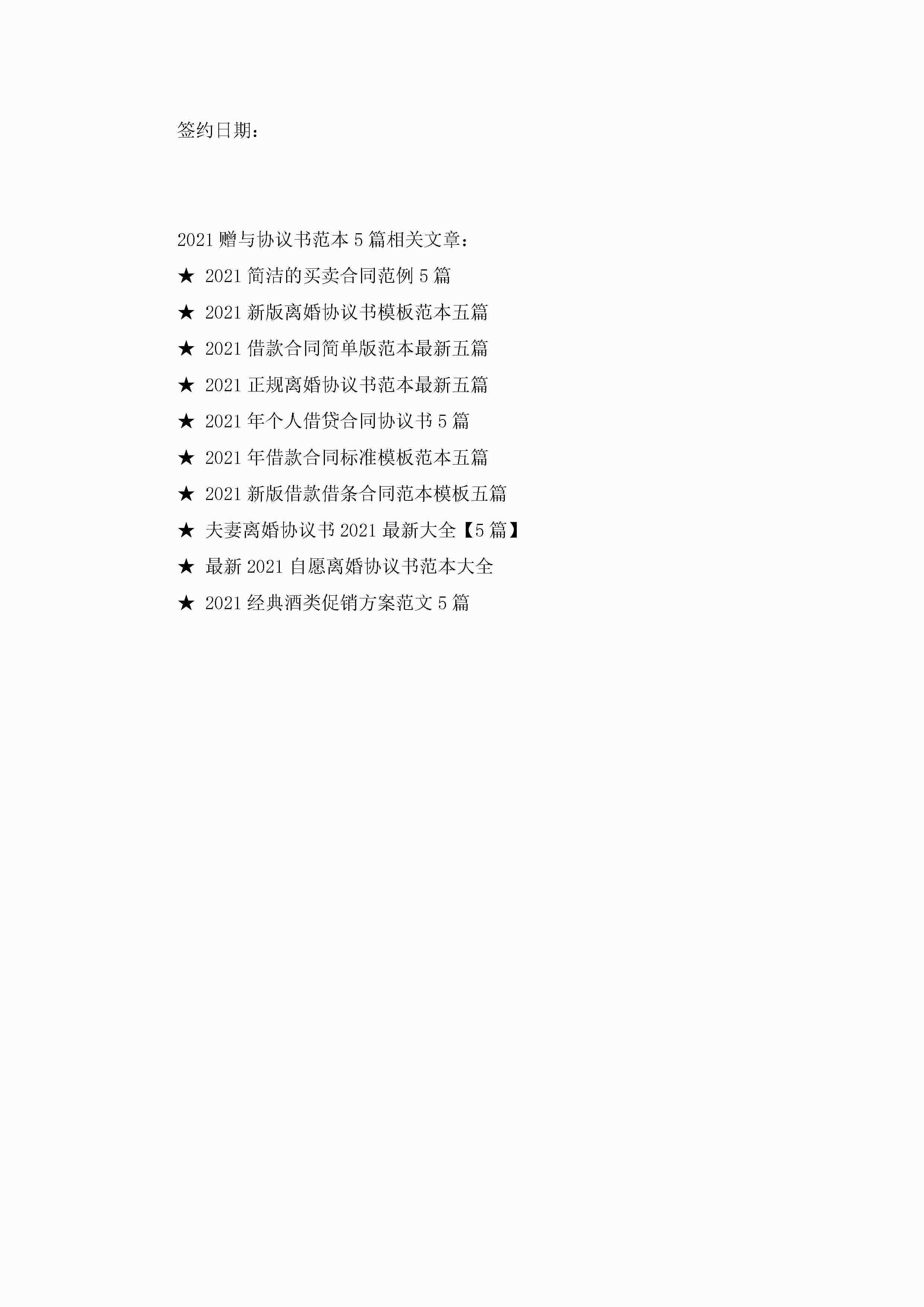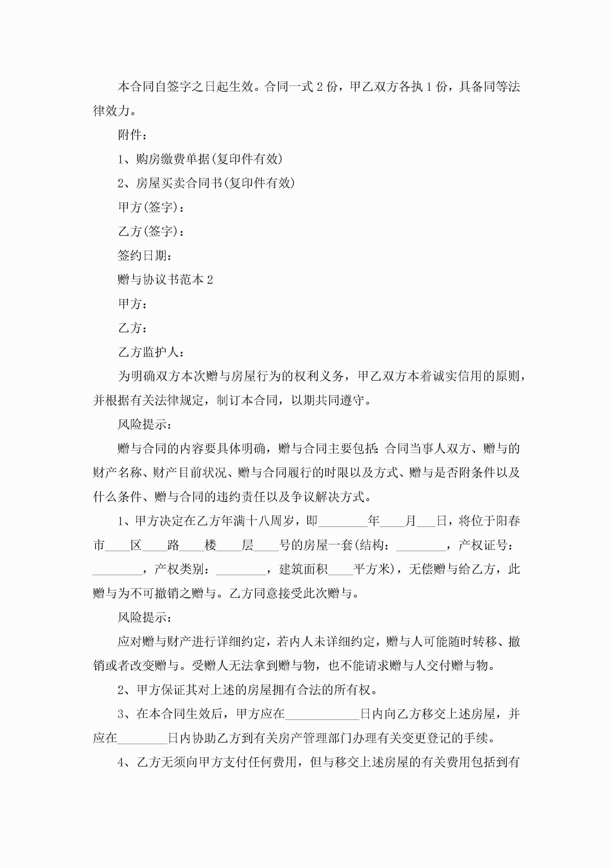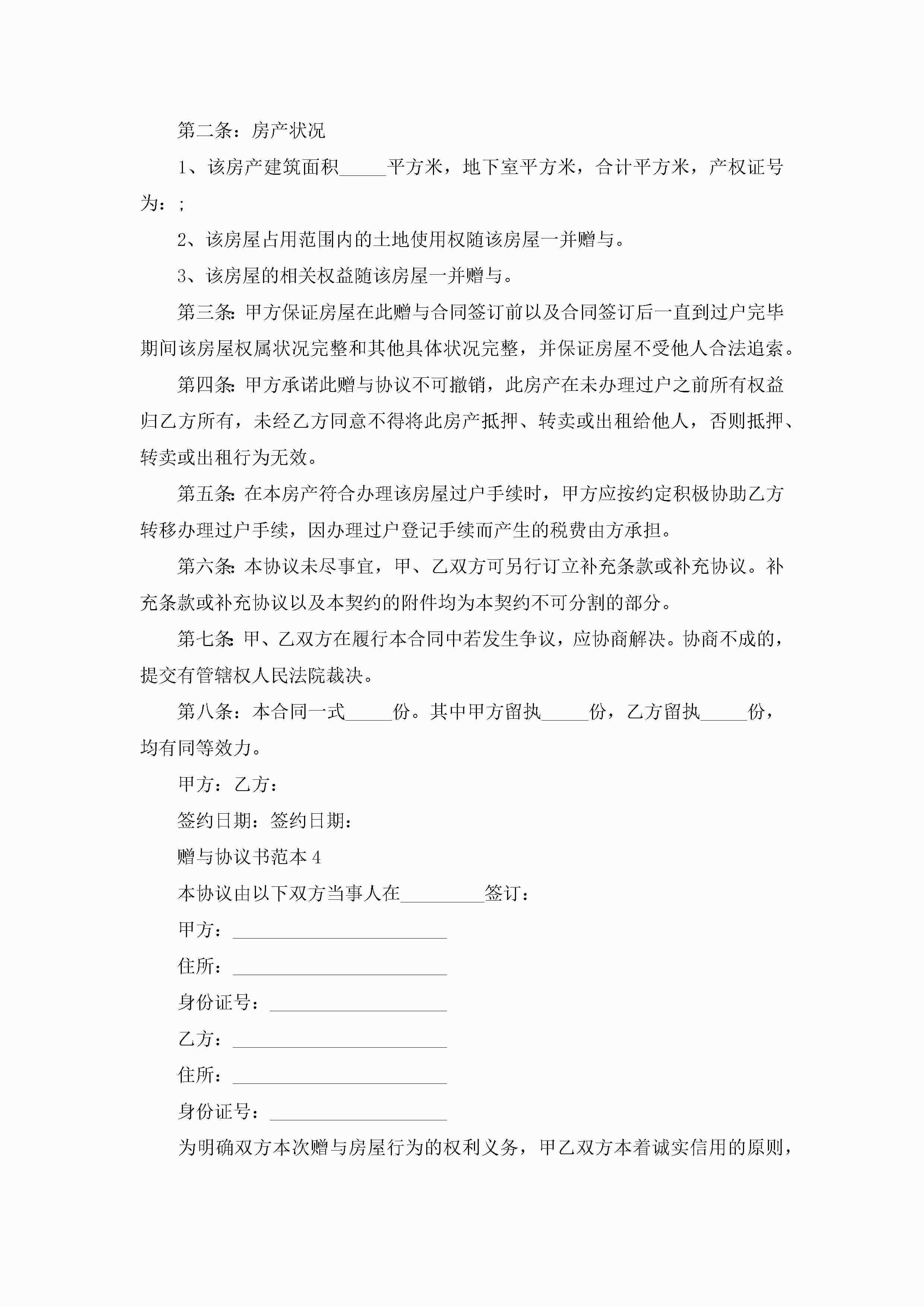 2022赠与协议书范本5篇最新jugei3月23日 01:34发布关注257 2022赠与协议书范本5篇最新此内容为付费资源,请付费后查看¥10.9 单篇文档限时特惠¥15个人会员开通企业会员开通立即下载无需登陆!可直接快捷下载单个模板付费资源© 版权声明THE ENDWord模板# 实用文档# 实用模板# 合同模板# 赠与合同 如有问题,可点击最底部“联系我们”联系客服 分享QQ空间微博QQ好友海报分享复制链接收藏