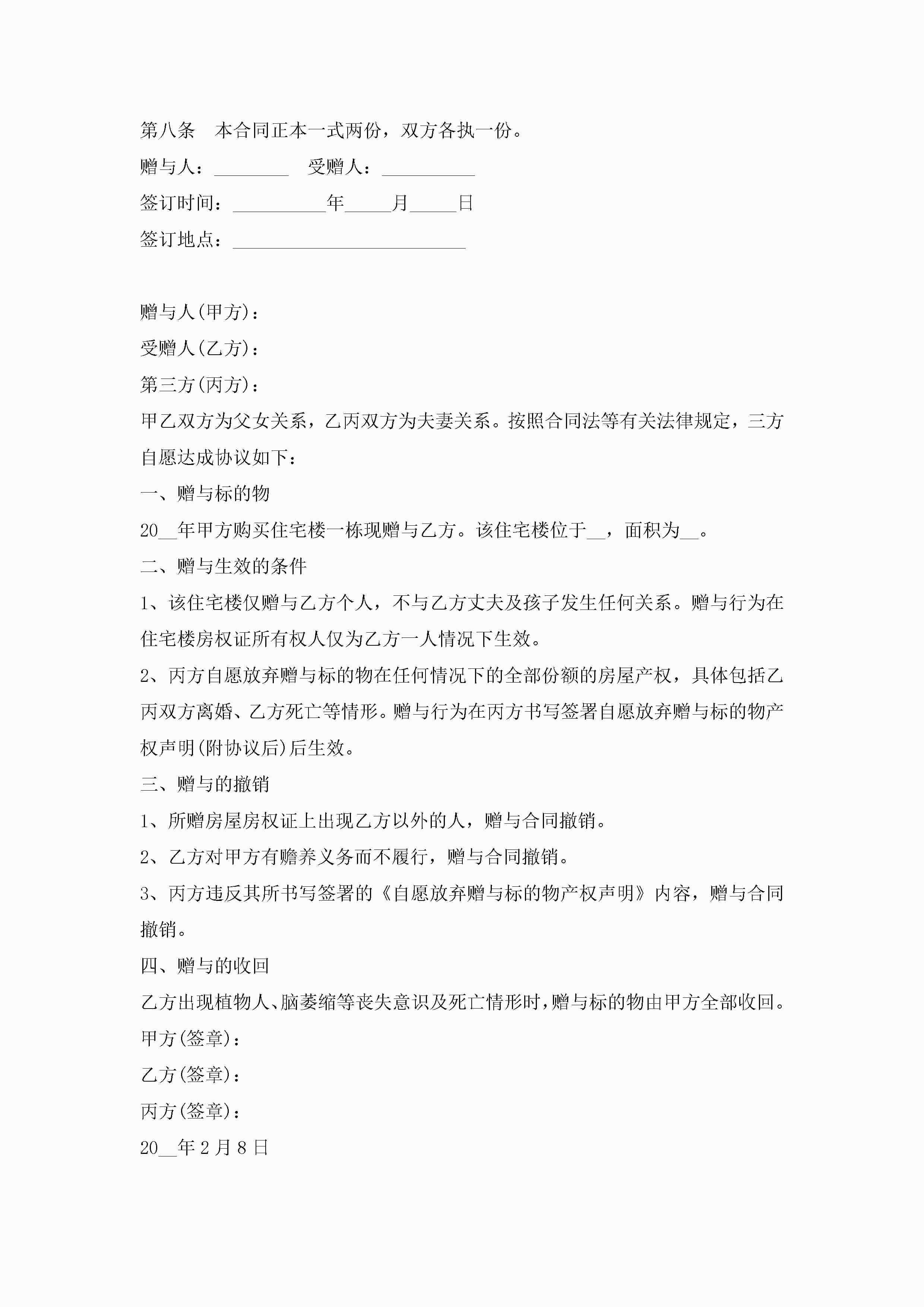 无偿赠与房产合同模板范文jugei3月23日 01:34发布关注261 无偿赠与房产合同模板范文此内容为付费资源,请付费后查看¥10.9 单篇文档限时特惠¥15个人会员开通企业会员开通立即下载无需登陆!可直接快捷下载单个模板付费资源© 版权声明THE ENDWord模板# 实用文档# 实用模板# 合同模板# 赠与合同 如有问题,可点击最底部“联系我们”联系客服 分享QQ空间微博QQ好友海报分享复制链接收藏