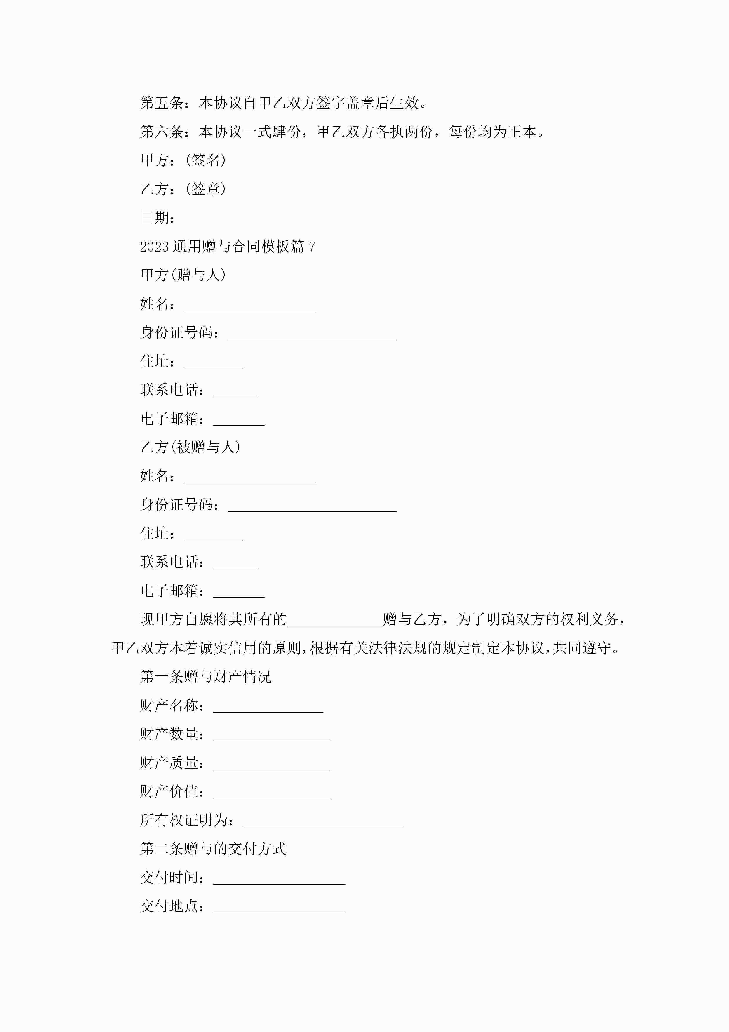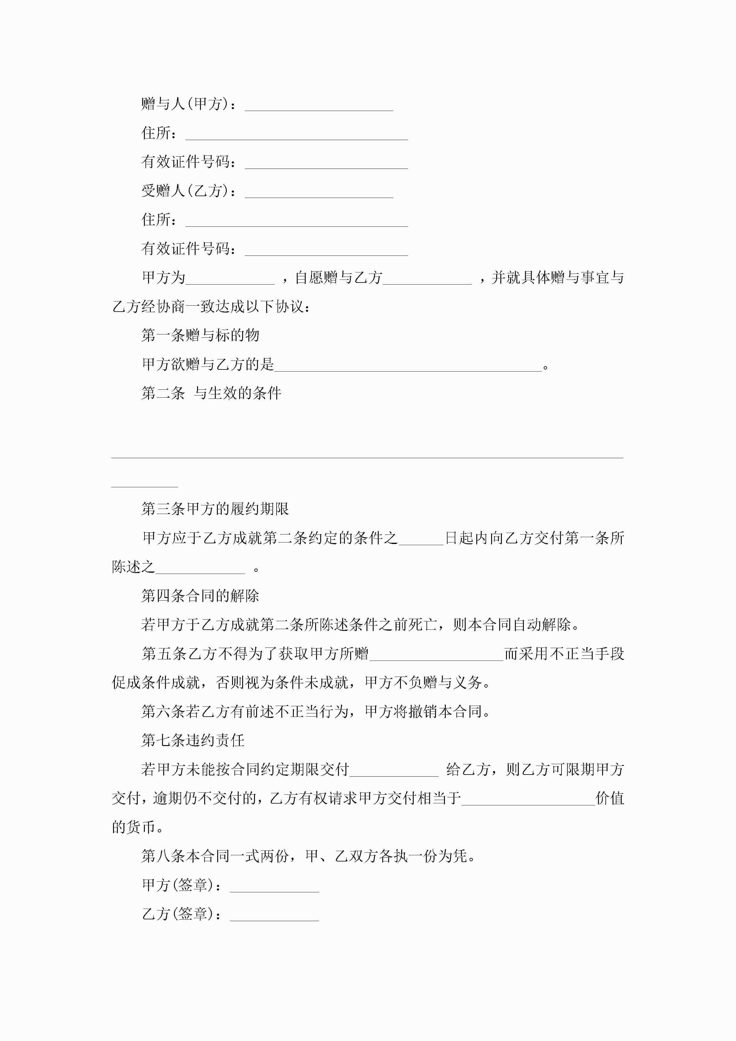 2023通用赠与合同模板8篇jugei3月23日 01:34发布关注236 2023通用赠与合同模板8篇此内容为付费资源,请付费后查看¥10.9 单篇文档限时特惠¥15个人会员开通企业会员开通立即下载无需登陆!可直接快捷下载单个模板付费资源© 版权声明THE ENDWord模板# 实用文档# 实用模板# 合同模板# 赠与合同 如有问题,可点击最底部“联系我们”联系客服 分享QQ空间微博QQ好友海报分享复制链接收藏