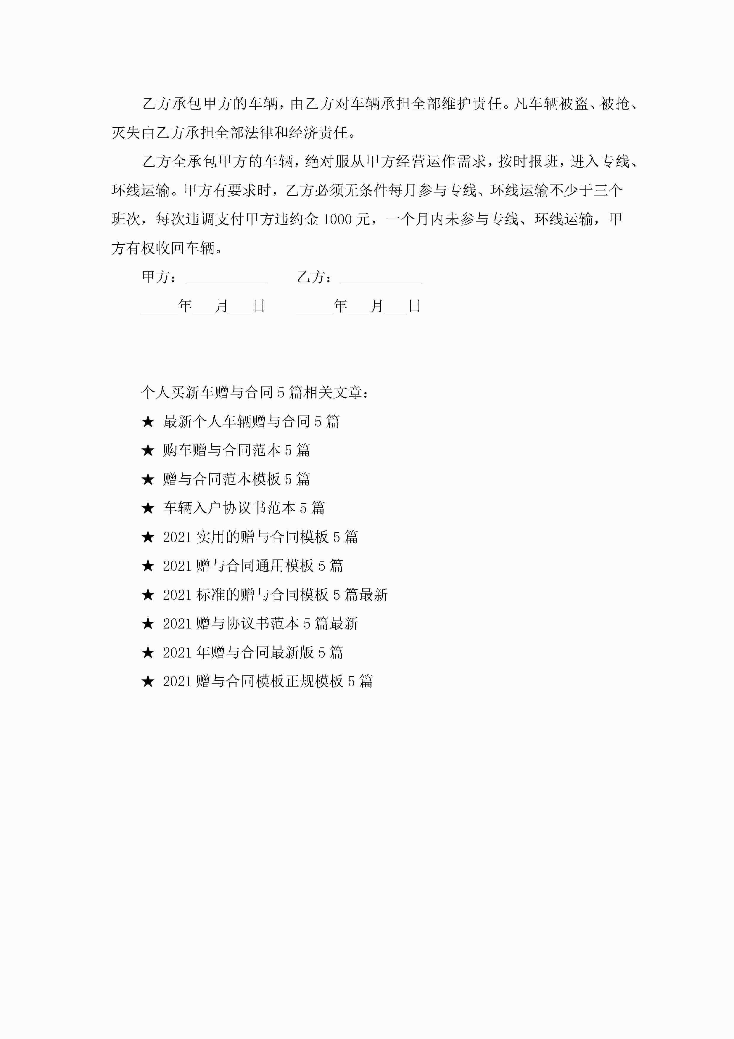 关于个人买新车赠与合同5篇jugei3月23日 01:34发布关注190 关于个人买新车赠与合同5篇此内容为付费资源,请付费后查看¥10.9 单篇文档限时特惠¥15个人会员开通企业会员开通立即下载无需登陆!可直接快捷下载单个模板付费资源© 版权声明THE ENDWord模板# 实用文档# 实用模板# 合同模板# 赠与合同 如有问题,可点击最底部“联系我们”联系客服 分享QQ空间微博QQ好友海报分享复制链接收藏