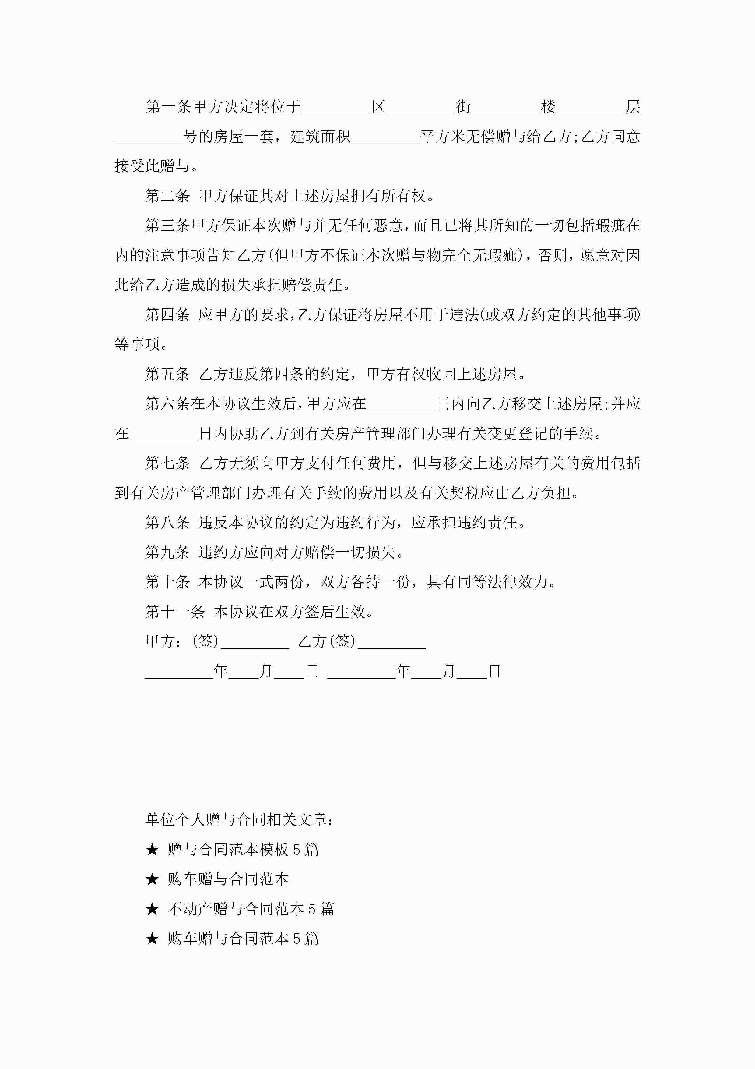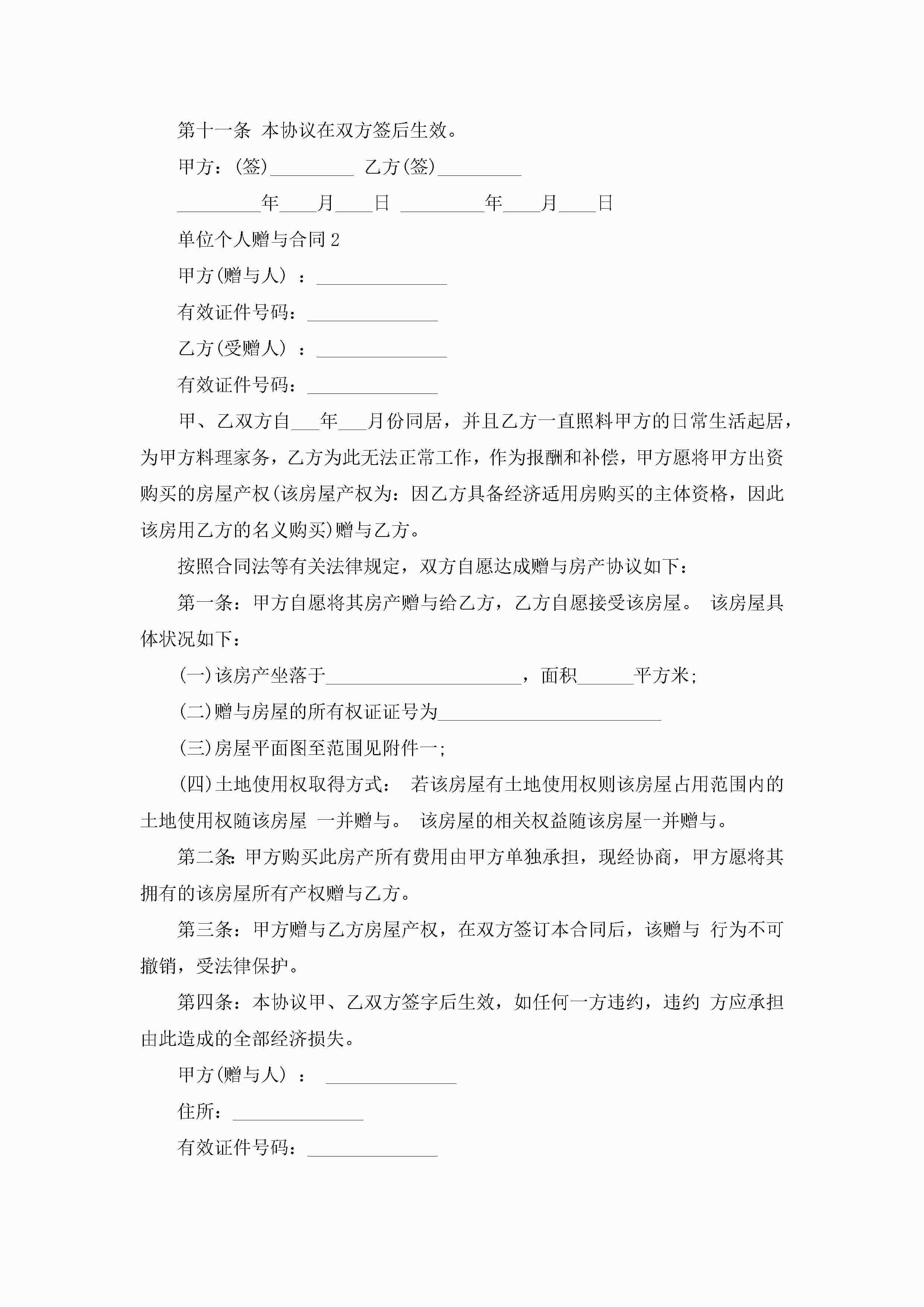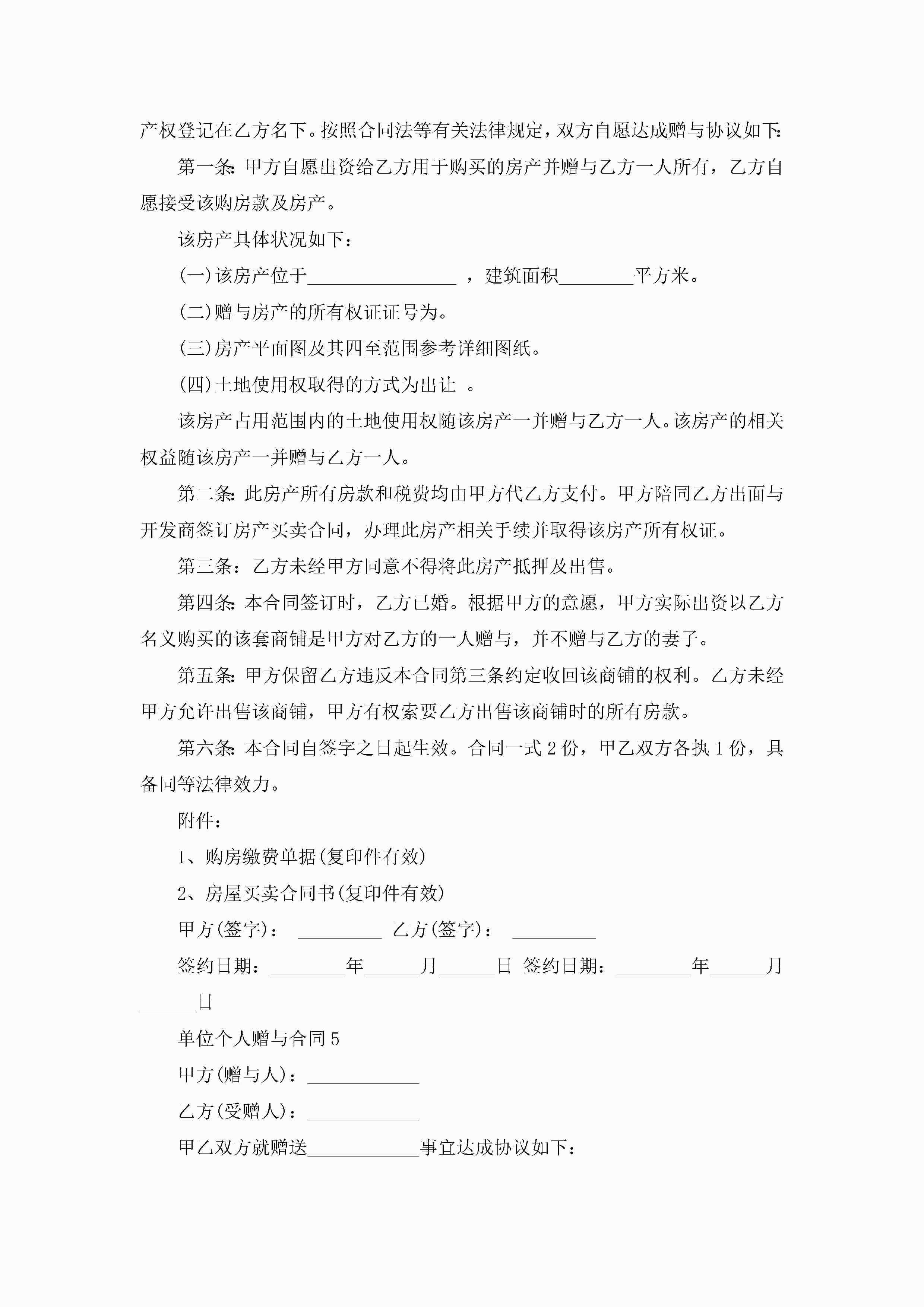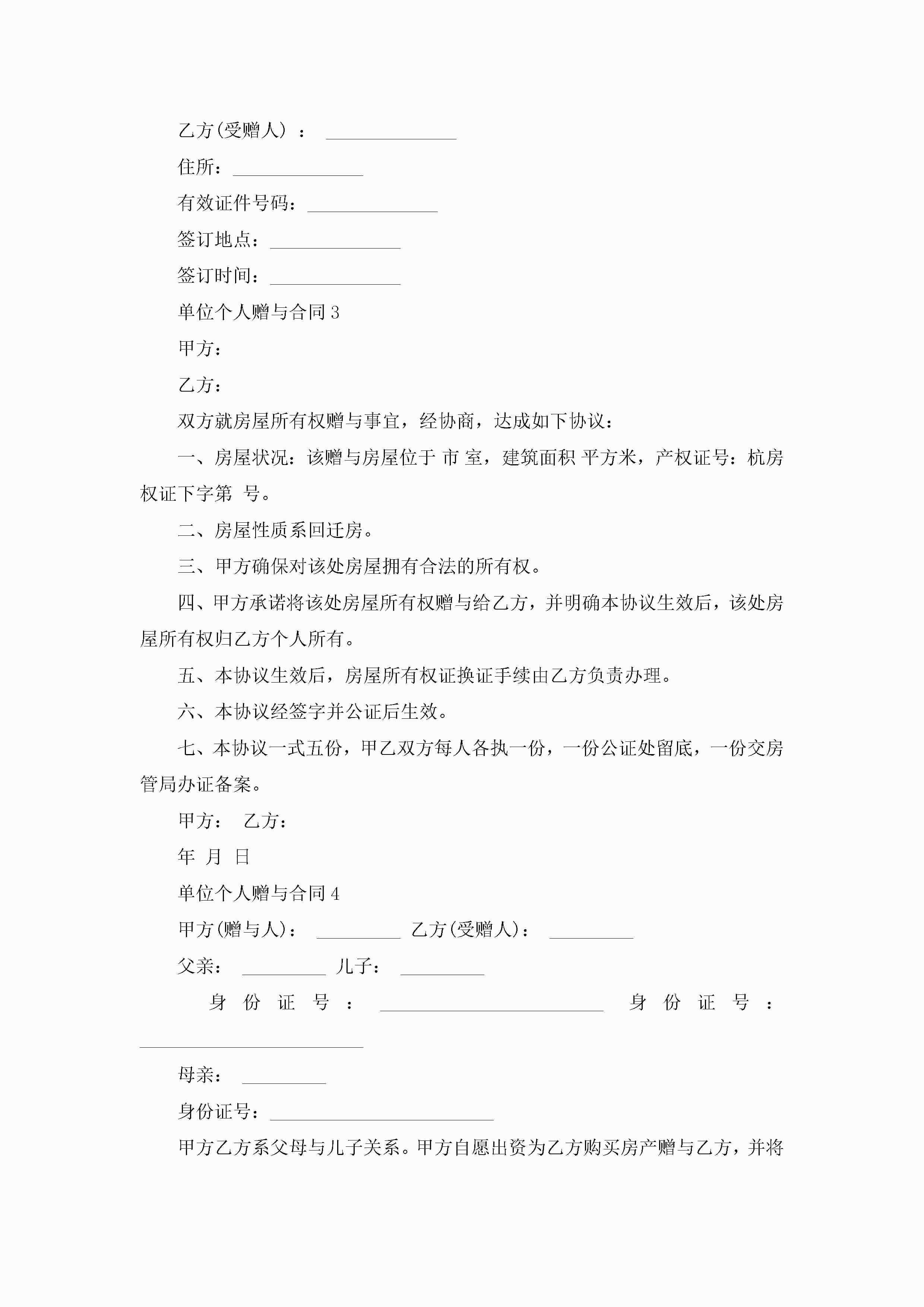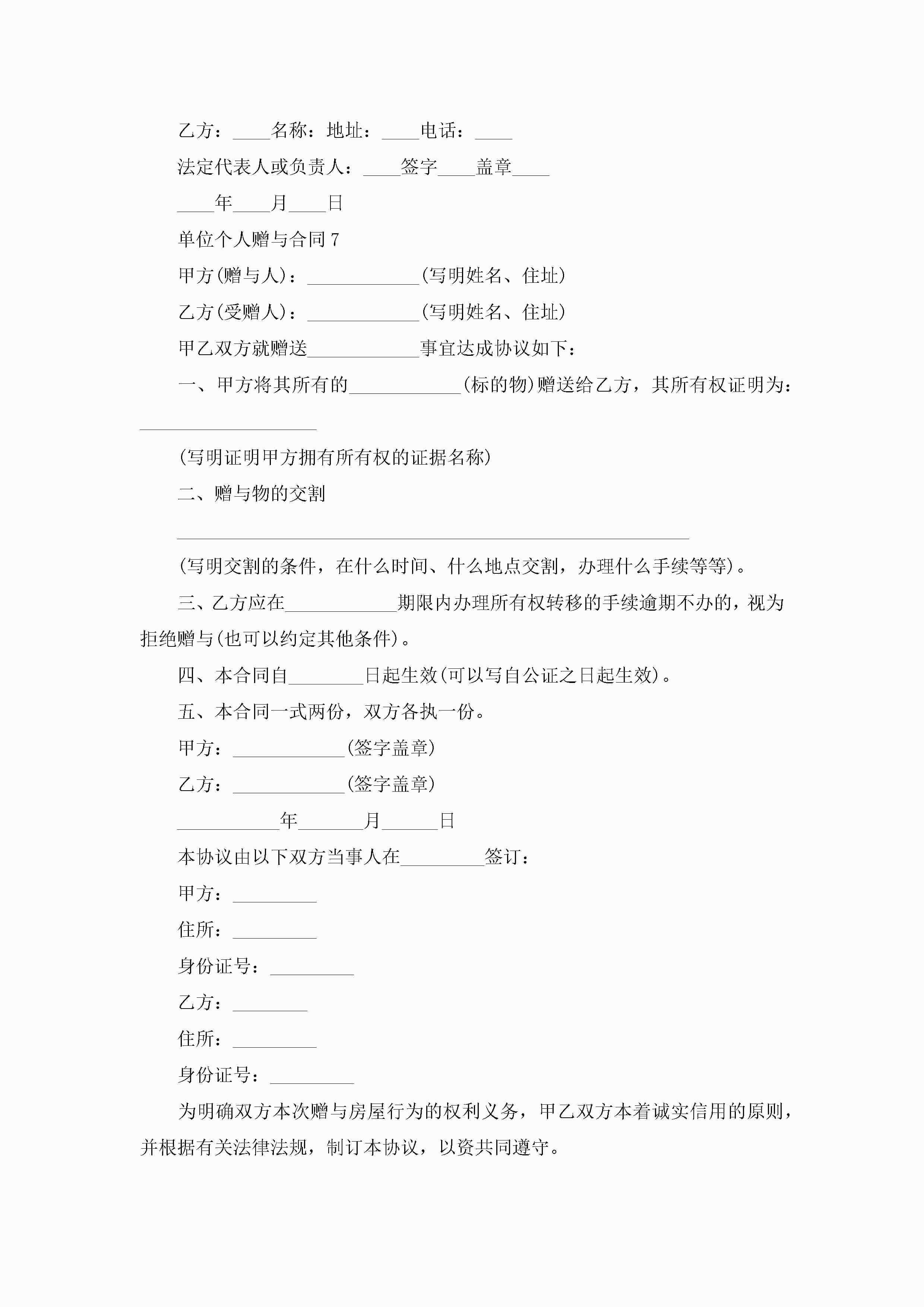 单位个人赠与合同7篇jugei3月23日 01:34发布关注201 单位个人赠与合同7篇此内容为付费资源,请付费后查看¥10.9 单篇文档限时特惠¥15个人会员开通企业会员开通立即下载无需登陆!可直接快捷下载单个模板付费资源© 版权声明THE ENDWord模板# 实用文档# 实用模板# 合同模板# 赠与合同 如有问题,可点击最底部“联系我们”联系客服 分享QQ空间微博QQ好友海报分享复制链接收藏