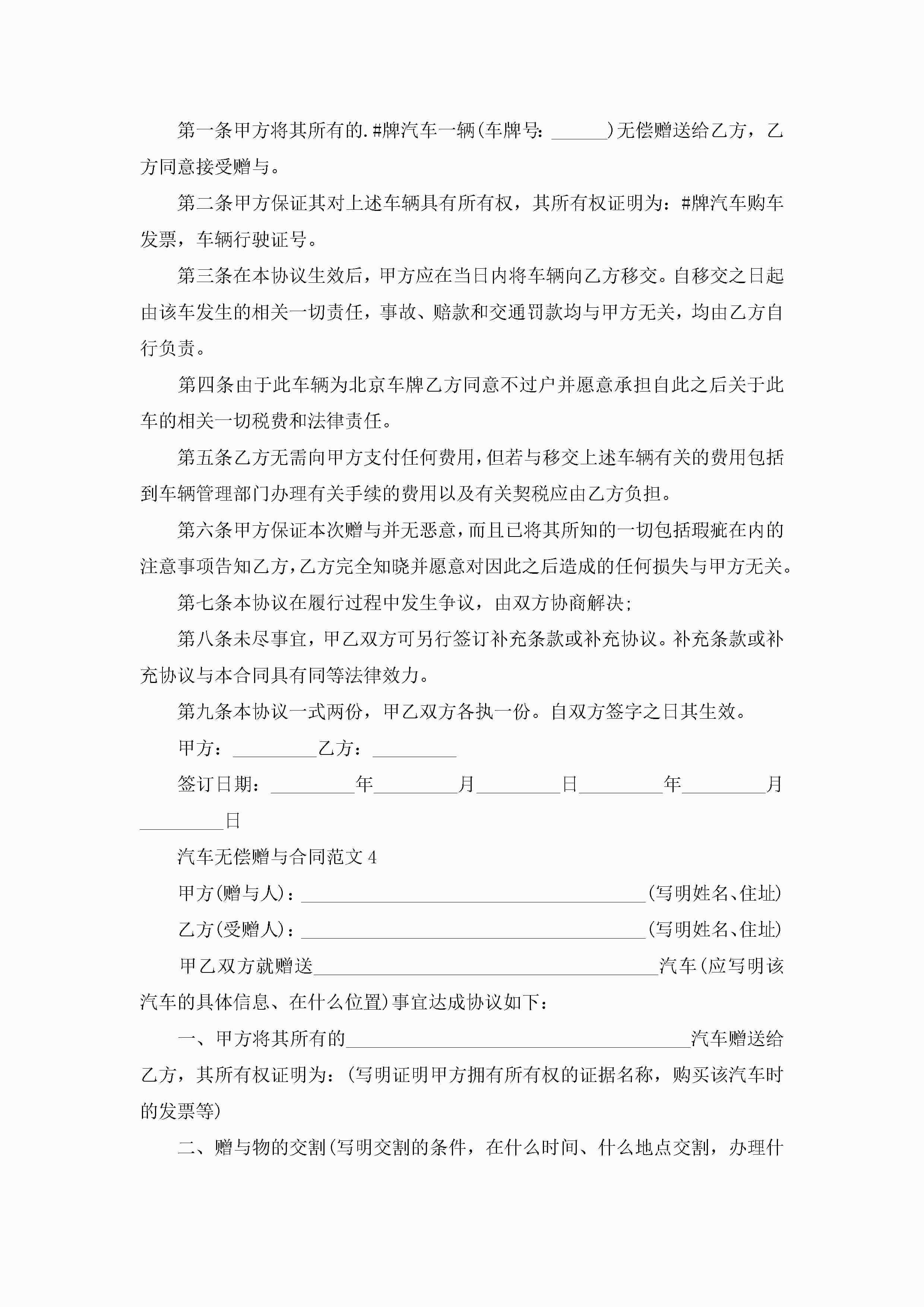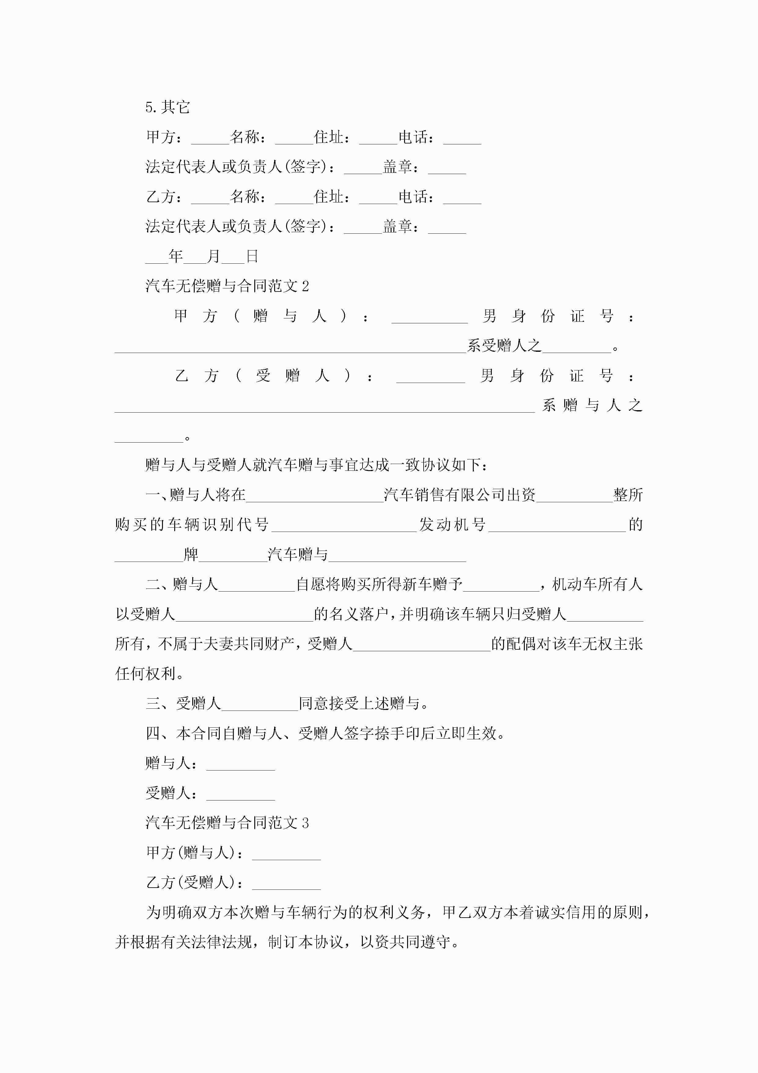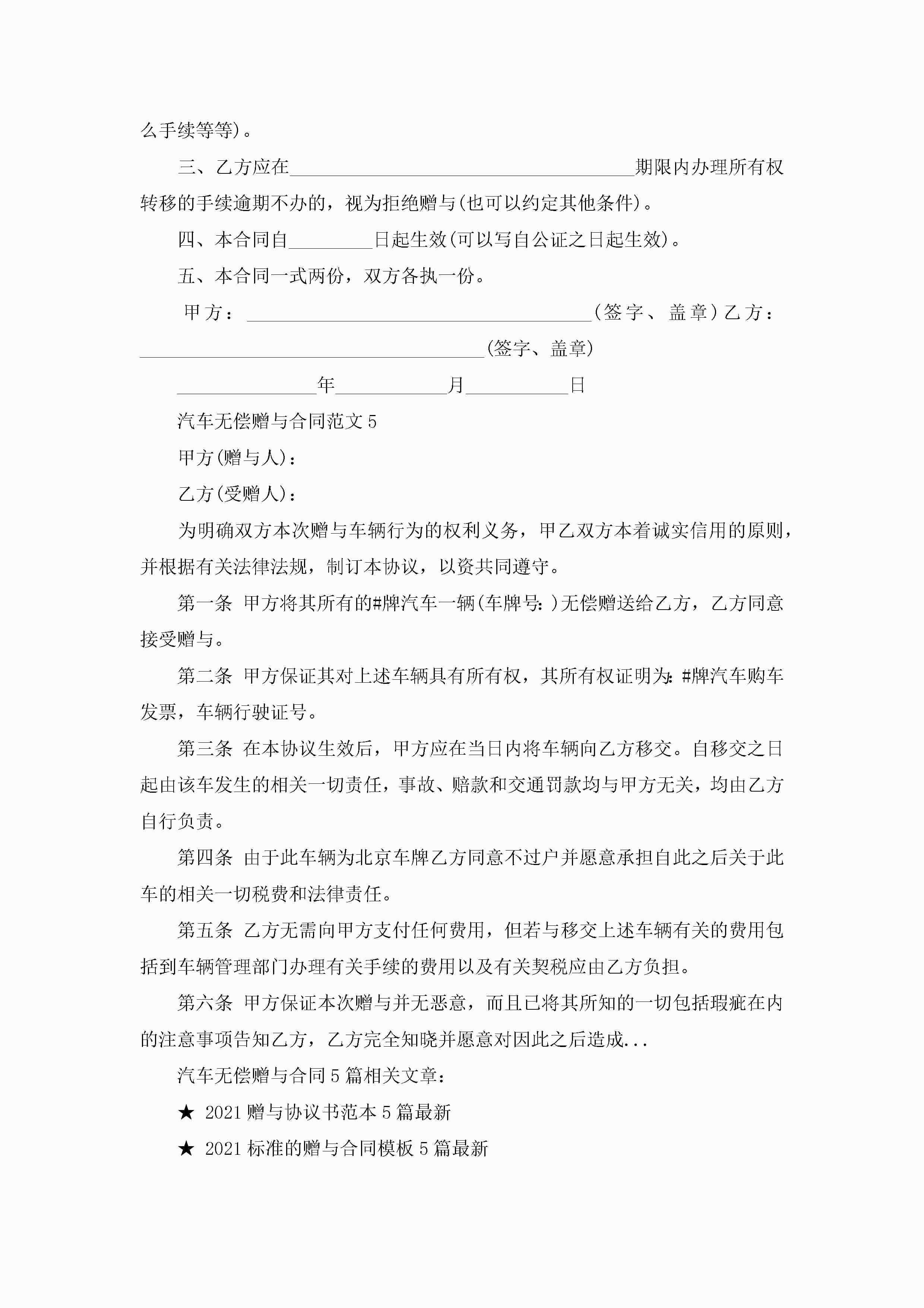 汽车无偿赠与合同范文5篇jugei3月23日 01:34发布关注205 汽车无偿赠与合同范文5篇此内容为付费资源,请付费后查看¥10.9 单篇文档限时特惠¥15个人会员开通企业会员开通立即下载无需登陆!可直接快捷下载单个模板付费资源© 版权声明THE ENDWord模板# 实用文档# 实用模板# 合同模板# 赠与合同 如有问题,可点击最底部“联系我们”联系客服 分享QQ空间微博QQ好友海报分享复制链接收藏