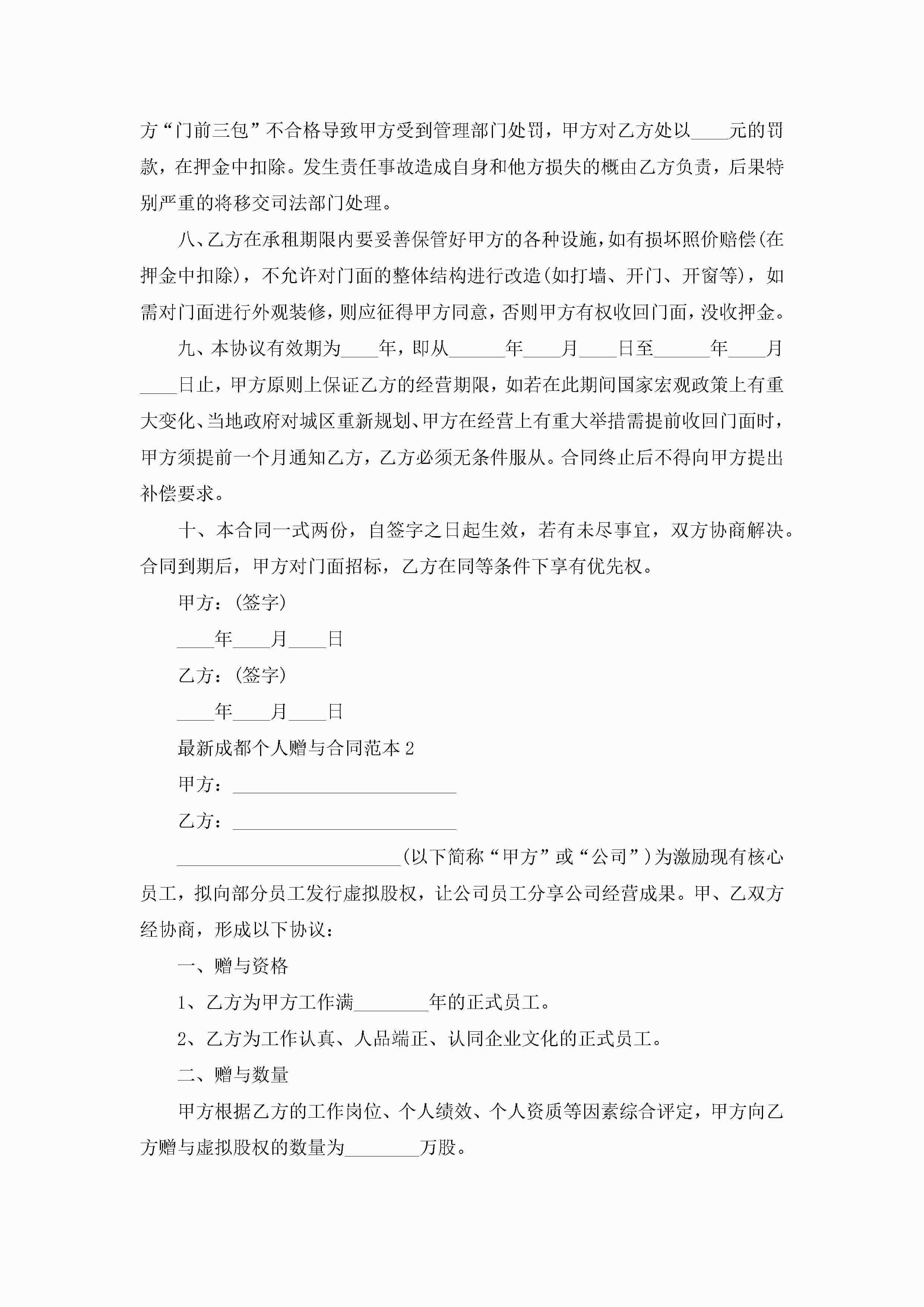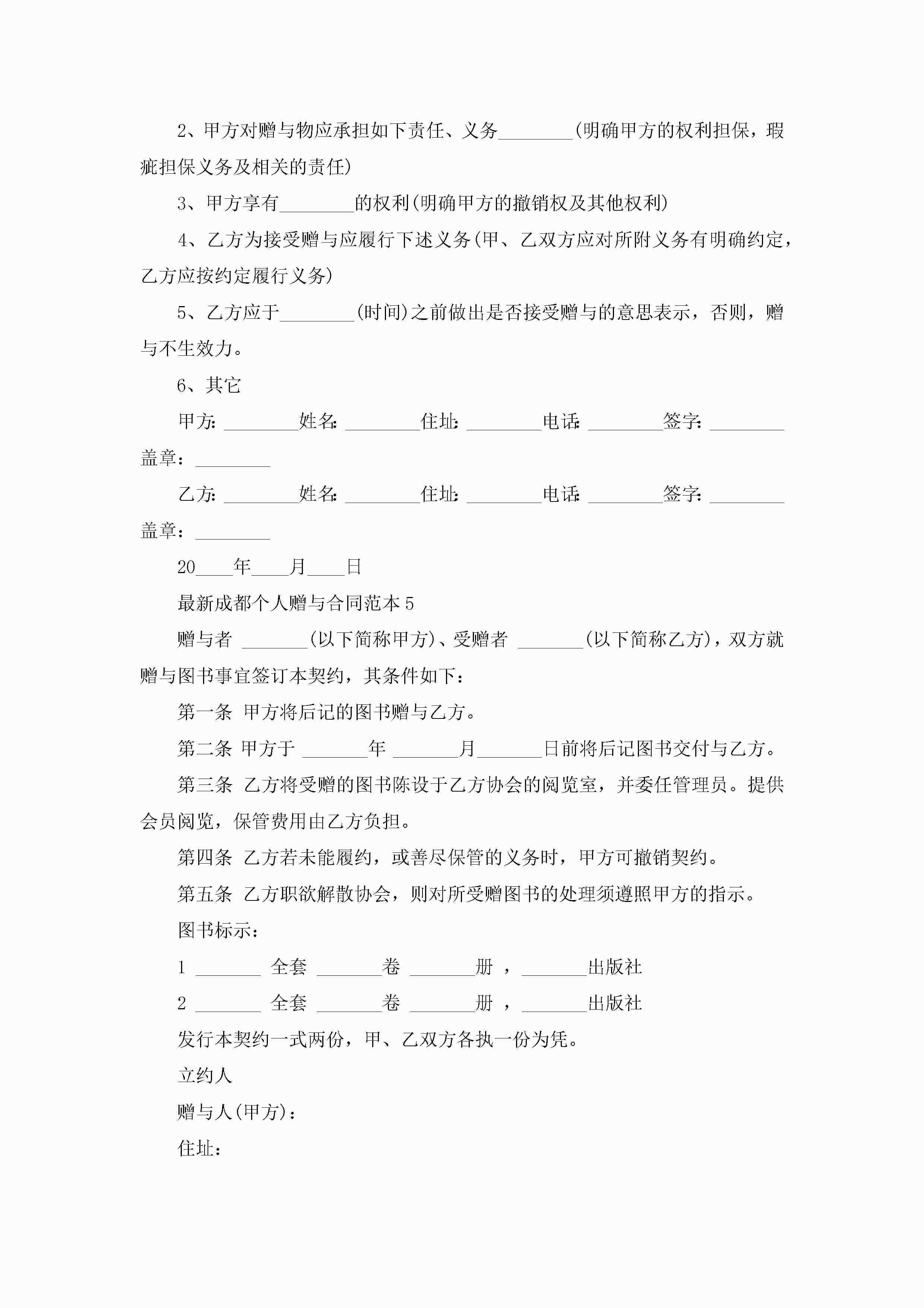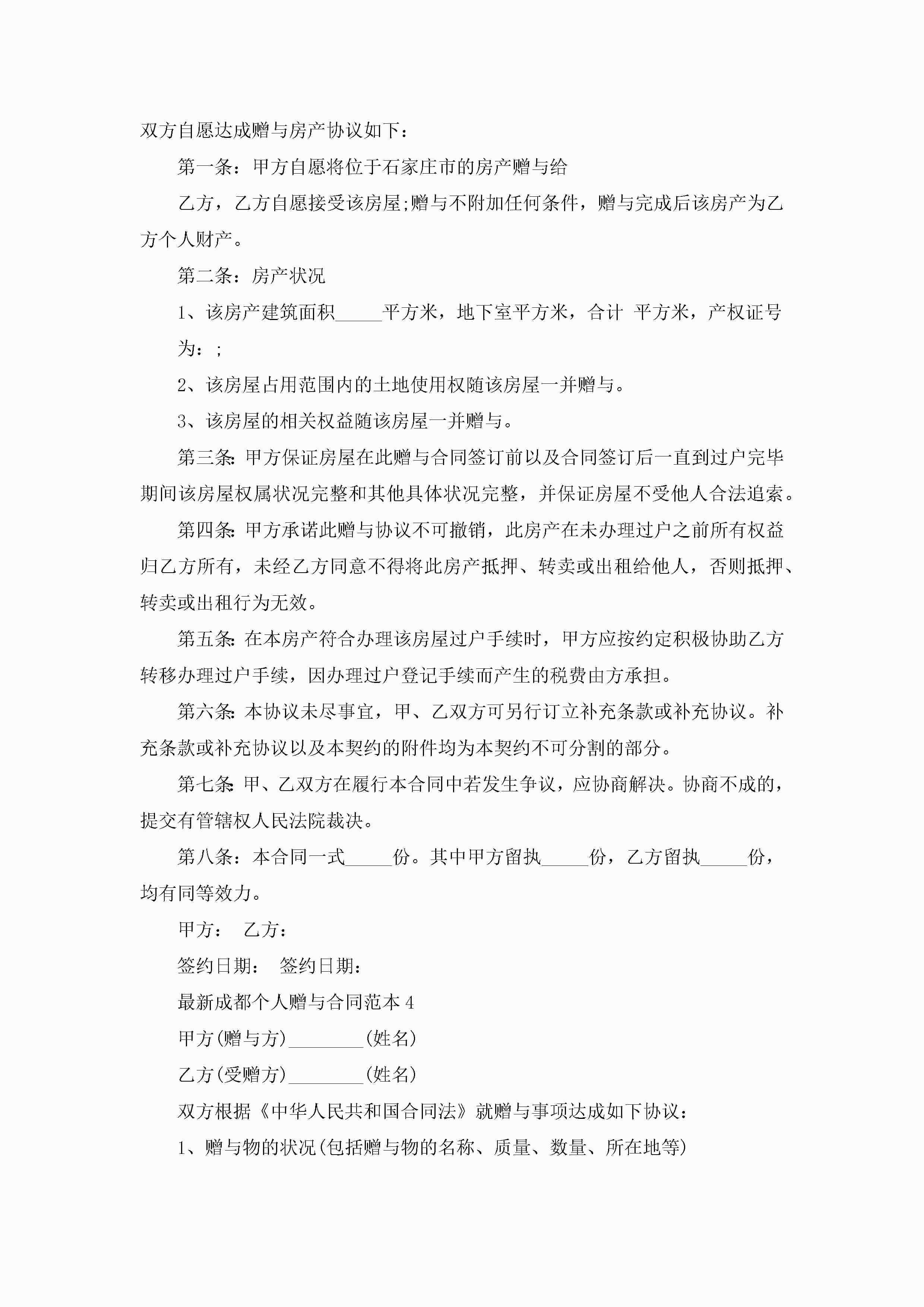 最新成都个人赠与合同范本5篇jugei3月23日 01:34发布关注237 最新成都个人赠与合同范本5篇此内容为付费资源,请付费后查看¥10.9 单篇文档限时特惠¥15个人会员开通企业会员开通立即下载无需登陆!可直接快捷下载单个模板付费资源© 版权声明THE ENDWord模板# 实用文档# 实用模板# 合同模板# 赠与合同 如有问题,可点击最底部“联系我们”联系客服 分享QQ空间微博QQ好友海报分享复制链接收藏