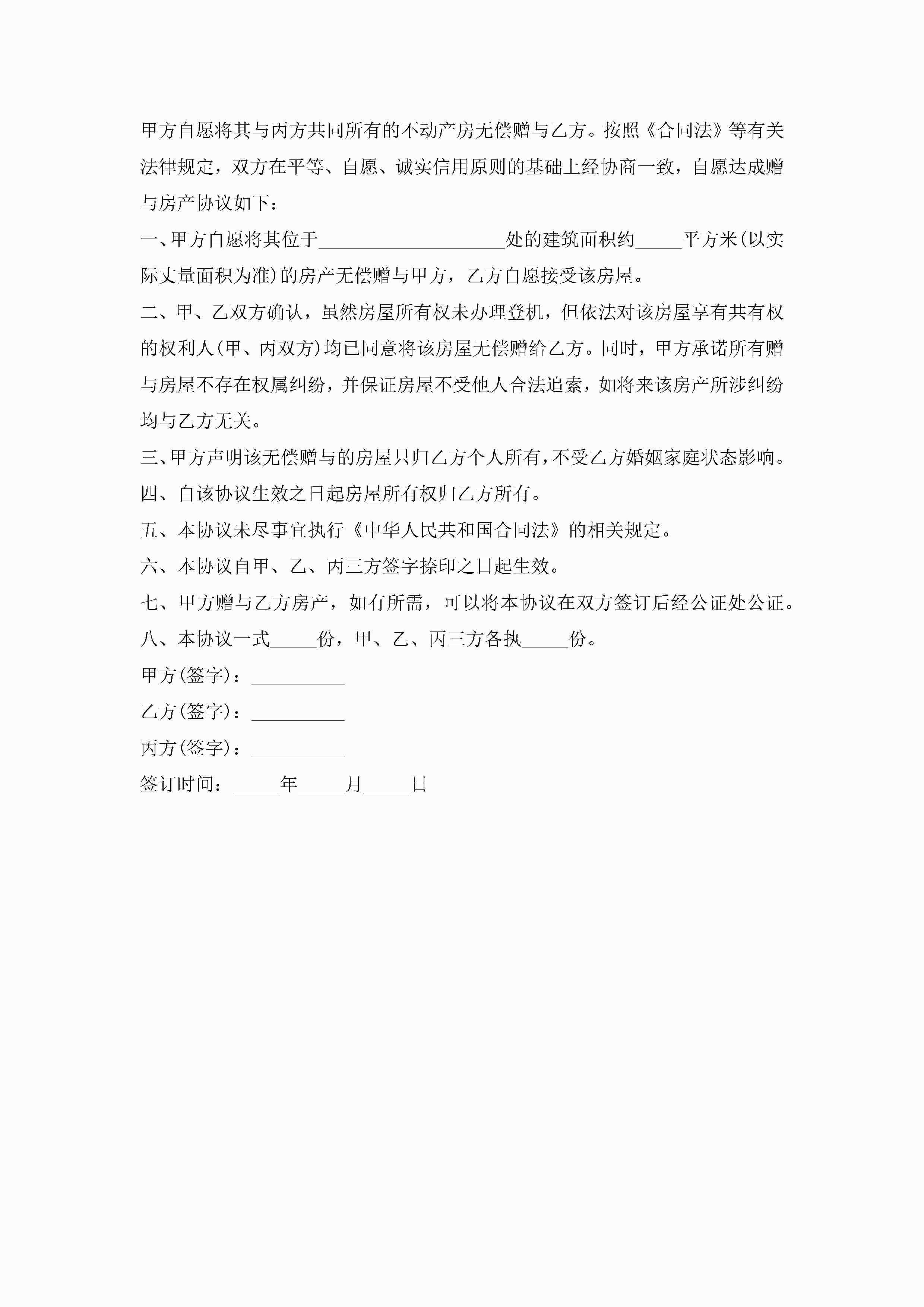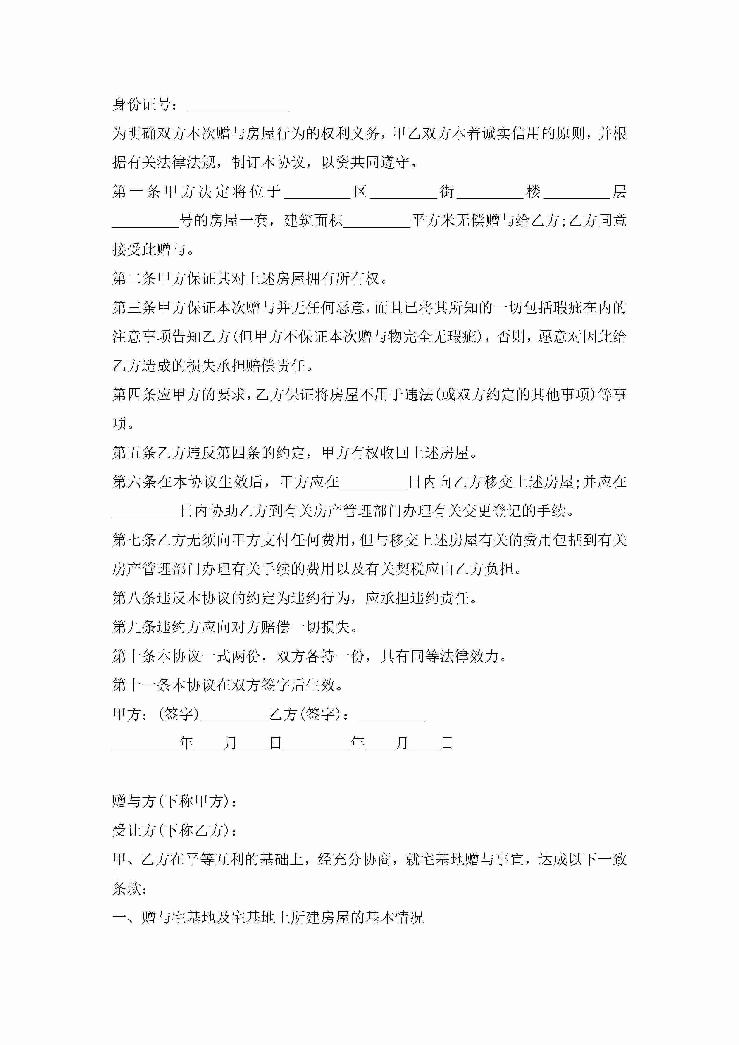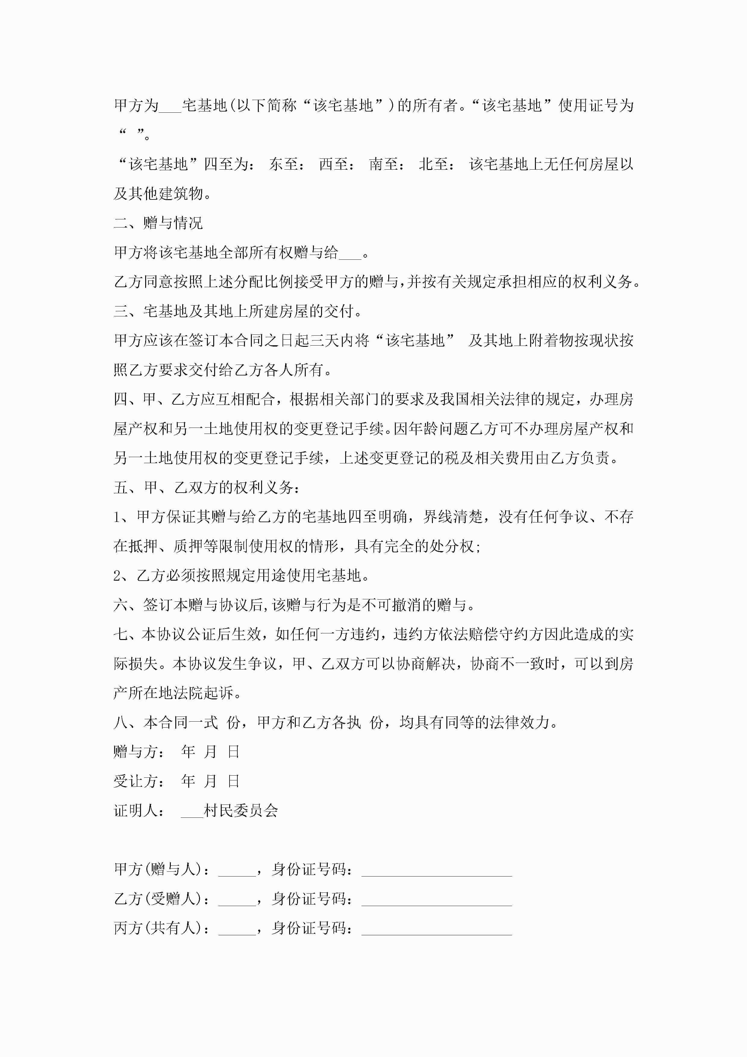 宅基地赠与协议合同范文5篇jugei3月23日 01:34发布关注240 宅基地赠与协议合同范文5篇此内容为付费资源,请付费后查看¥10.9 单篇文档限时特惠¥15个人会员开通企业会员开通立即下载无需登陆!可直接快捷下载单个模板付费资源© 版权声明THE ENDWord模板# 实用文档# 实用模板# 合同模板# 赠与合同 如有问题,可点击最底部“联系我们”联系客服 分享QQ空间微博QQ好友海报分享复制链接收藏