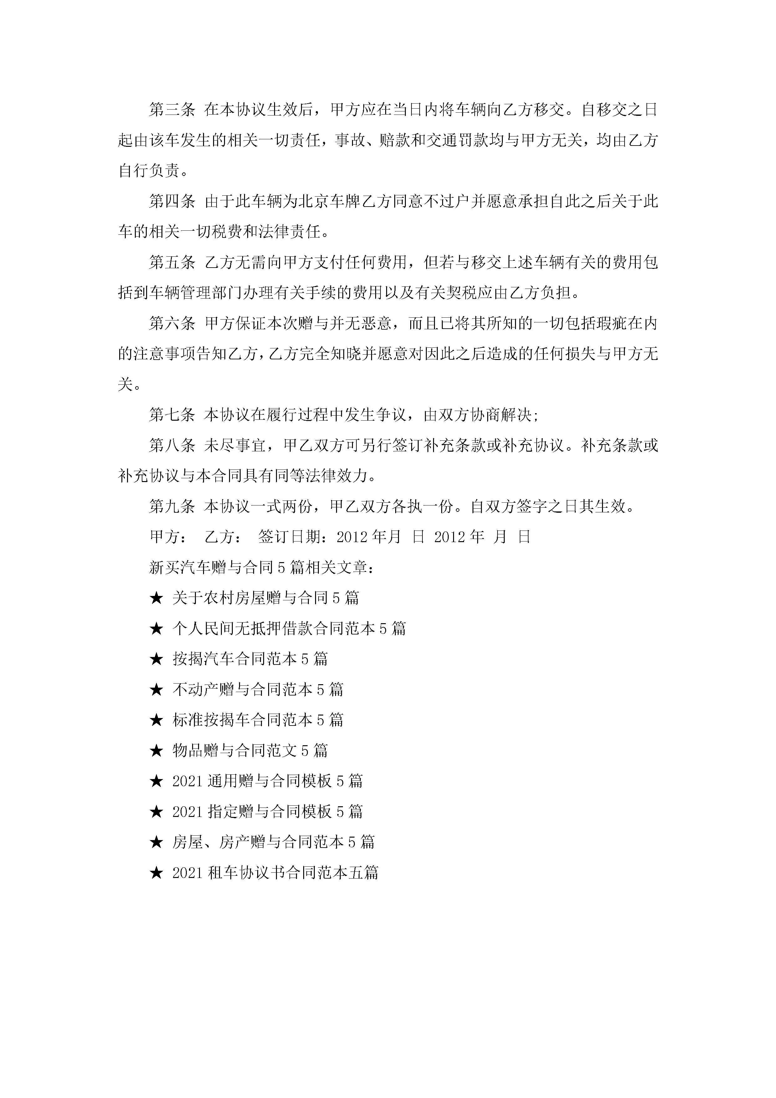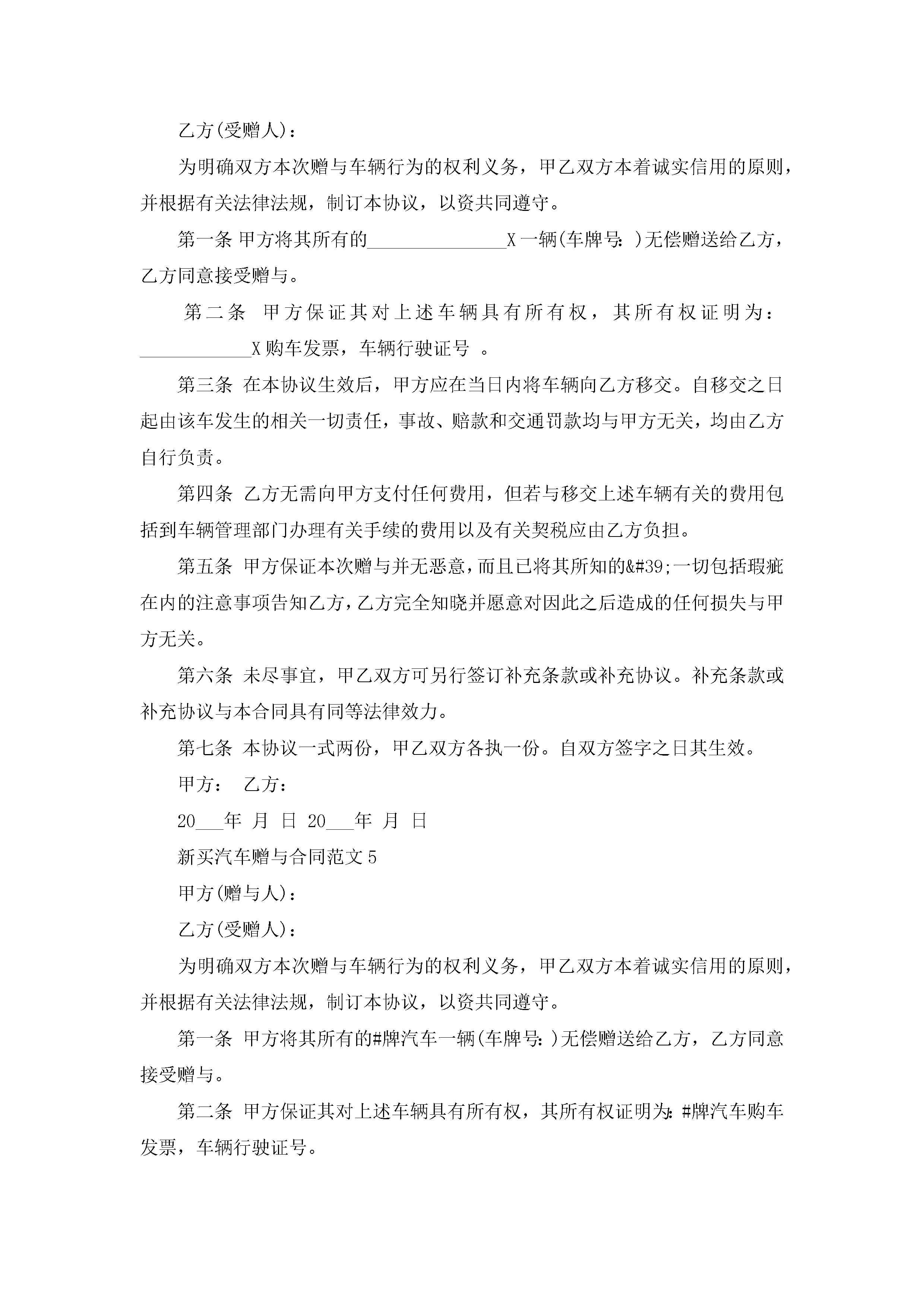 新买汽车赠与合同范文5篇jugei3月23日 01:34发布关注220 新买汽车赠与合同范文5篇此内容为付费资源,请付费后查看¥10.9 单篇文档限时特惠¥15个人会员开通企业会员开通立即下载无需登陆!可直接快捷下载单个模板付费资源© 版权声明THE ENDWord模板# 实用文档# 实用模板# 合同模板# 赠与合同 如有问题,可点击最底部“联系我们”联系客服 分享QQ空间微博QQ好友海报分享复制链接收藏