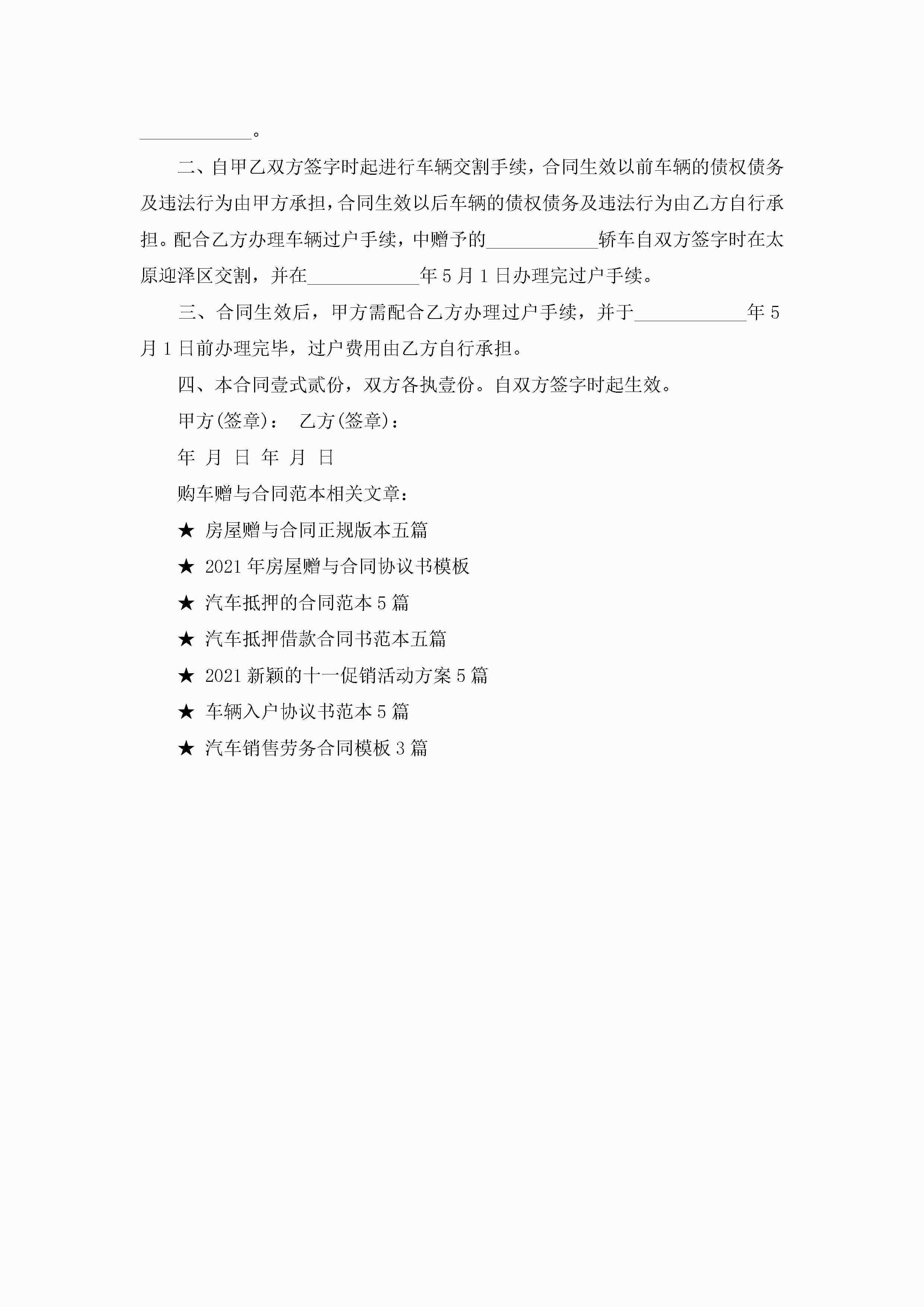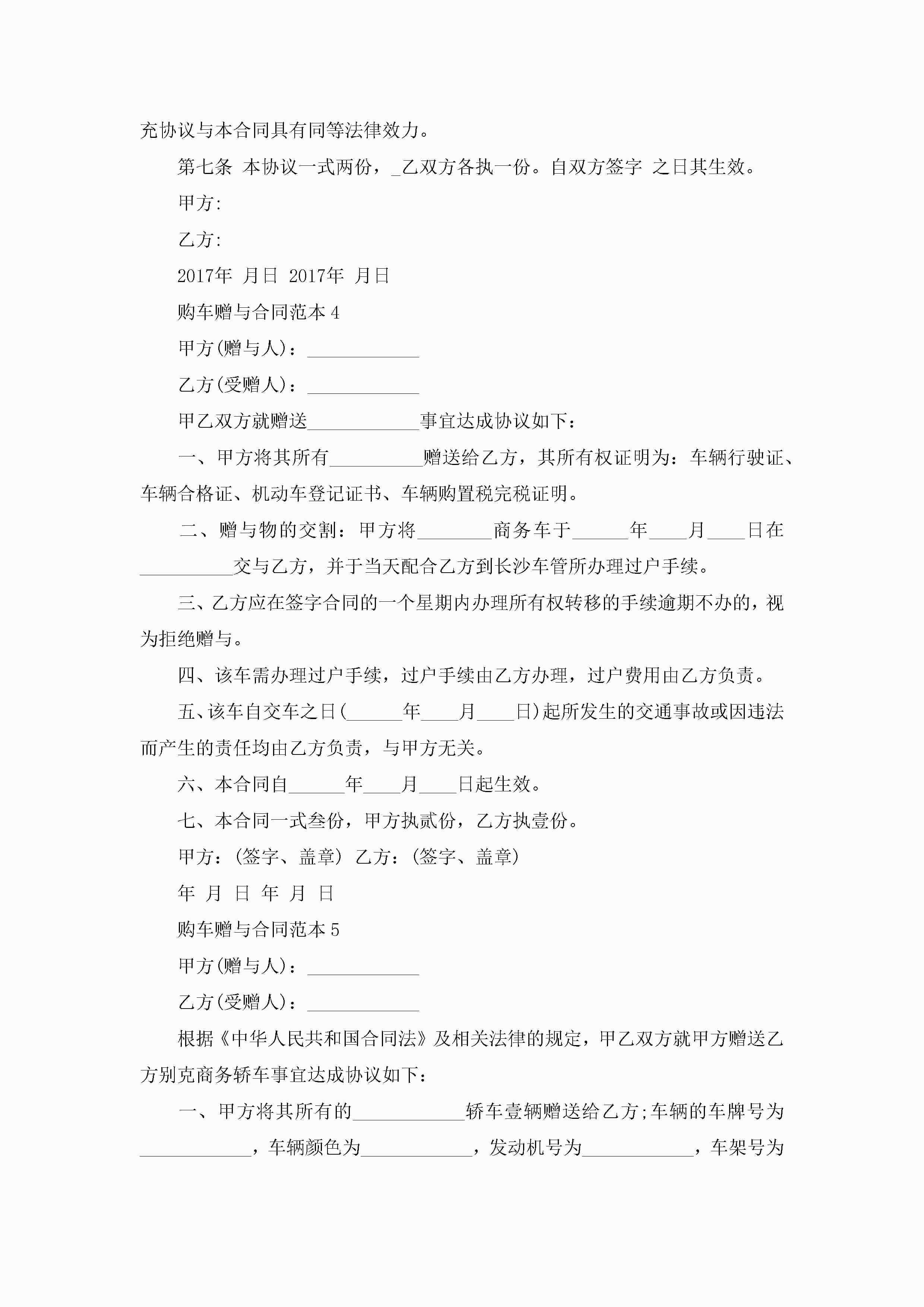 购车赠与合同范本5篇jugei3月23日 01:34发布关注211 购车赠与合同范本5篇此内容为付费资源,请付费后查看¥10.9 单篇文档限时特惠¥15个人会员开通企业会员开通立即下载无需登陆!可直接快捷下载单个模板付费资源© 版权声明THE ENDWord模板# 实用文档# 实用模板# 合同模板# 赠与合同 如有问题,可点击最底部“联系我们”联系客服 分享QQ空间微博QQ好友海报分享复制链接收藏