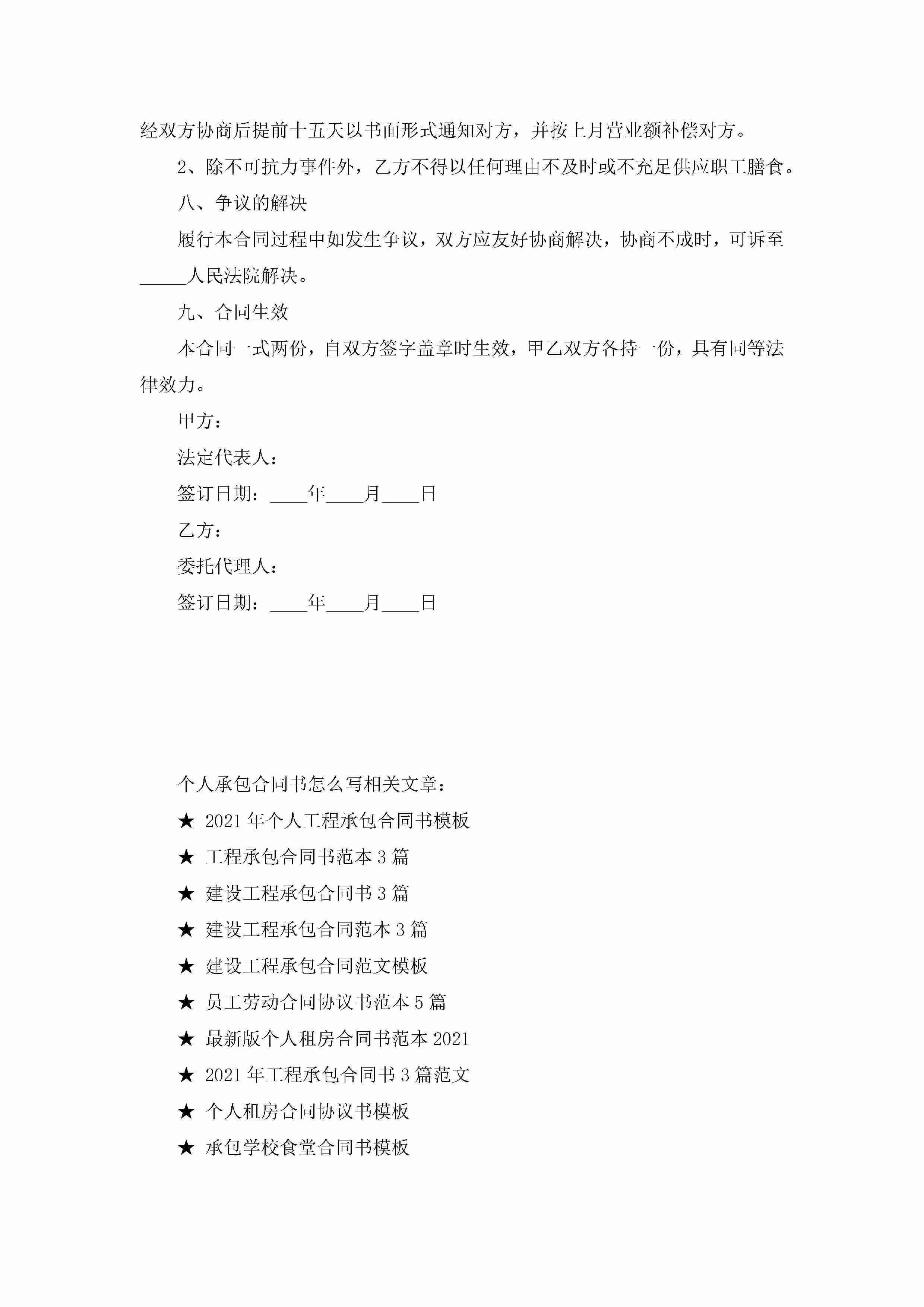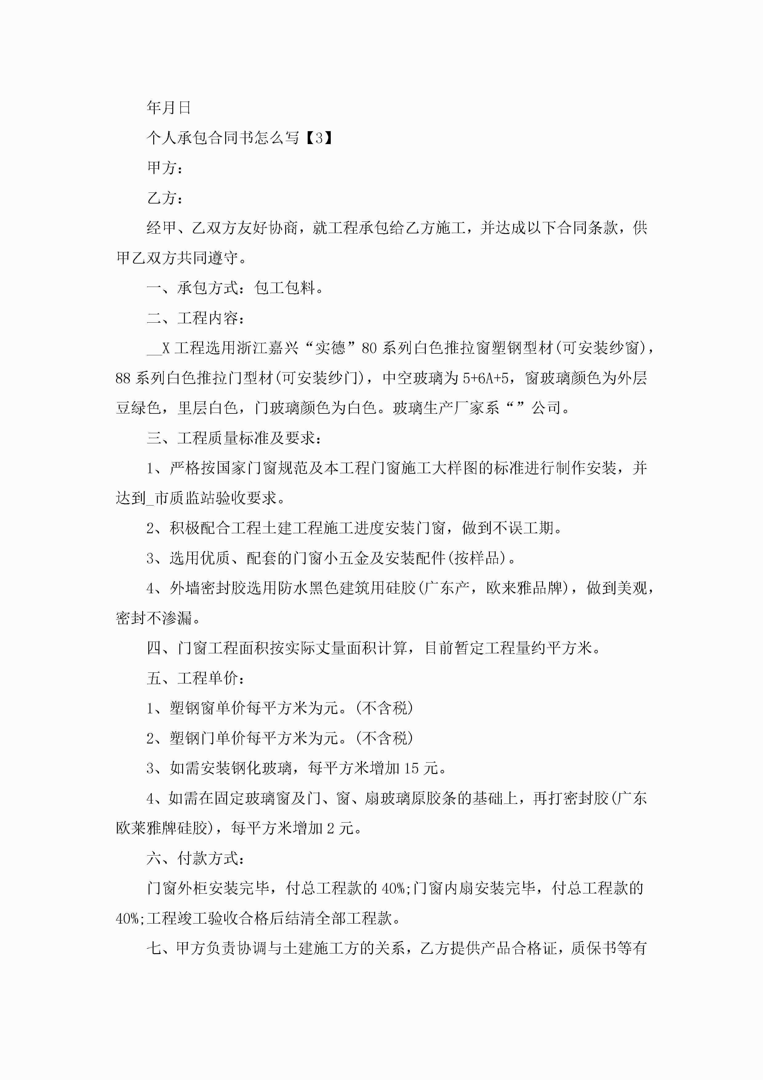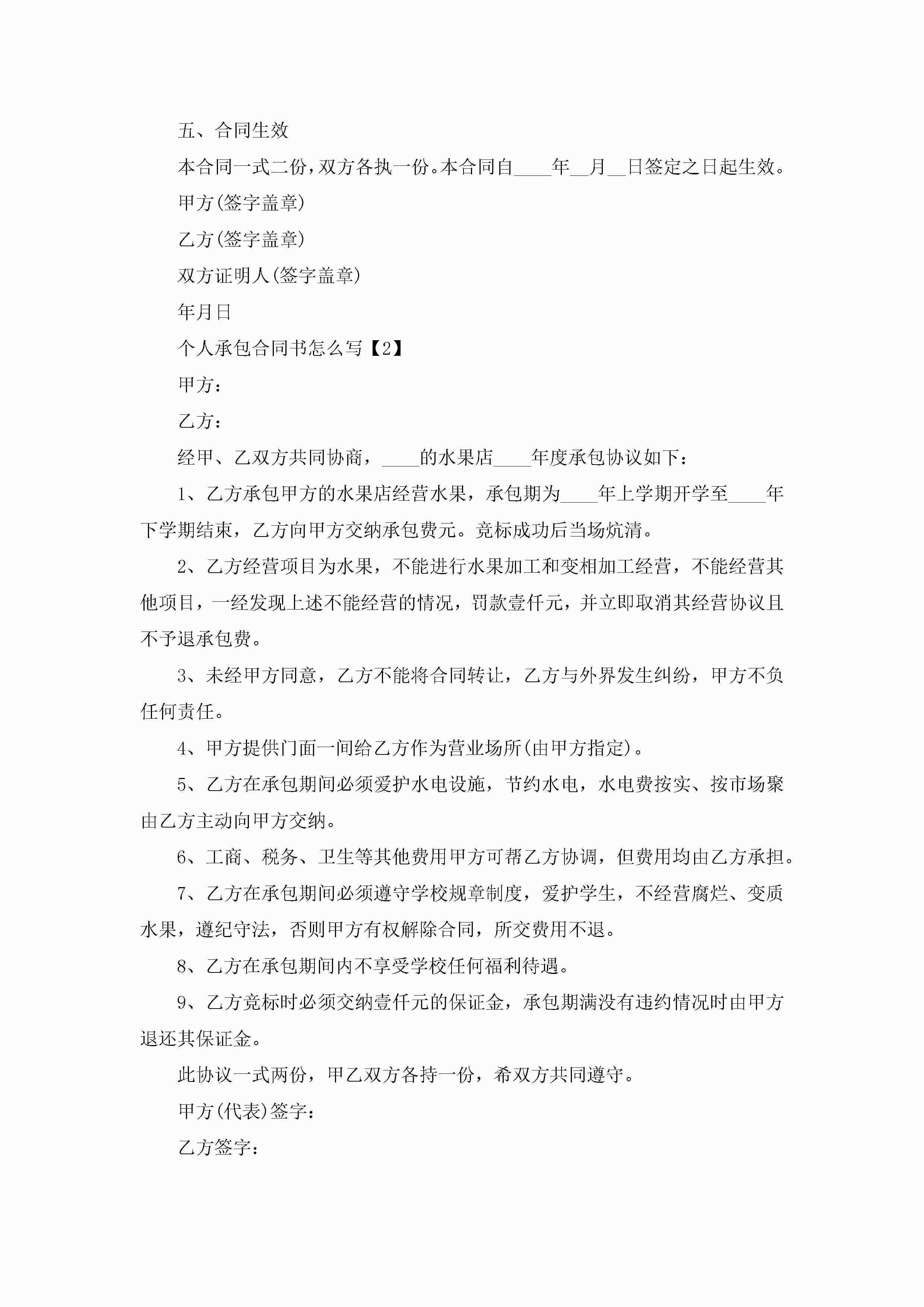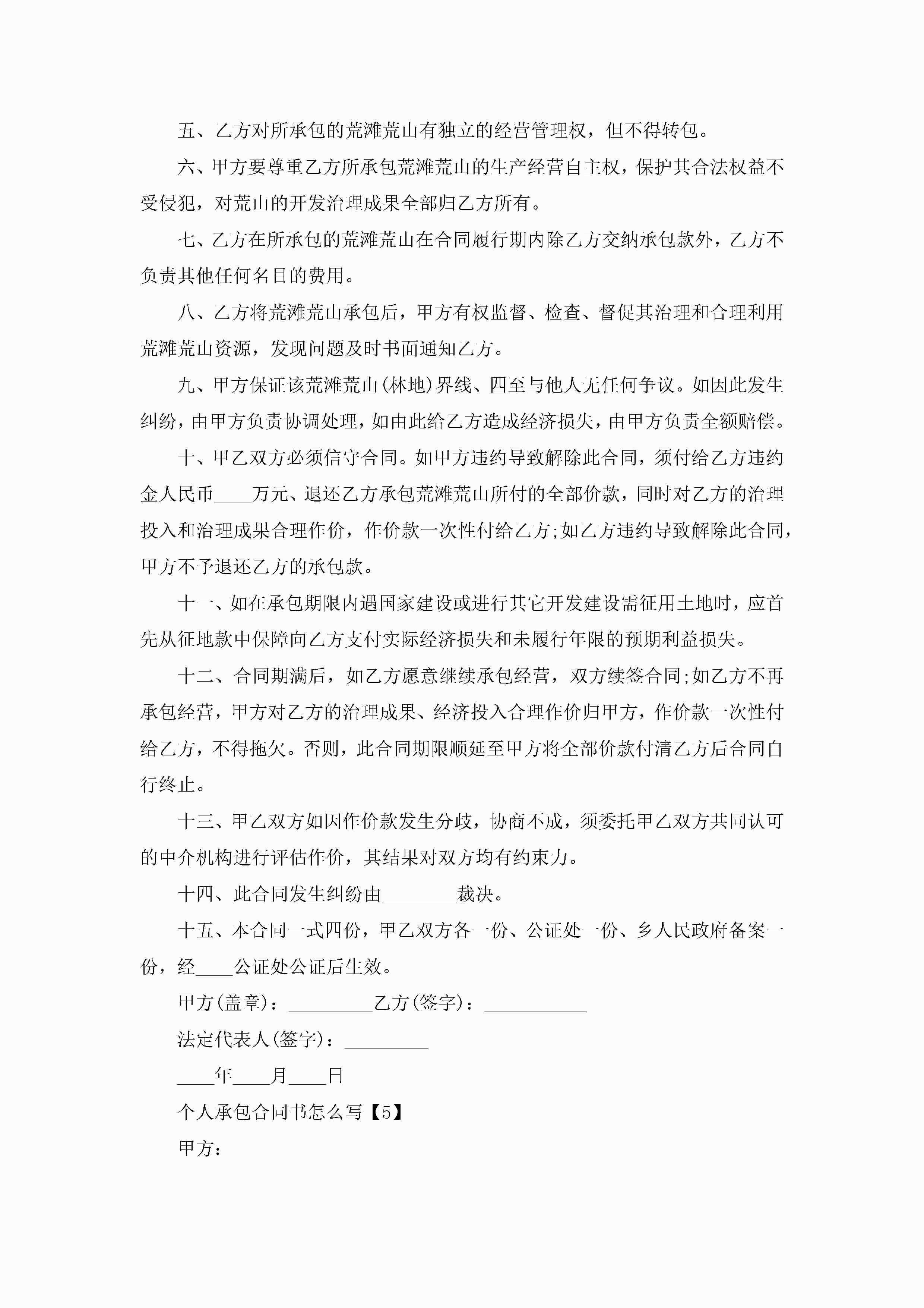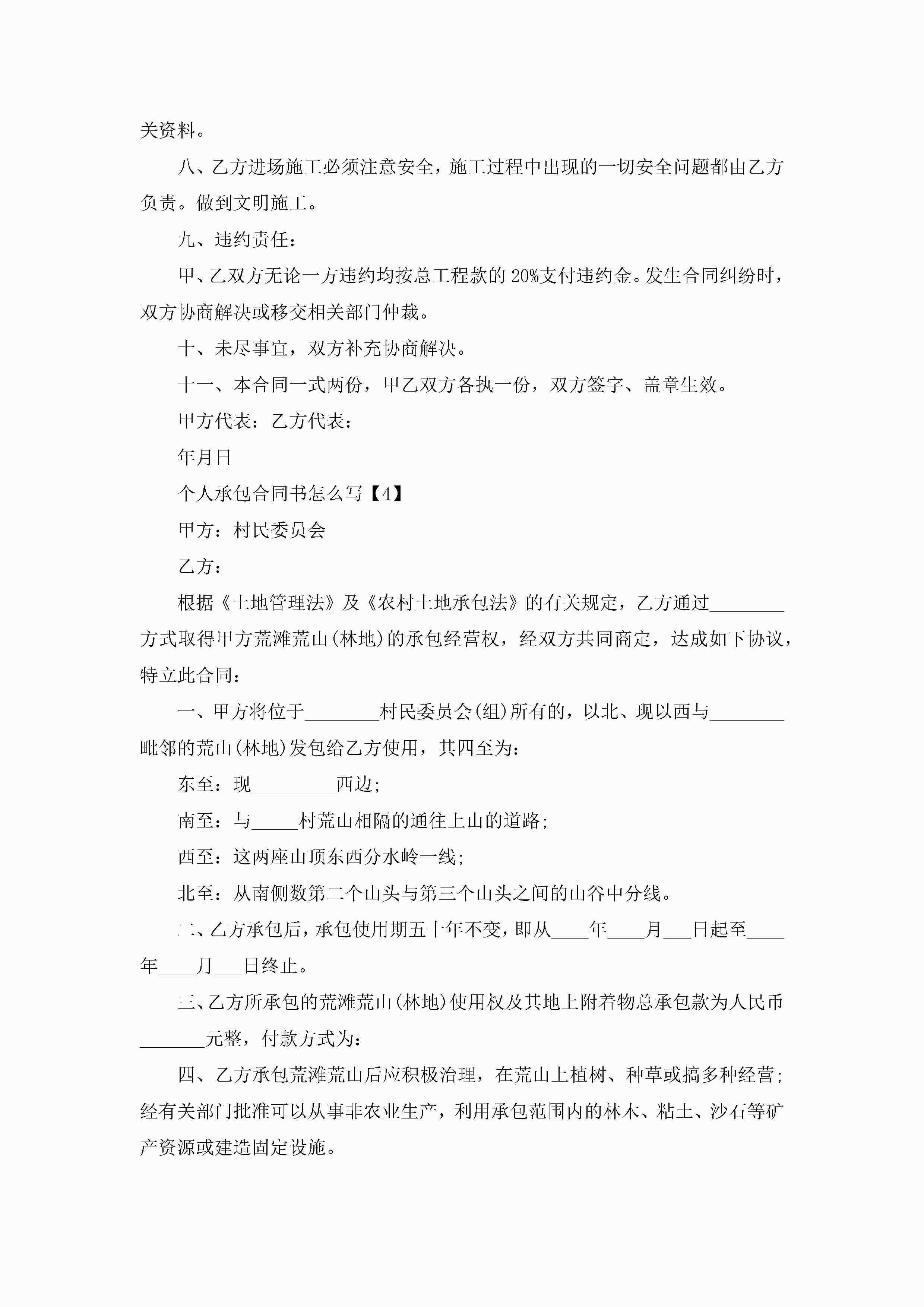 个人承包合同书怎么写_个人承包协议jugei3月23日 01:35发布关注217 个人承包合同书怎么写_个人承包协议此内容为付费资源,请付费后查看¥10.9 单篇文档限时特惠¥15个人会员开通企业会员开通立即下载无需登陆!可直接快捷下载单个模板付费资源© 版权声明THE ENDWord模板# 实用文档# 实用模板# 合同模板# 承包合同 如有问题,可点击最底部“联系我们”联系客服 分享QQ空间微博QQ好友海报分享复制链接收藏
