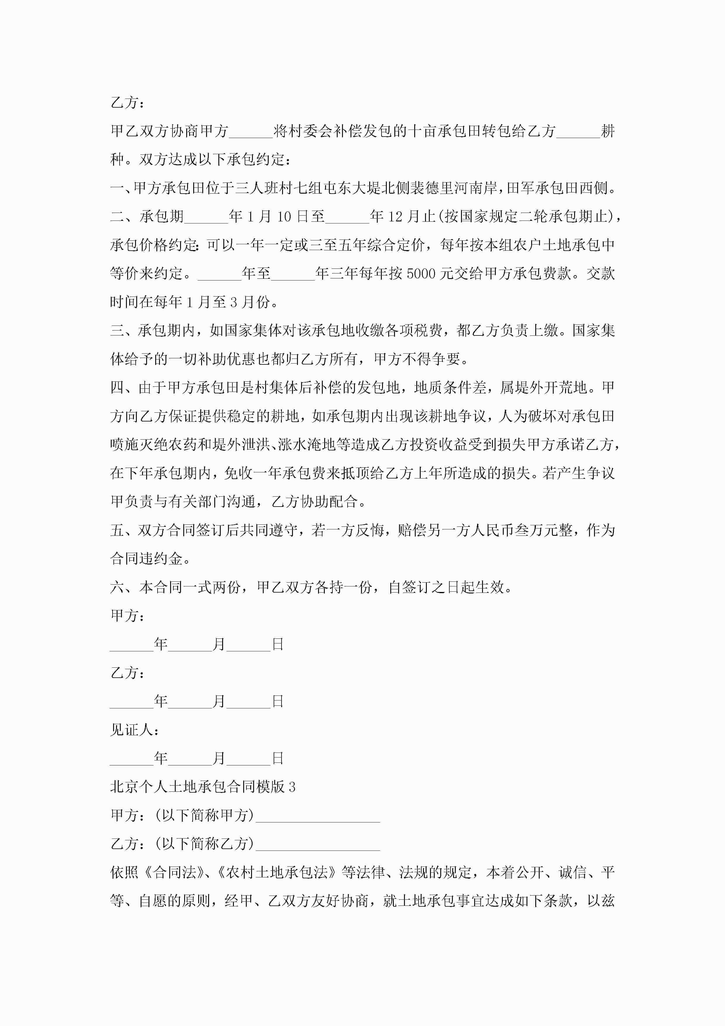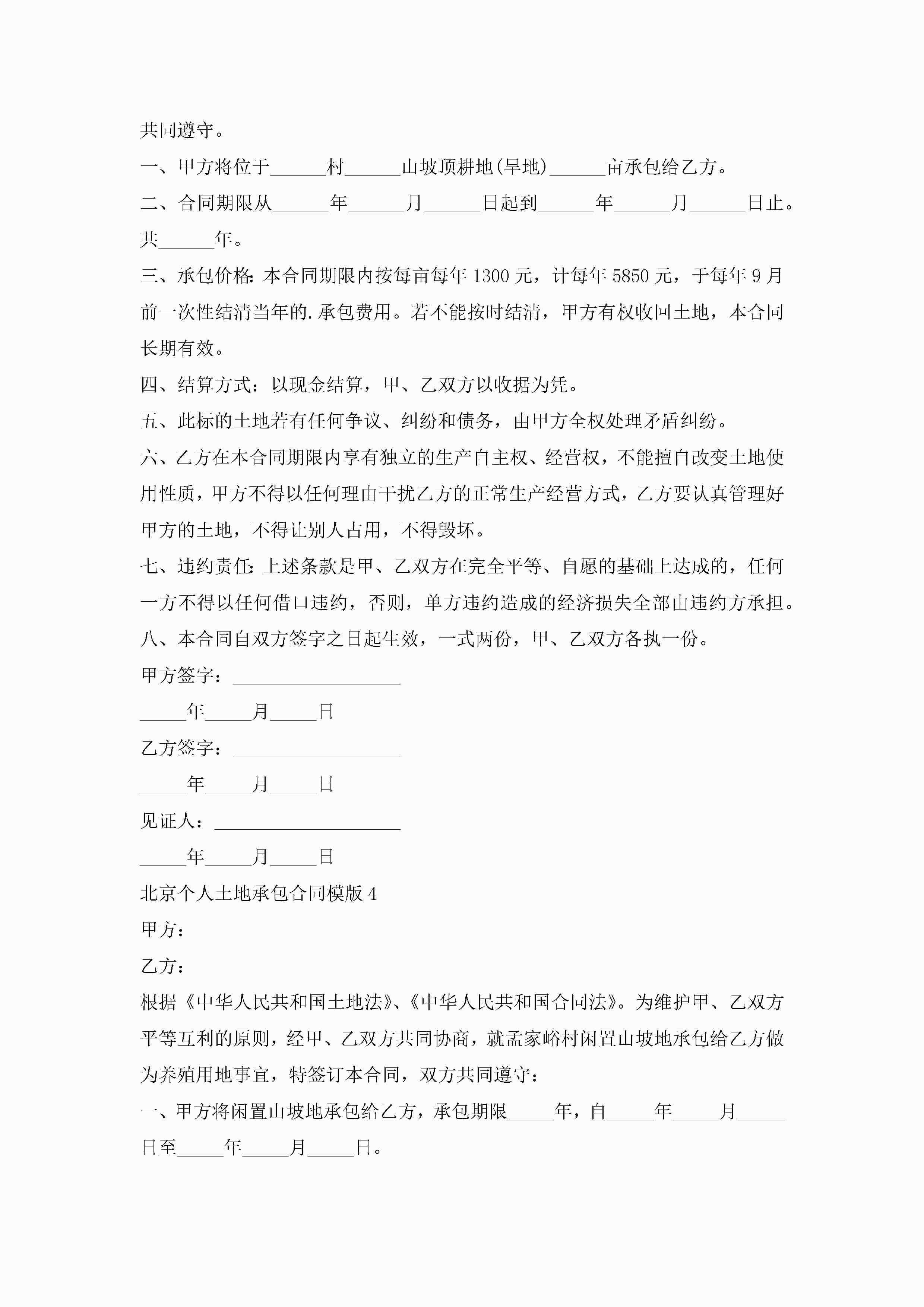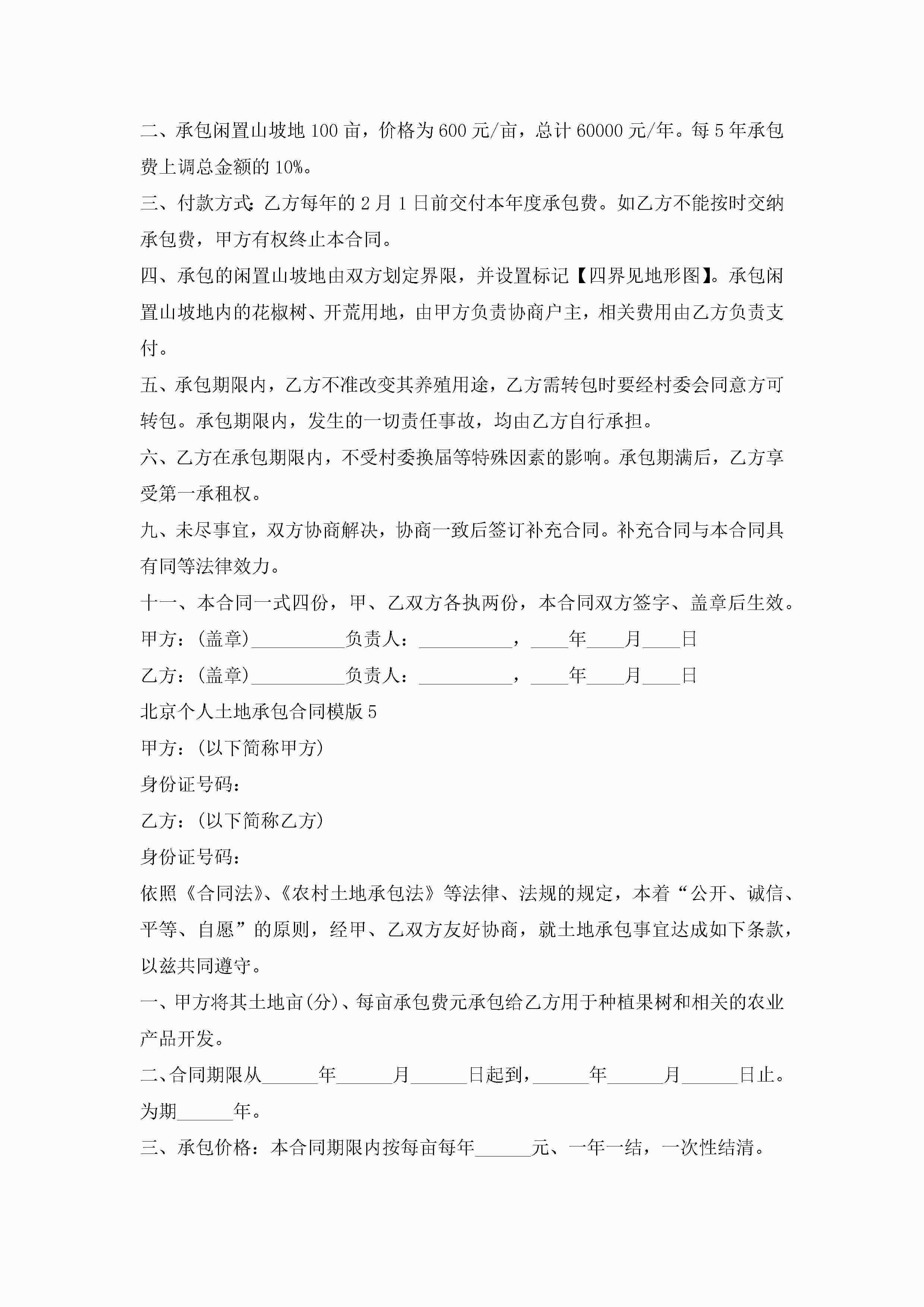 北京个人土地承包合同模版5篇jugei3月23日 01:35发布关注224 北京个人土地承包合同模版5篇此内容为付费资源,请付费后查看¥10.9 单篇文档限时特惠¥15个人会员开通企业会员开通立即下载无需登陆!可直接快捷下载单个模板付费资源© 版权声明THE ENDWord模板# 实用文档# 实用模板# 合同模板# 承包合同 如有问题,可点击最底部“联系我们”联系客服 分享QQ空间微博QQ好友海报分享复制链接收藏