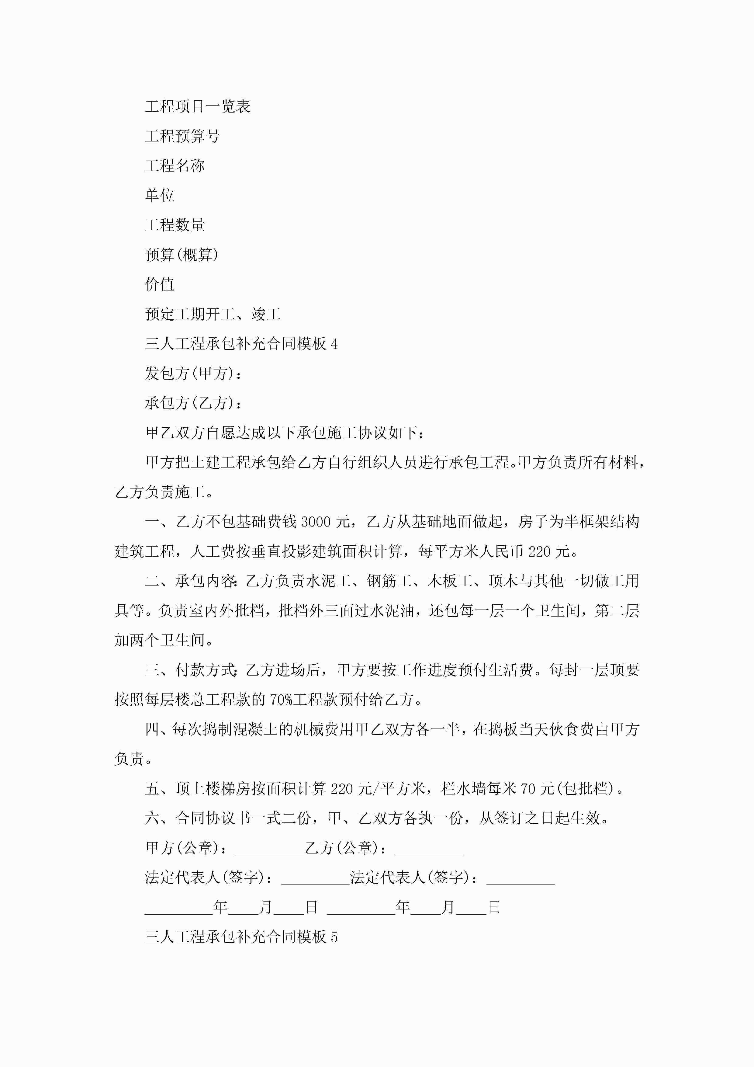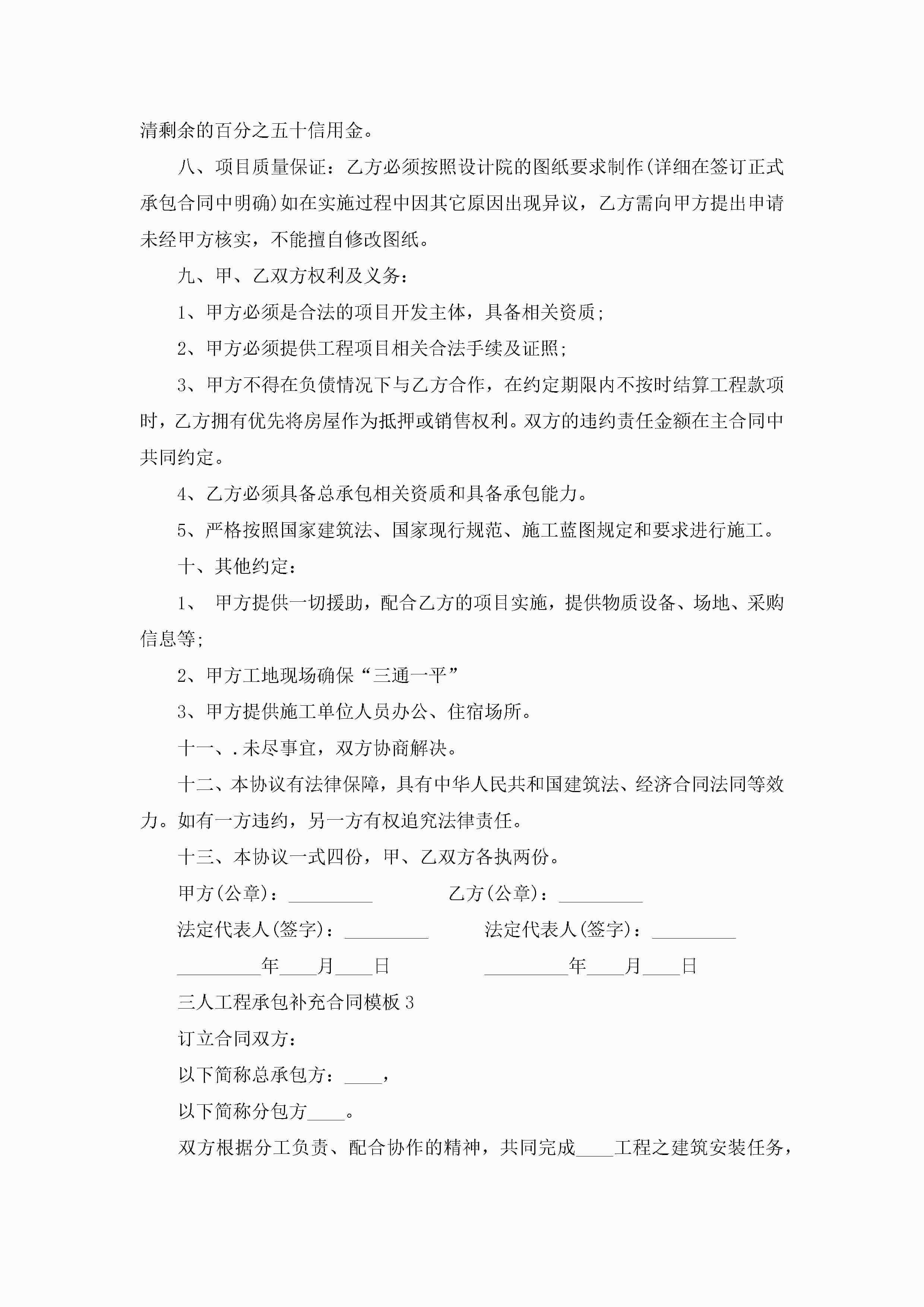 三人工程承包补充合同模板5篇jugei3月23日 01:35发布关注202 三人工程承包补充合同模板5篇此内容为付费资源,请付费后查看¥10.9 单篇文档限时特惠¥15个人会员开通企业会员开通立即下载无需登陆!可直接快捷下载单个模板付费资源© 版权声明THE ENDWord模板# 实用文档# 实用模板# 合同模板# 承包合同 如有问题,可点击最底部“联系我们”联系客服 分享QQ空间微博QQ好友海报分享复制链接收藏